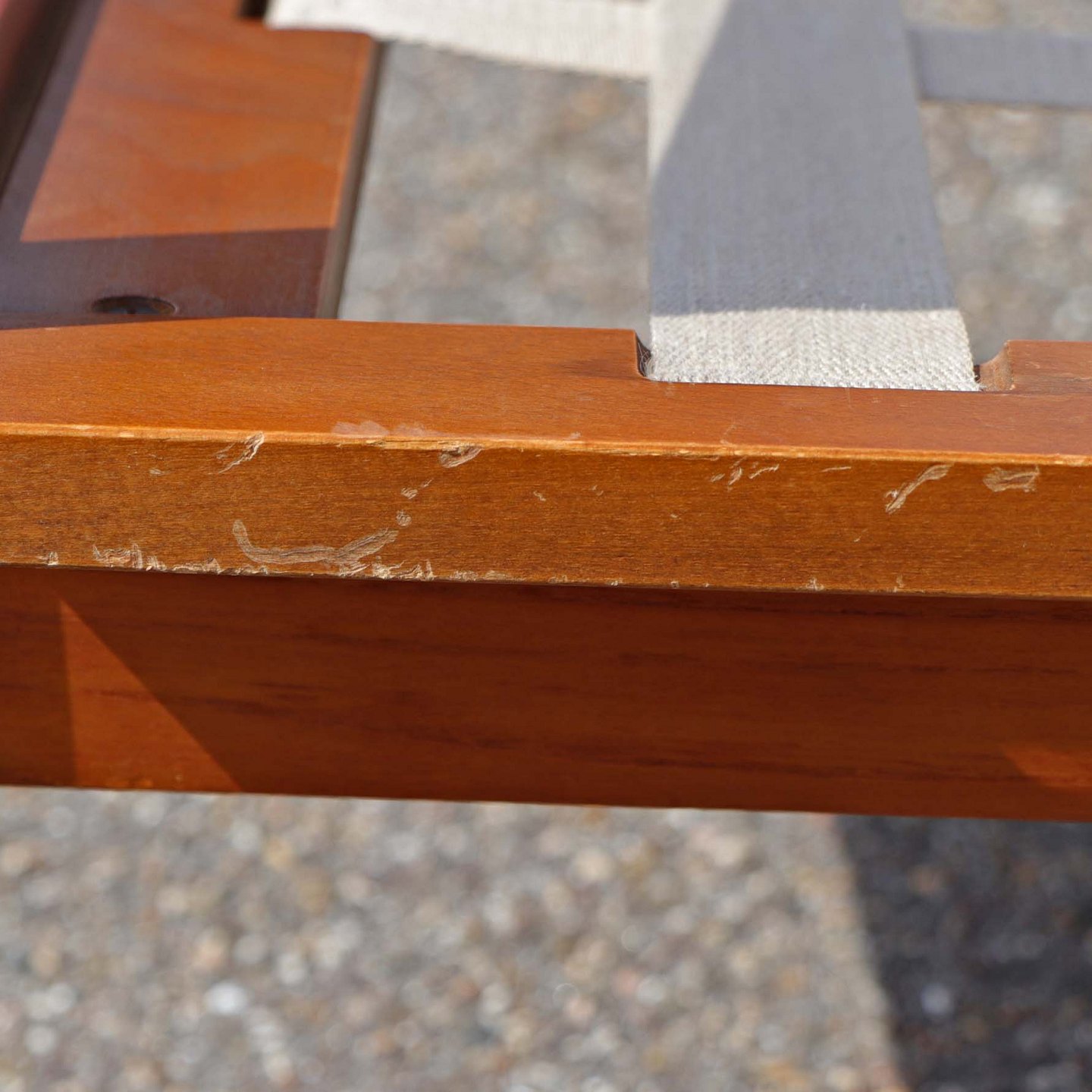 Fremstår med brugsspor på stellet samt minimalt afslag ved et armlæn. Lettere spor efter brug på stof.