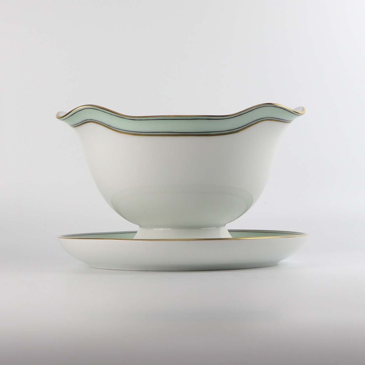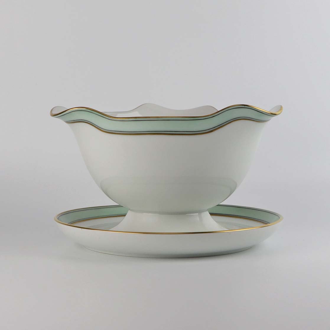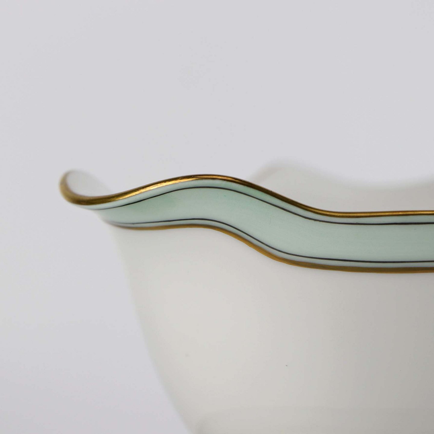 Service i glat hvidt porcelæn med mintblå dekoration og dobbelte guldkanter