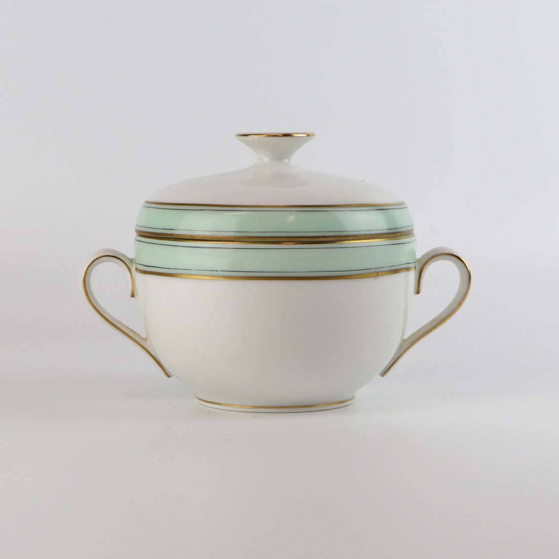 Service i glat hvidt porcelæn med mintblå dekoration og dobbelte guldkanter