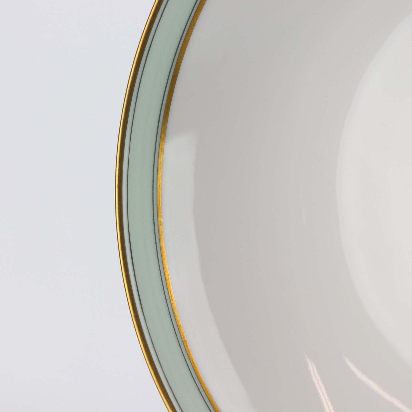 Service i glat hvidt porcelæn med mintblå dekoration og dobbelte guldkanter