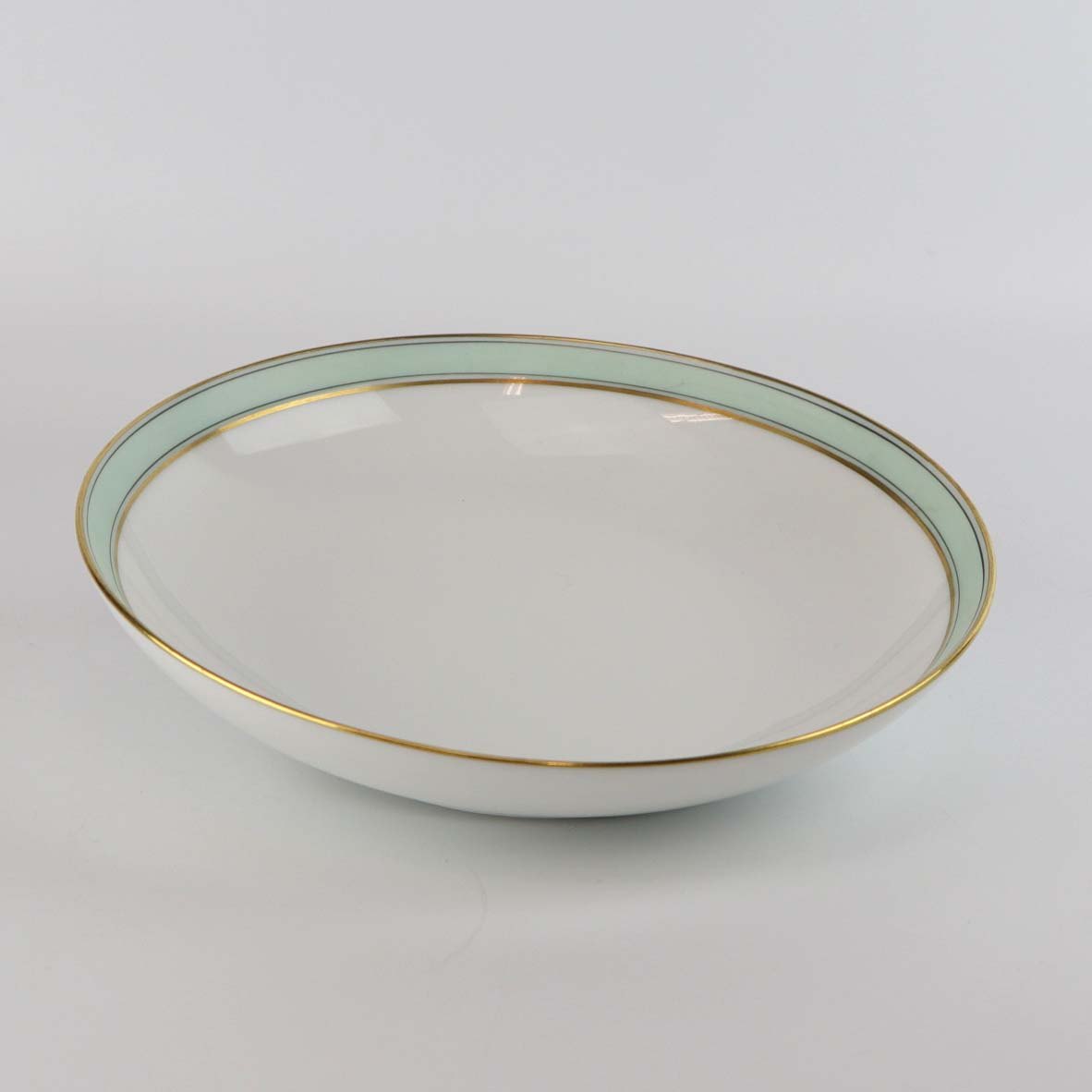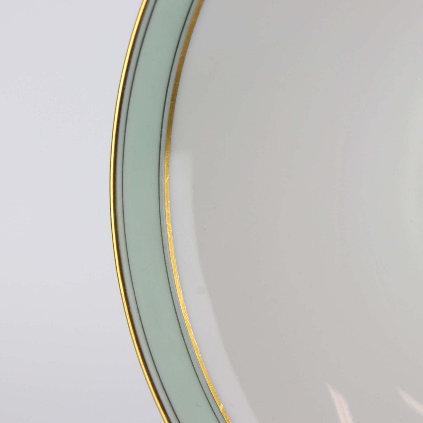 Service i glat hvidt porcelæn med mintblå dekoration og dobbelte guldkanter