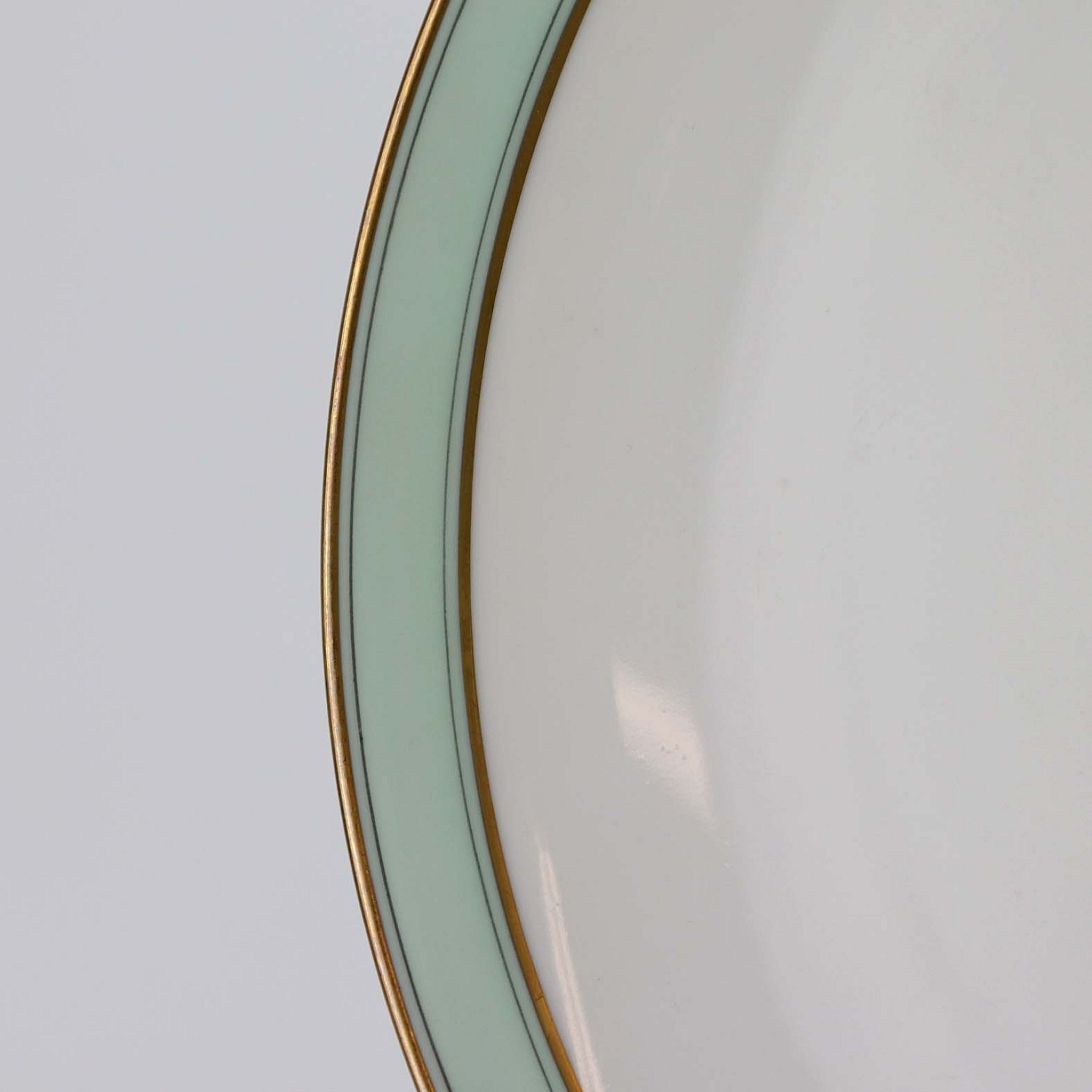 Service i glat hvidt porcelæn med mintblå dekoration og dobbelte guldkanter