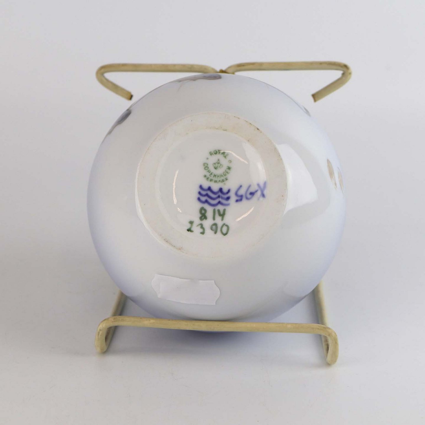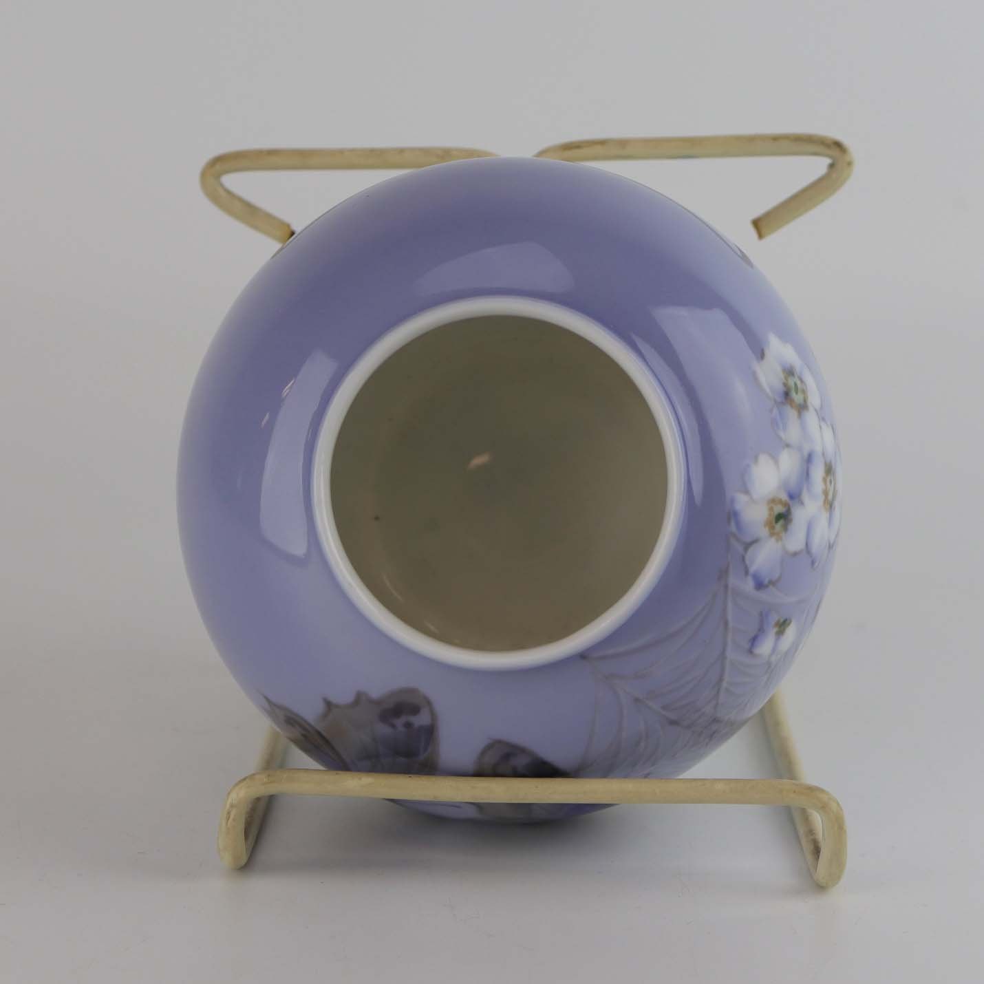 Kongelig kugleformet vase i porcelæn i graduerede blå nuancer med motiv af sommerfugle, edderkoppespind og hvide blomster nr. 814/2390