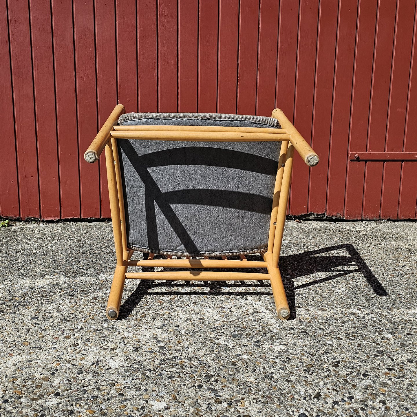Stol med stel af bøgetræ. Sæde og ryglæn betrukket med lys gråt stof. Ryghynden er aftagelig. Model nr. J147