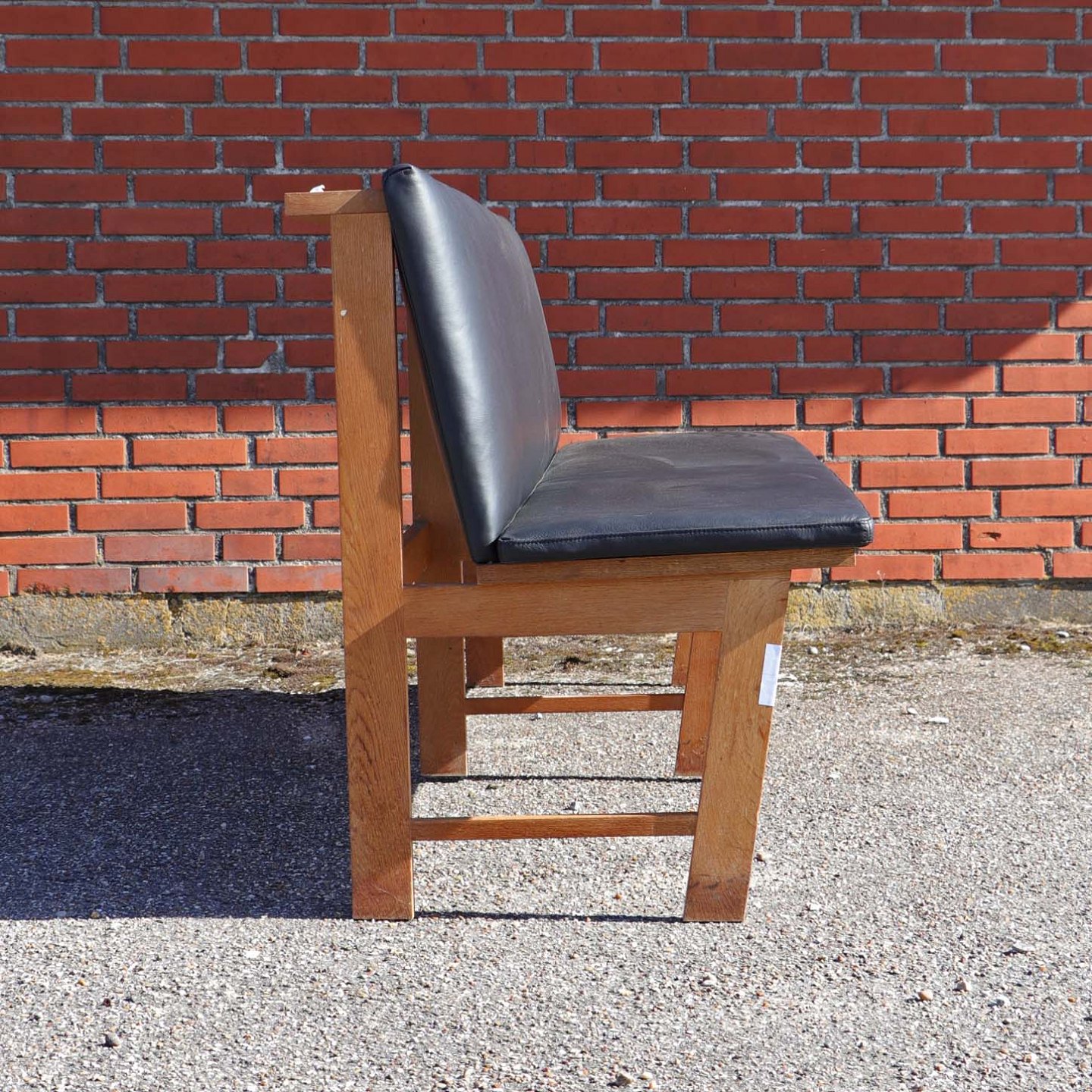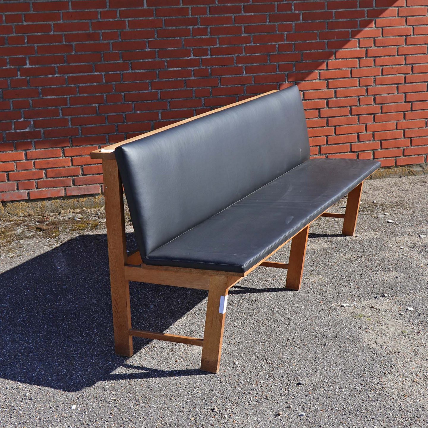 Lang bænk i kirkebænk stilen fremstillet i lakeret egetræ. Bænken har ny polstret ryg samt løs ny polstret sædehynde i sort læder.