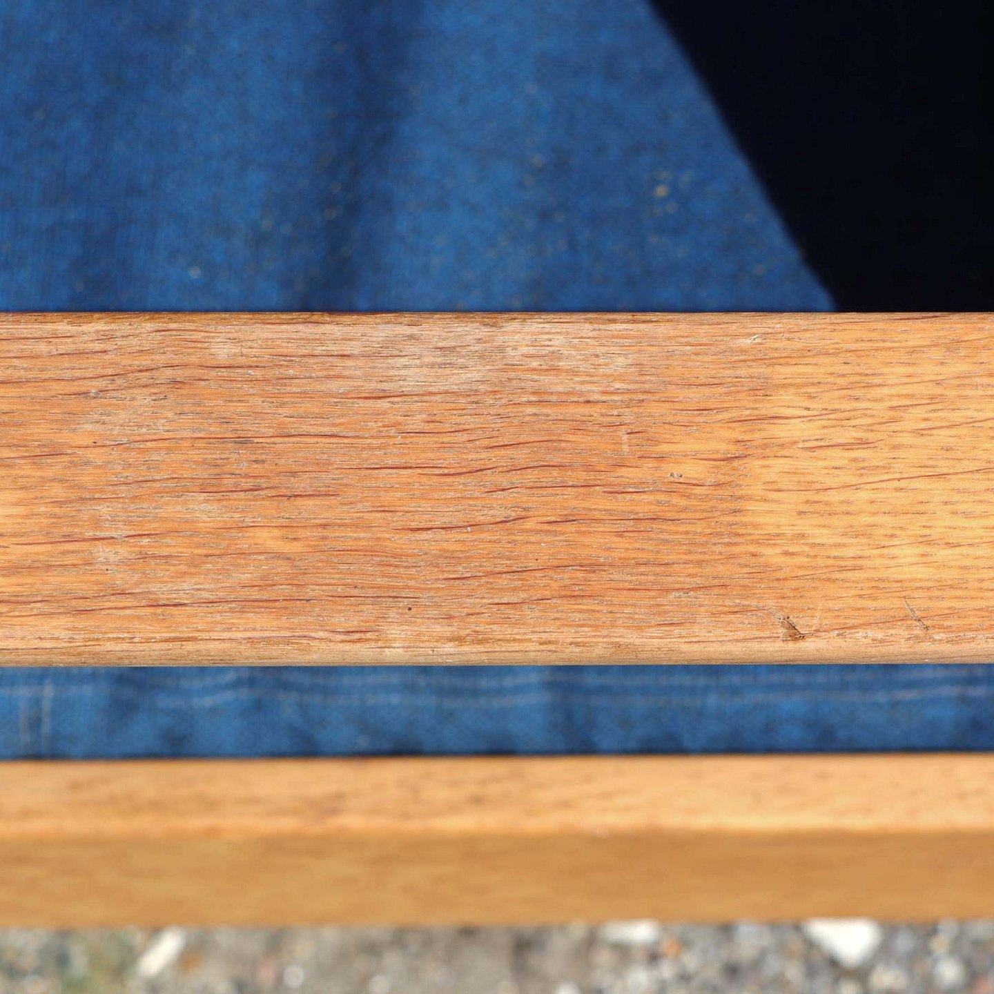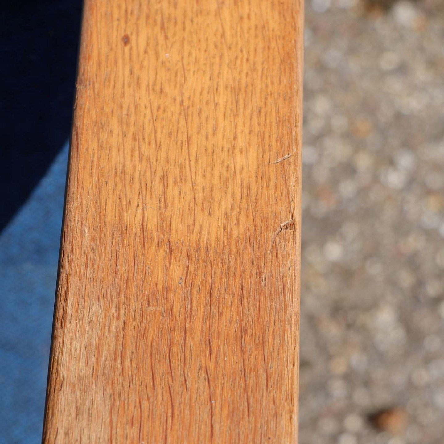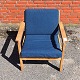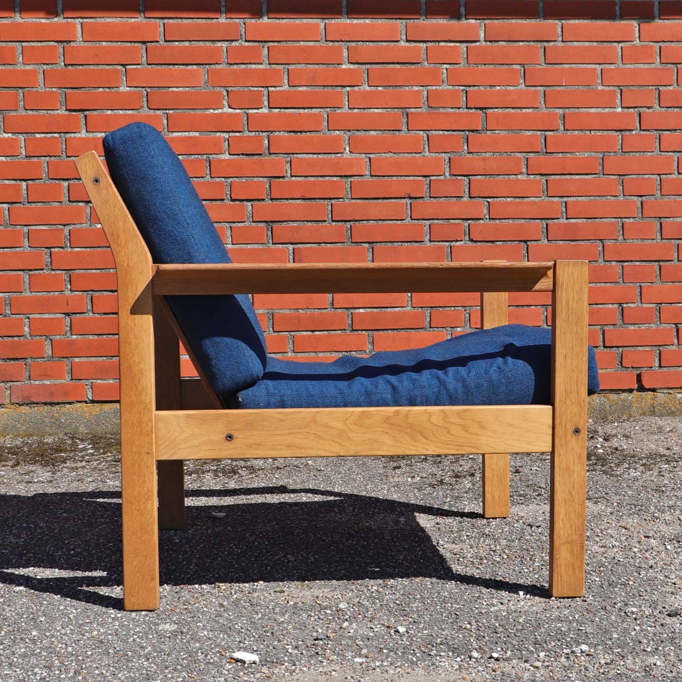 Lænestol med stel i lakeret egetræ og hynder betrukket med blåmeleret uldstof. Stolen har ingen gjorder, men disse kan laves mod merpris.