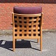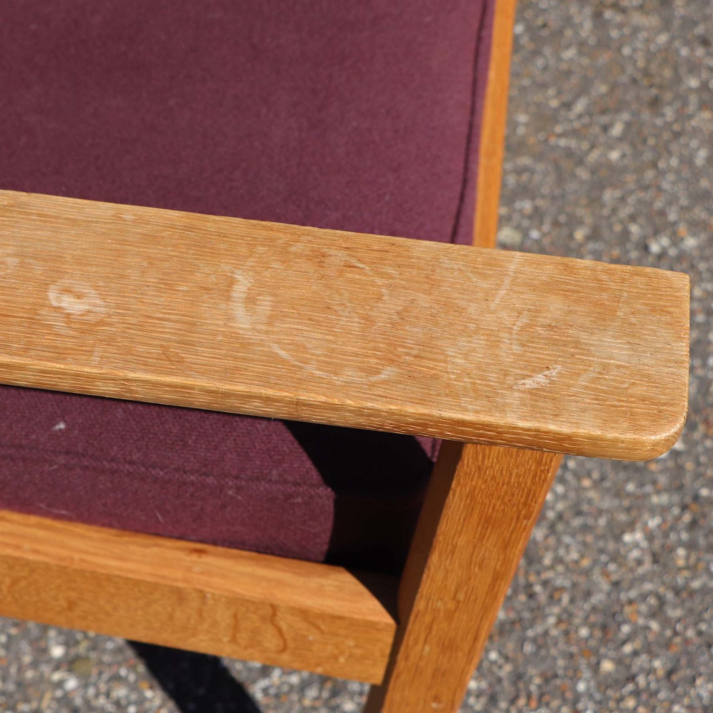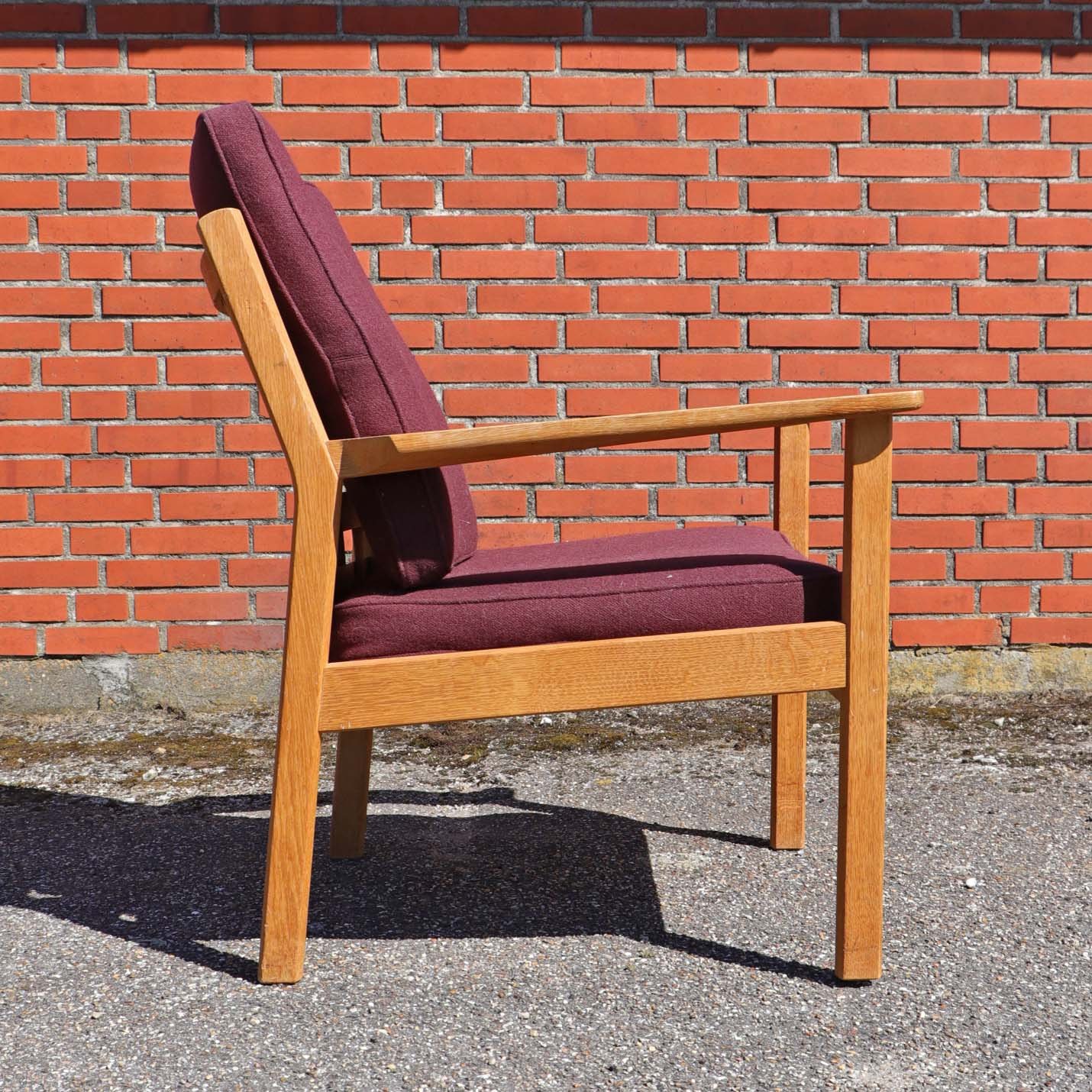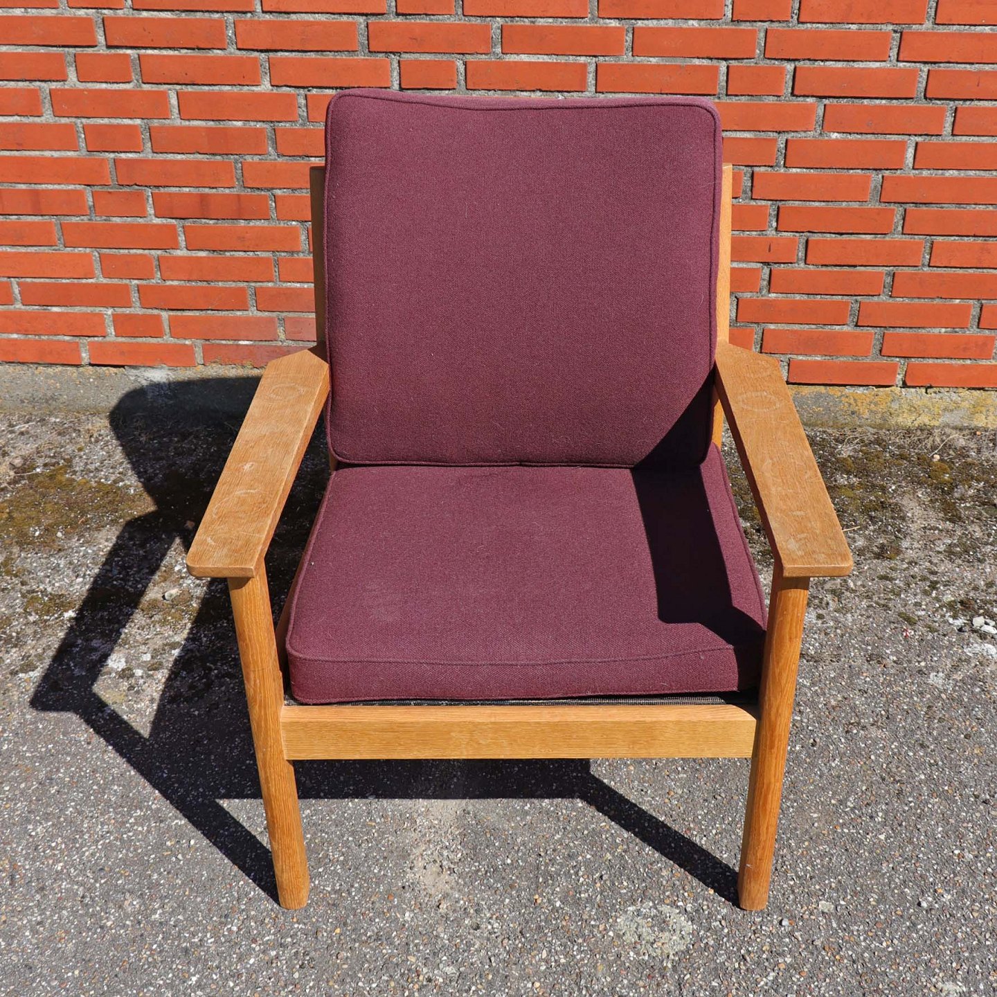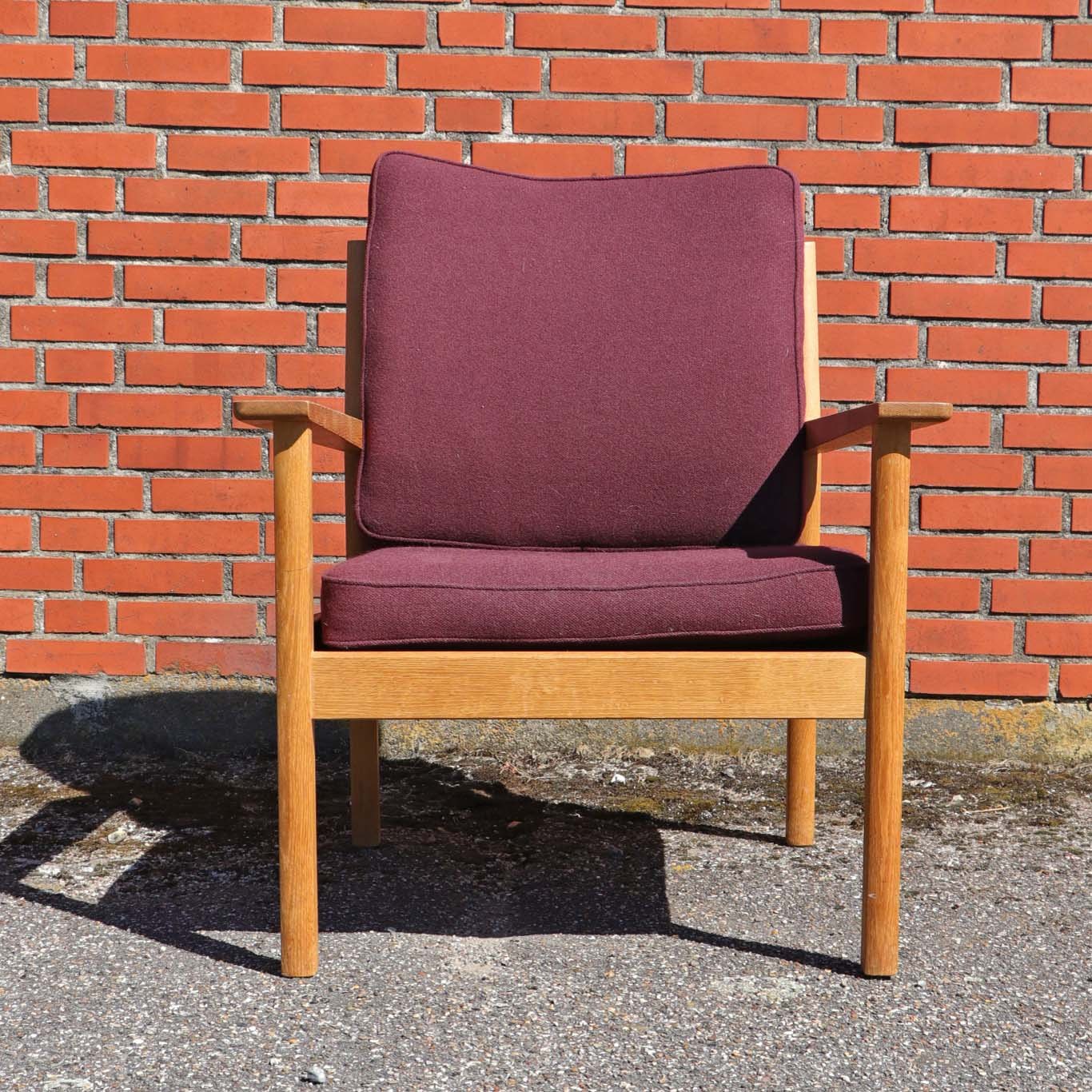 Lænestol med stel i lakeret egetræ med hynder betrukket i bordeaux rød uldstof