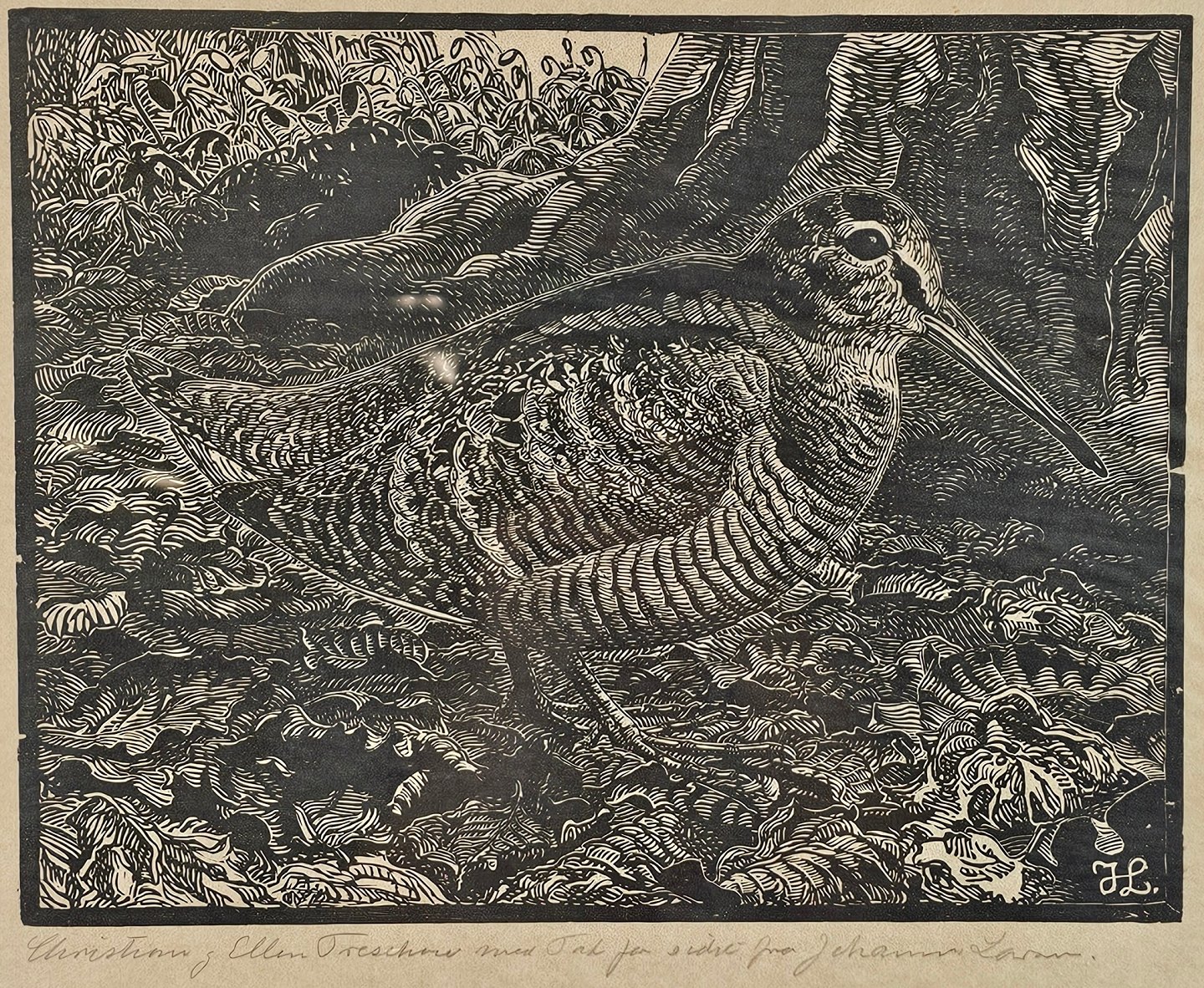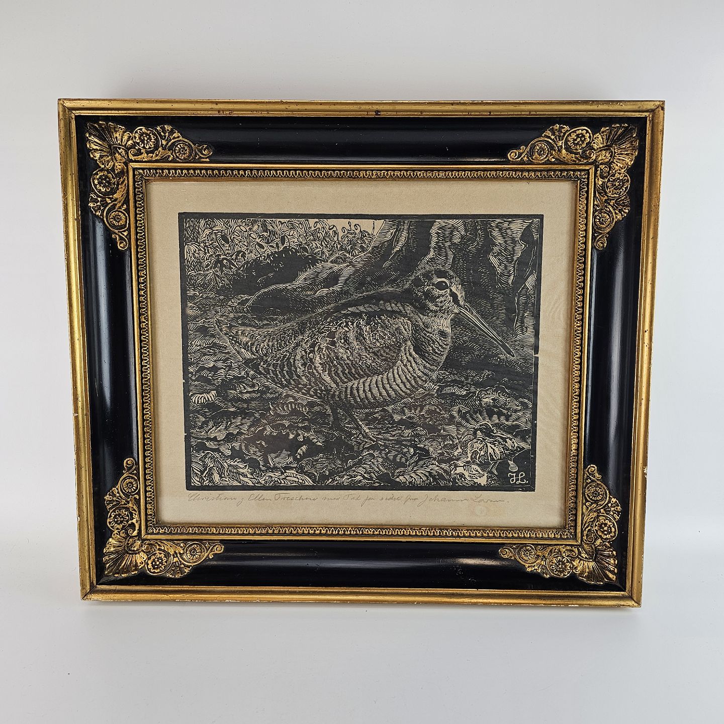 Tryk på papir med motiv af en skovsneppe i sort og hvidt