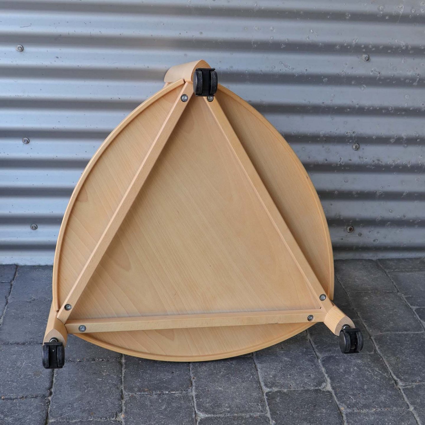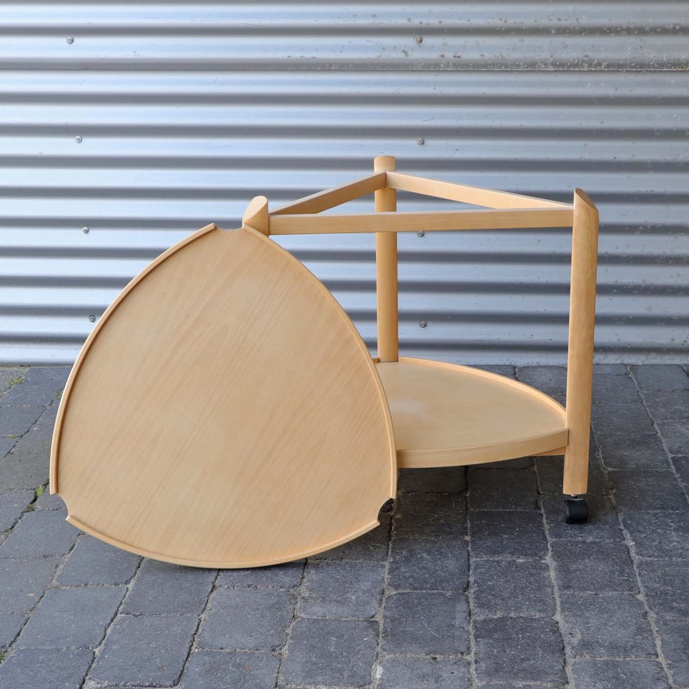 Trekantet bakkebord i lakeret bøgetræ med aftagelig topplade og sorte hjul i plast