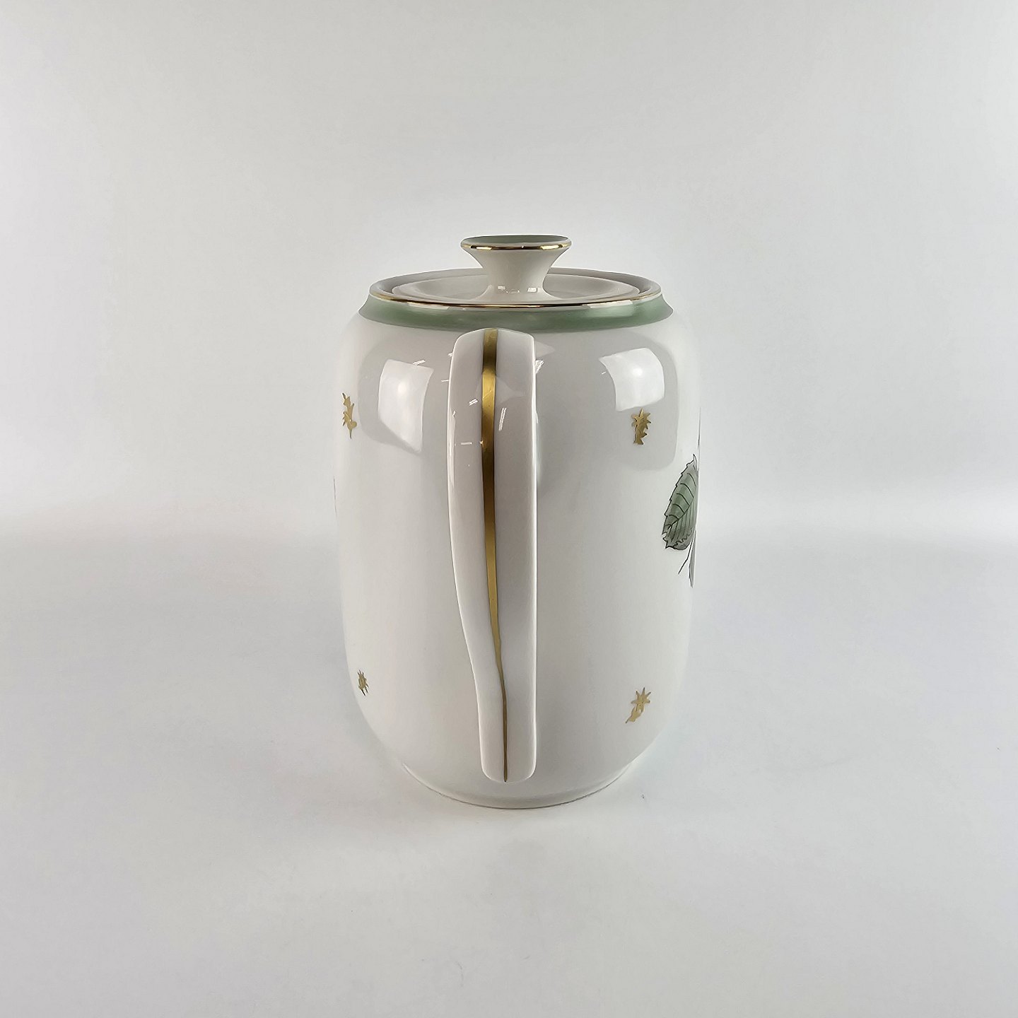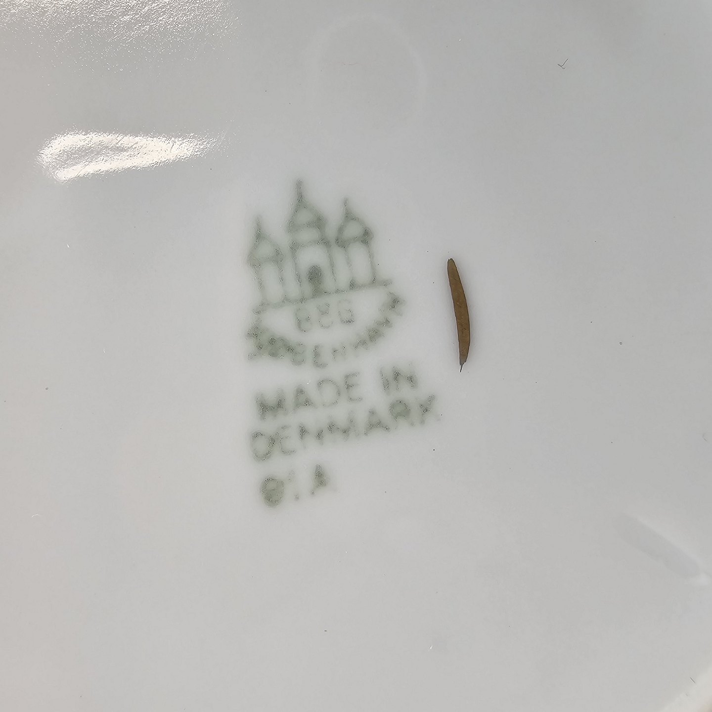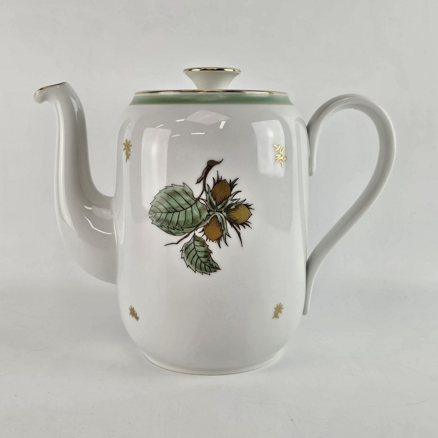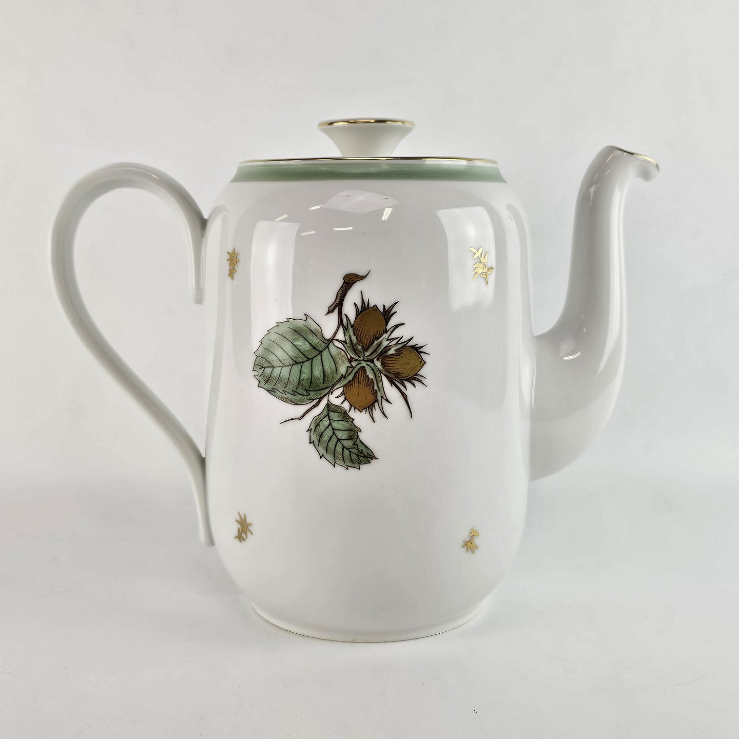 Hasselnød er hvidt porcelæn dekoreret med guldfarvet nødder, grønne blade samt et lys grønt bånd og guldkant. Brugsspor kan forekomme