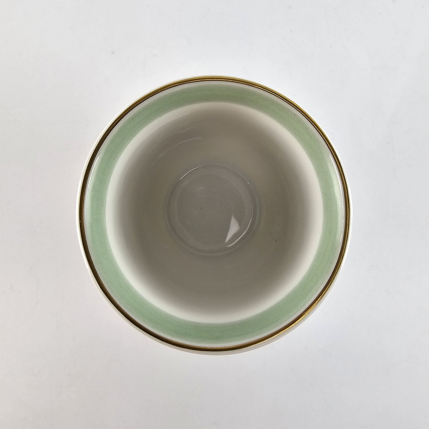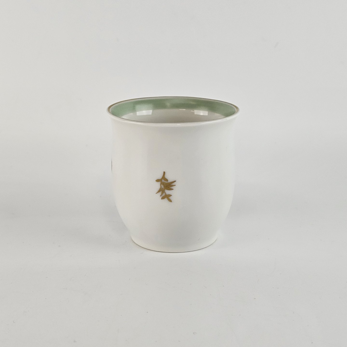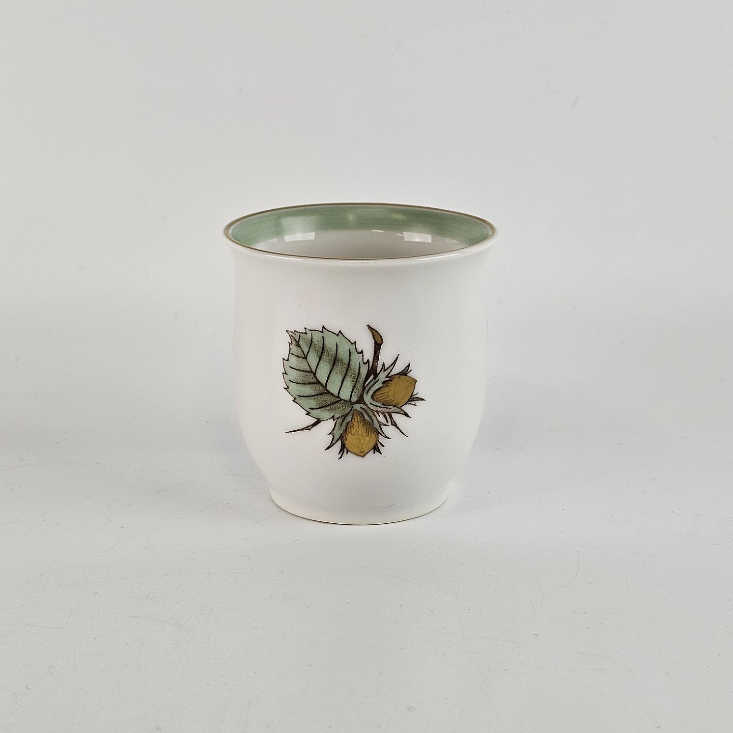Hasselnød er hvidt porcelæn dekoreret med guldfarvet nødder, grønne blade samt et lys grønt bånd og guldkant. Brugsspor kan forekomme