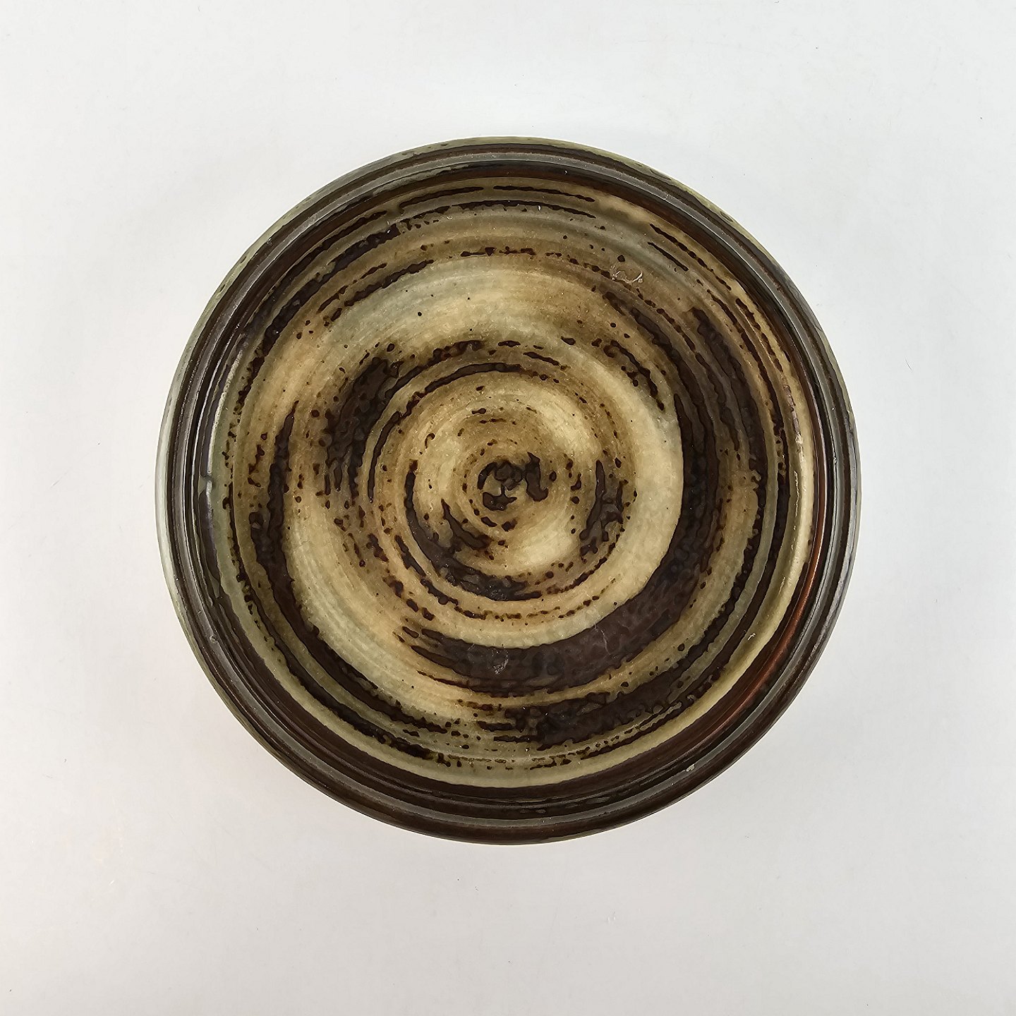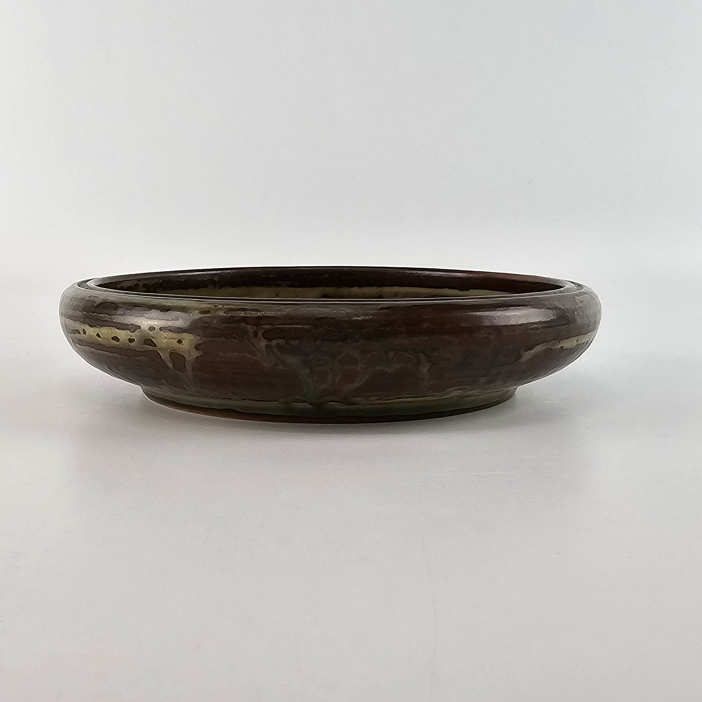 Skål af stentøj med grå og brunlig glasur. Nr. 21823