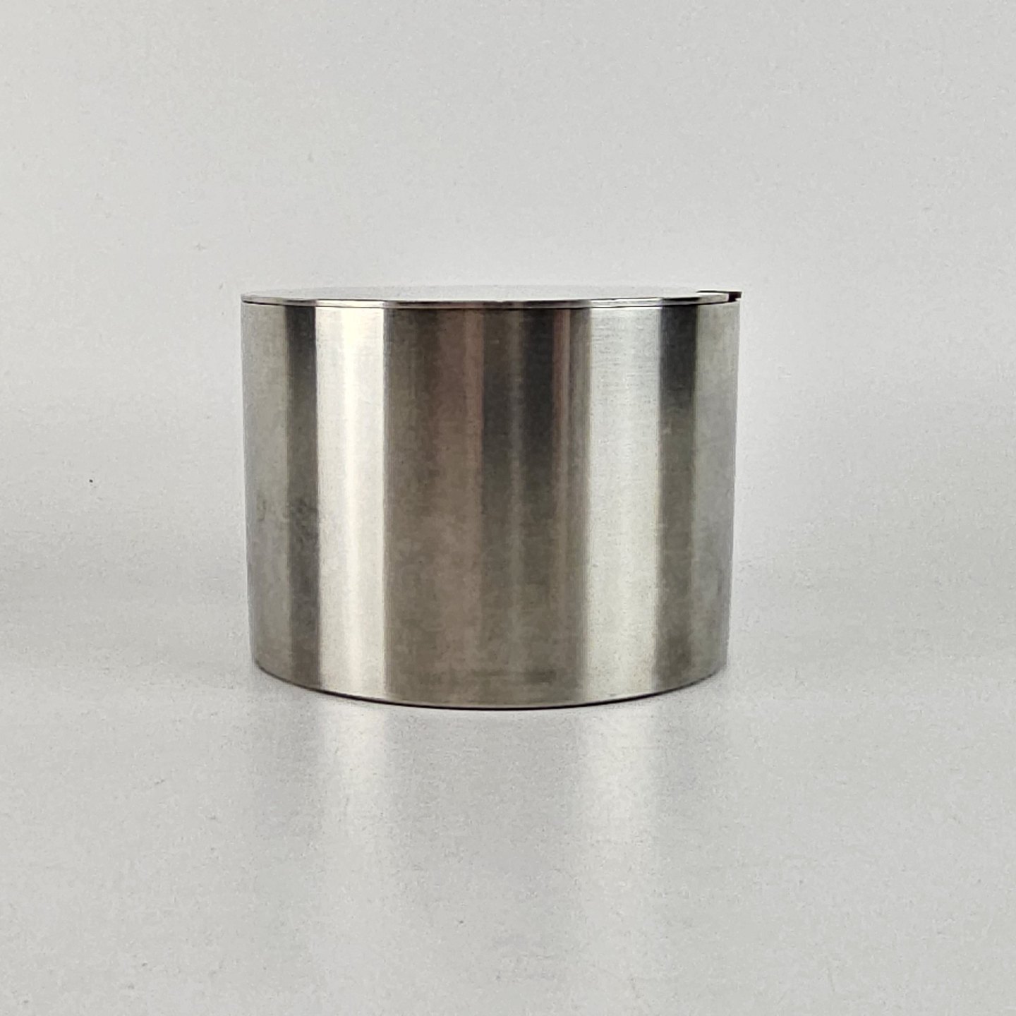 Skål og låg i rustfrit stål. I låget er der hul til ske. Fra serien Cylinda-line