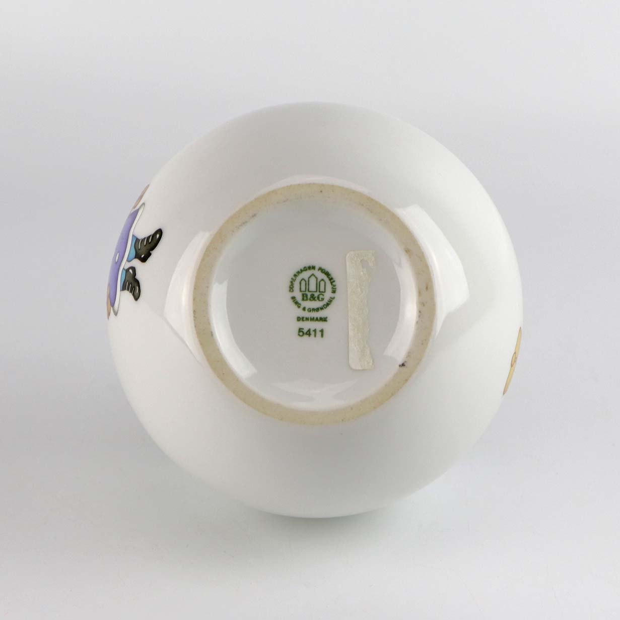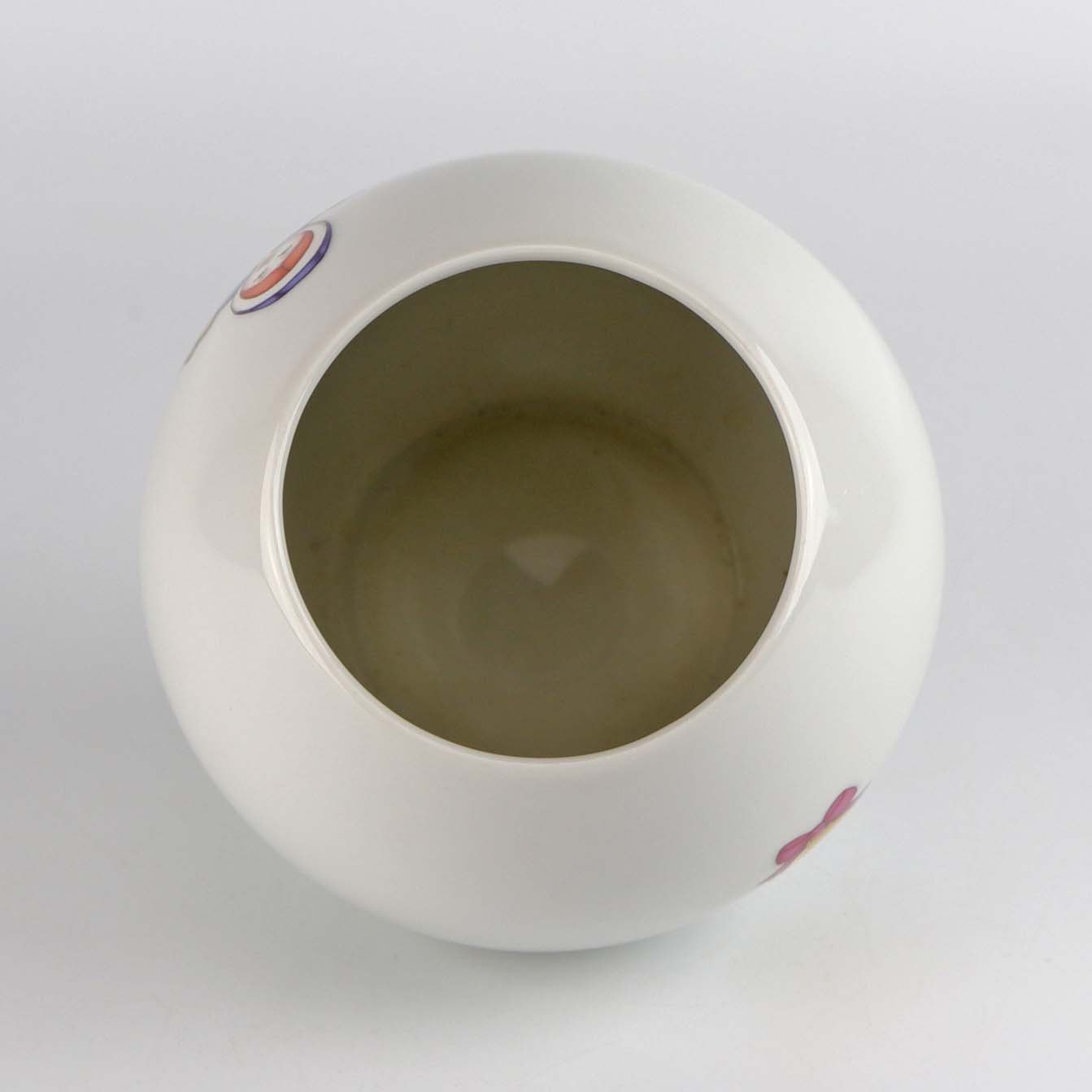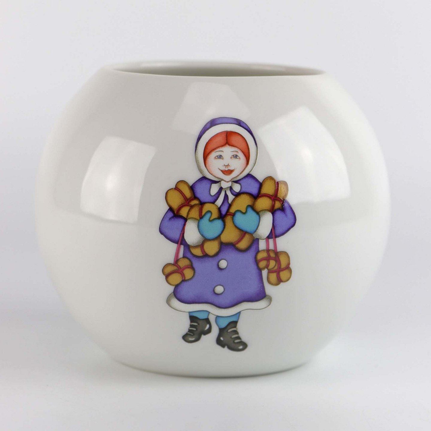 Kuglevase i porcelæn med motiv af vinterklædt pige med pakker samt juleklokke med rød sløjfe på bagsiden. Nr. 5411