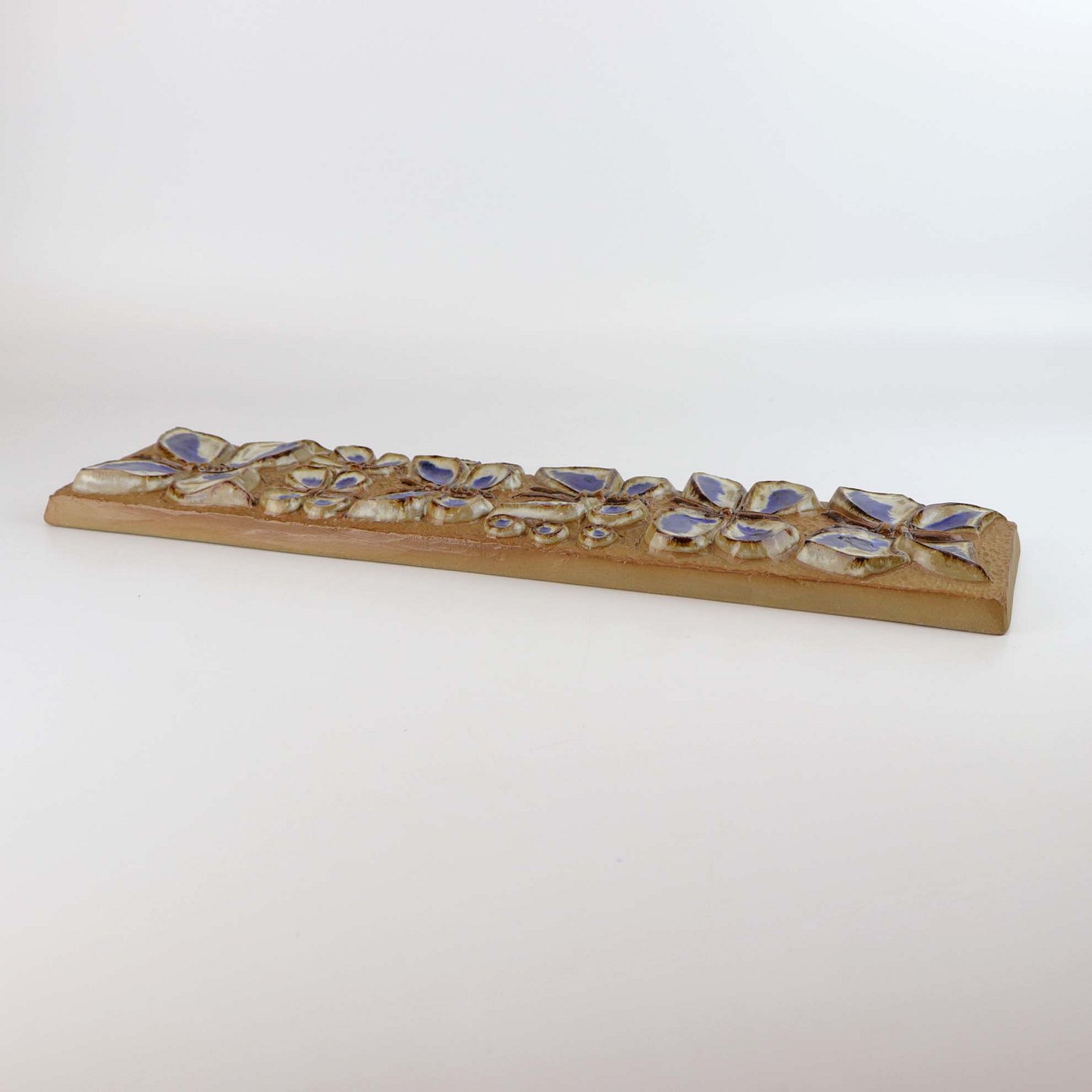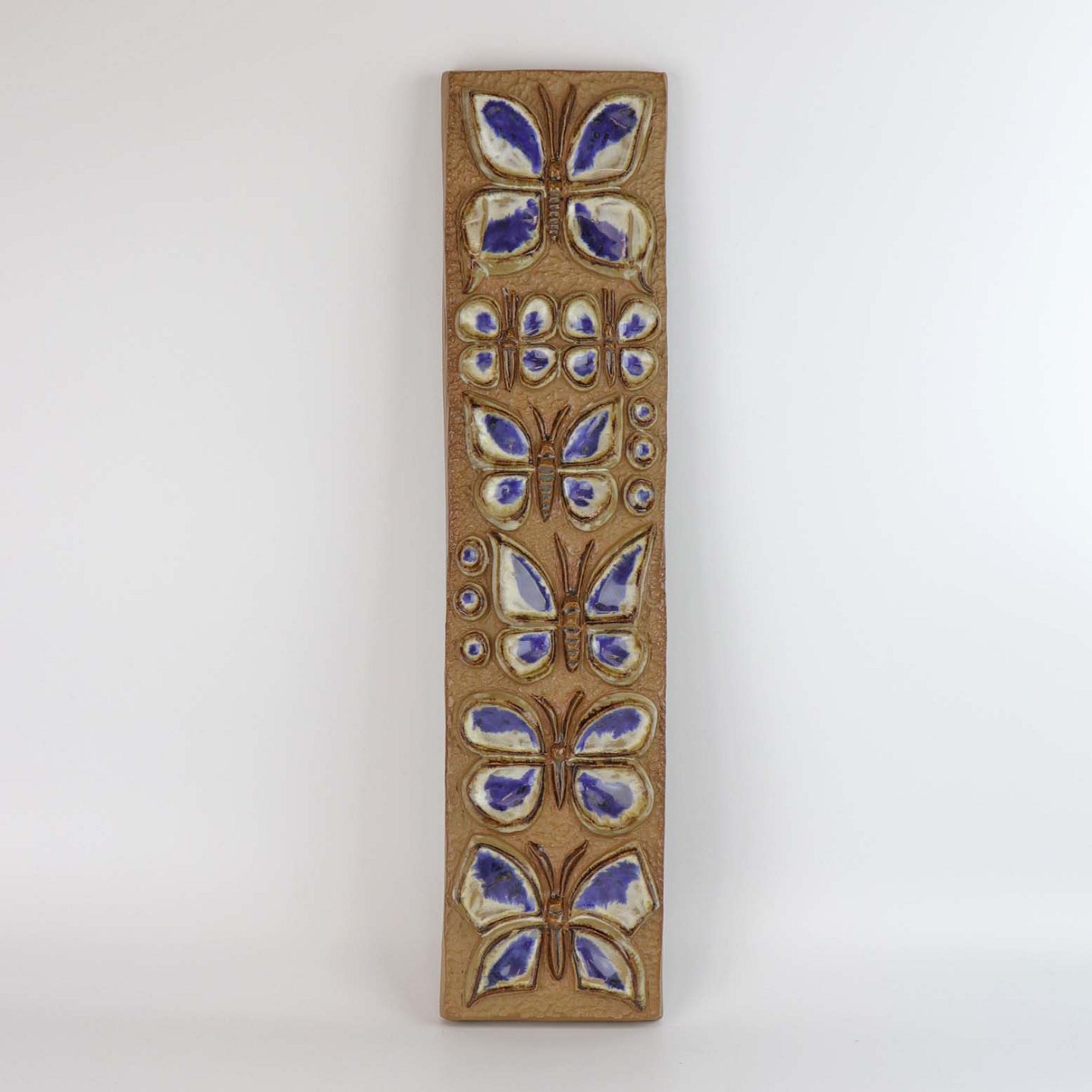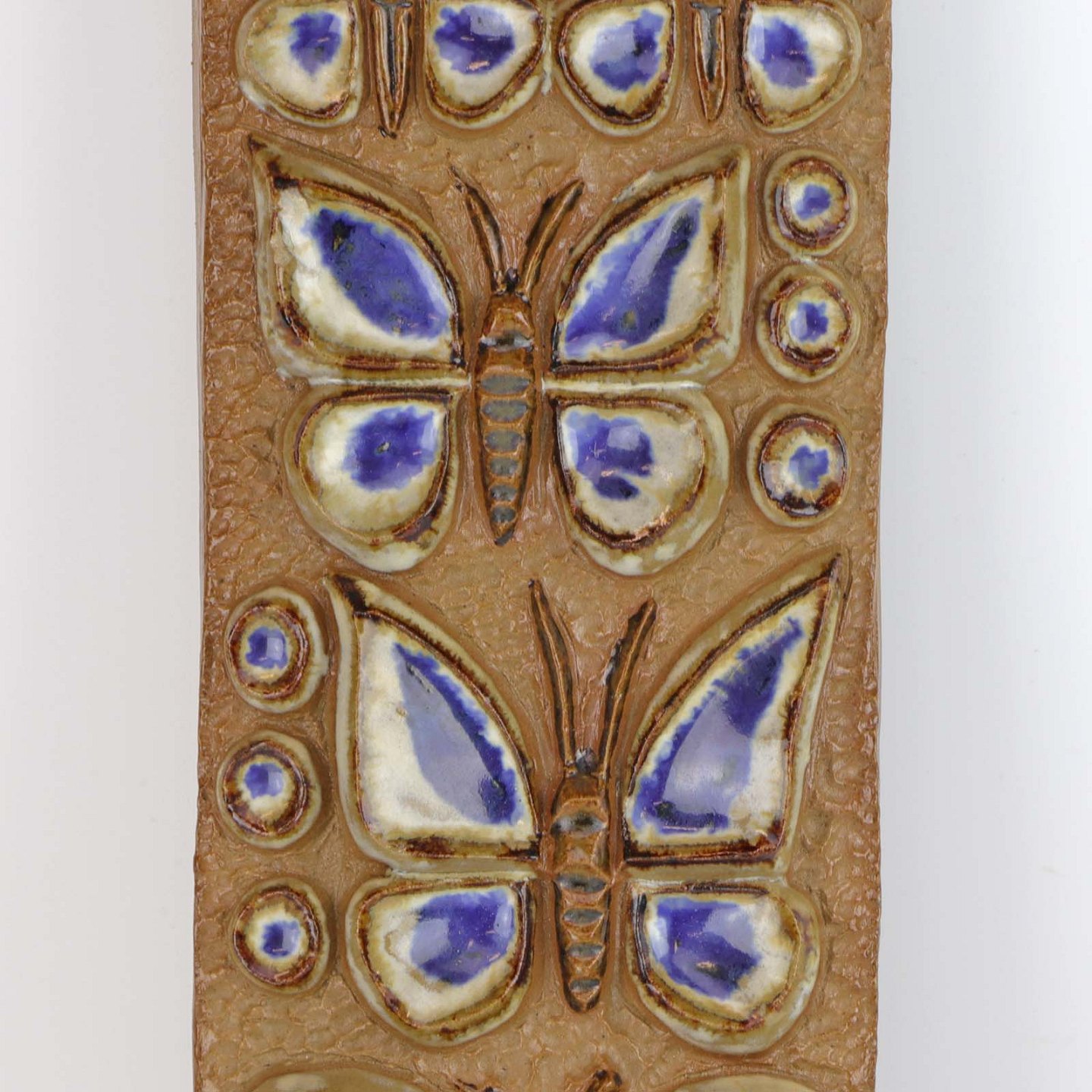 Relief i keramik med motiv af sommerfugle dekoreret med blå og hvid glasur på baggrund af rå keramik. Nr. 6317