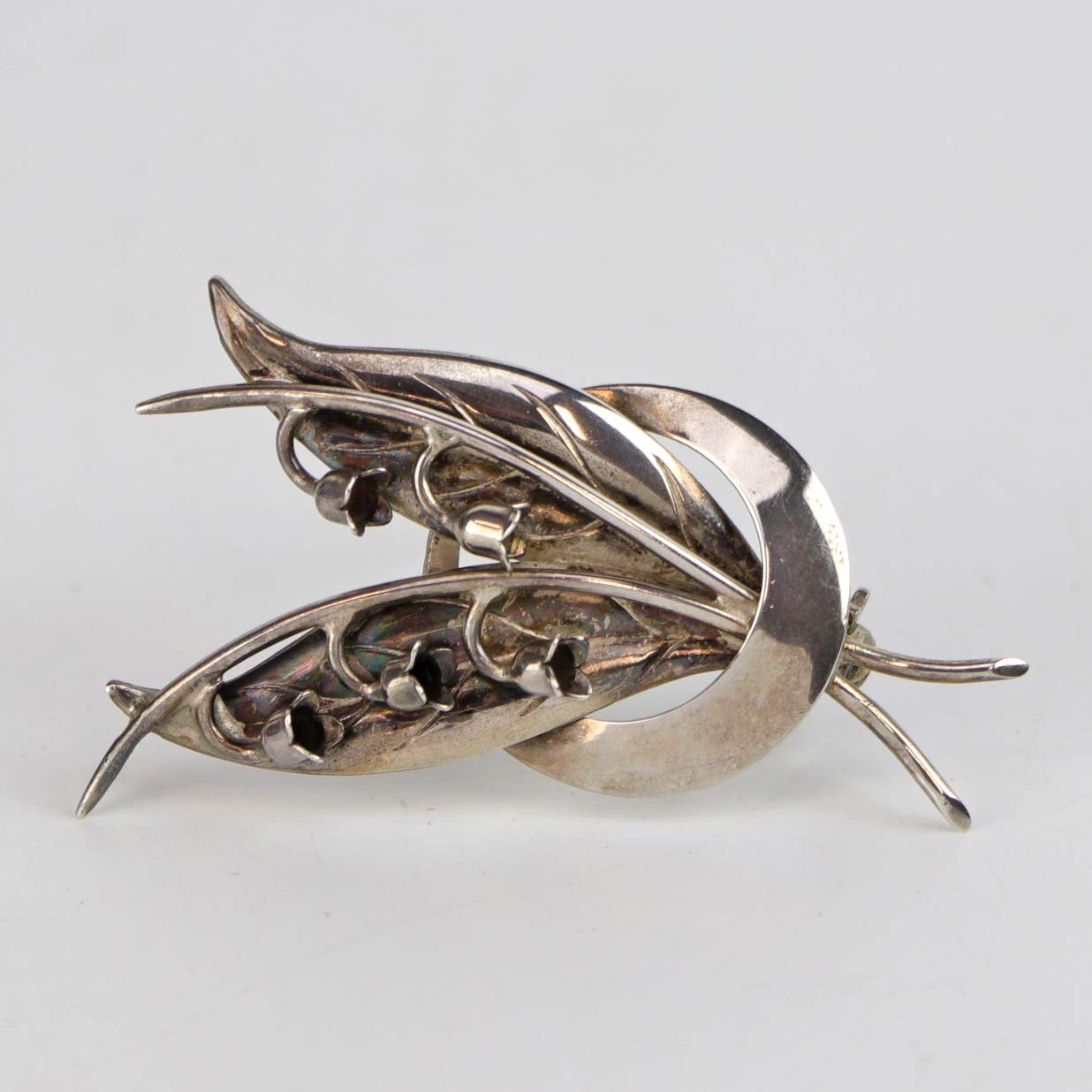 Broche i 830 sølv med motiv af liljekonvaller med blade