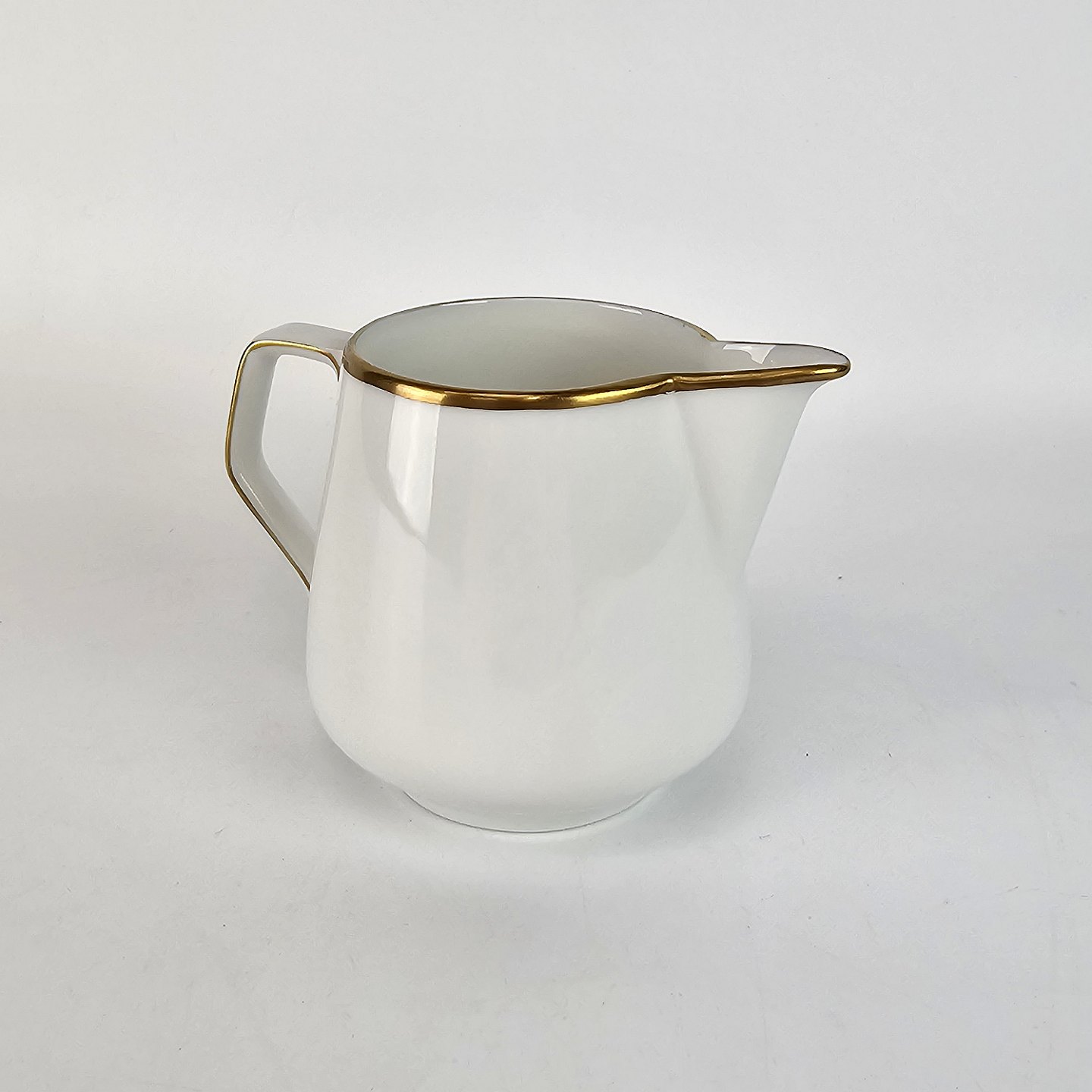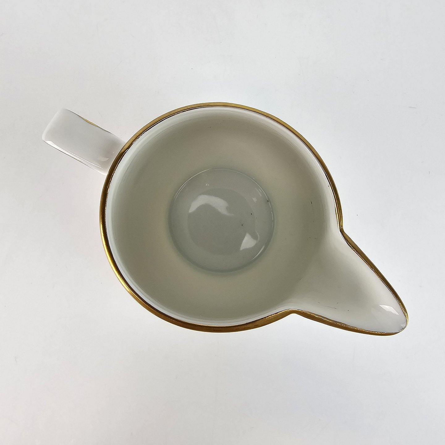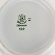 Vega er hvidt porcelæn med guldkant. Tallerkener og fade er dekoreret med riller i kanten. Kan fremstår med brugsspor