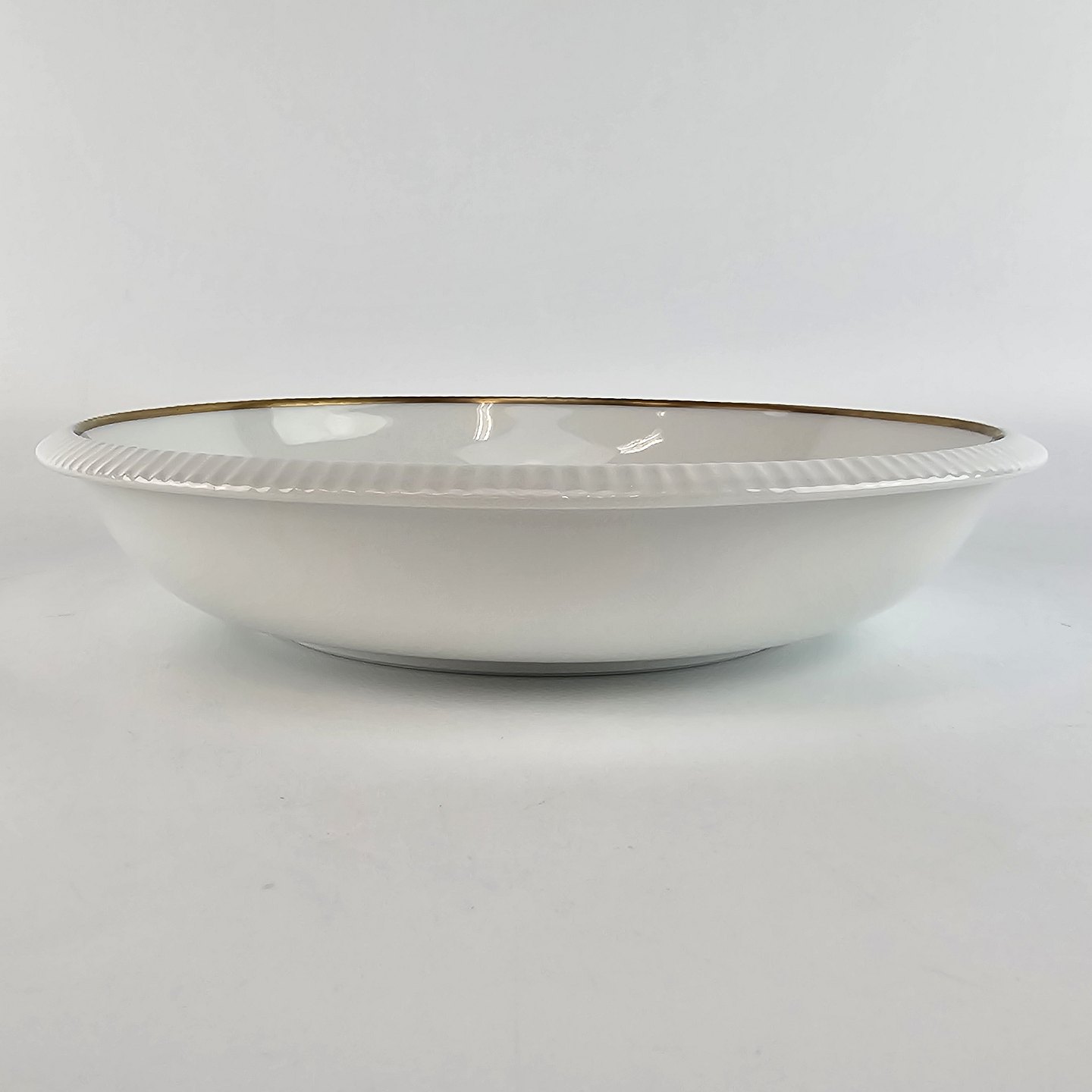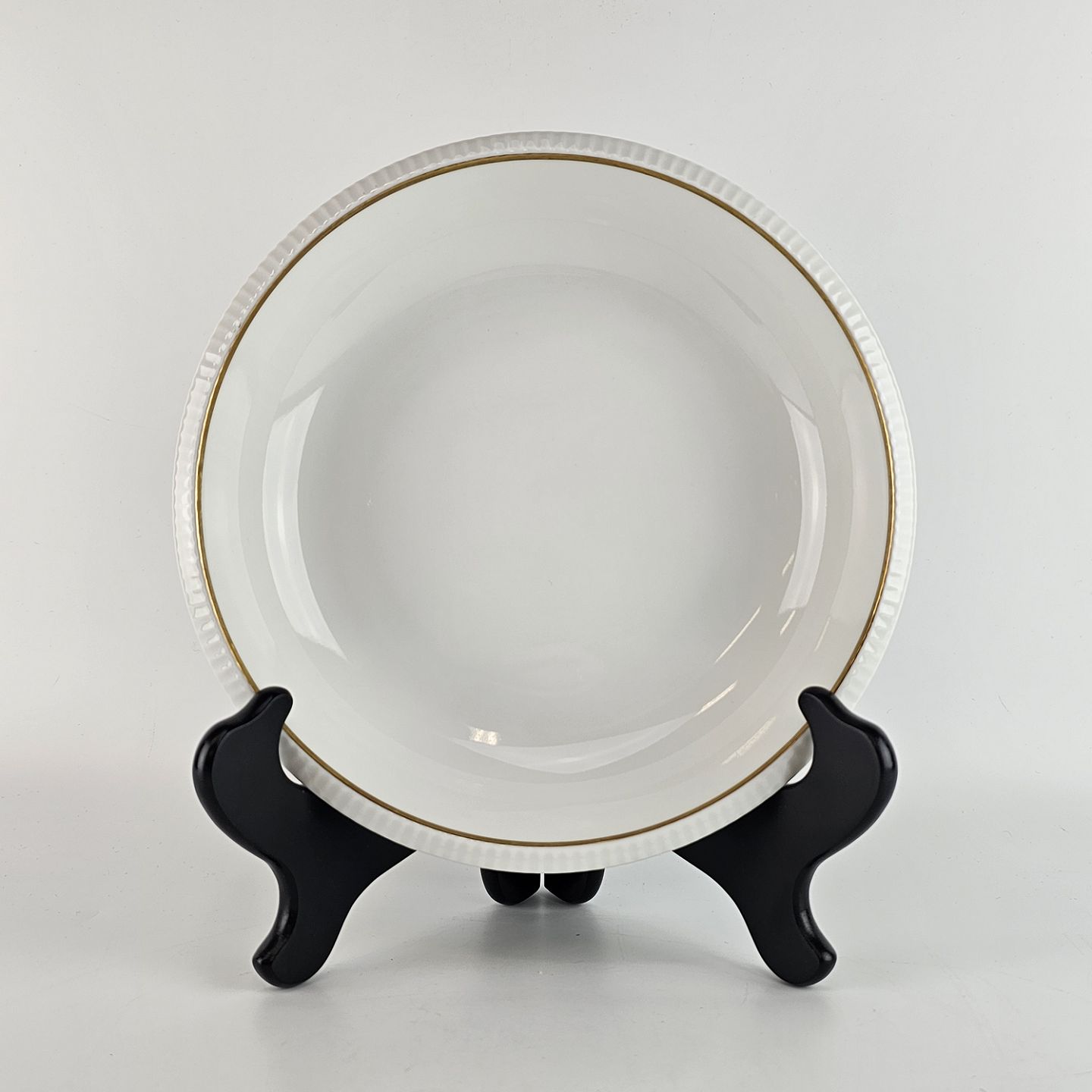 Vega er hvidt porcelæn med guldkant. Tallerkener og fade er dekoreret med riller i kanten. Kan fremstår med brugsspor