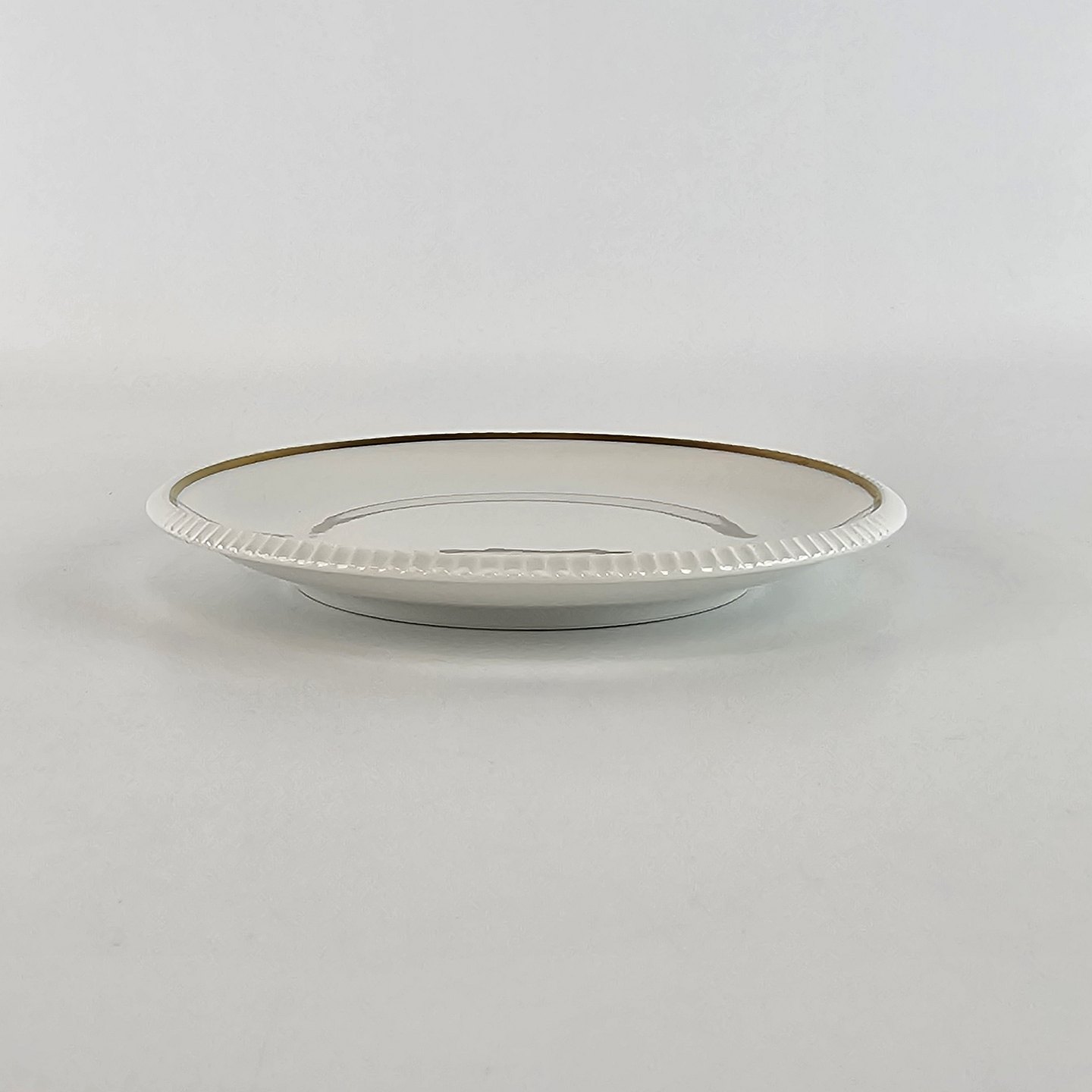 Vega er hvidt porcelæn med guldkant. Tallerkener og fade er dekoreret med riller i kanten. Kan fremstår med brugsspor