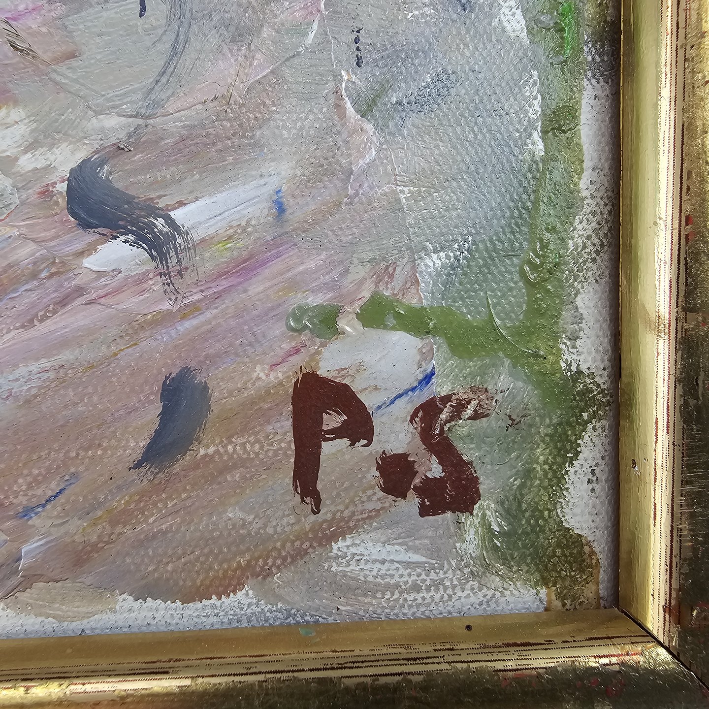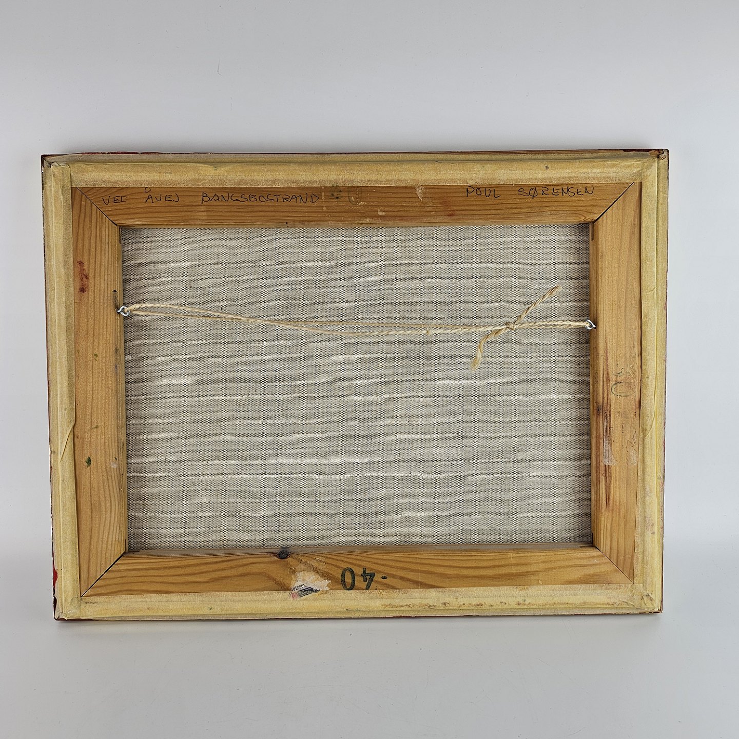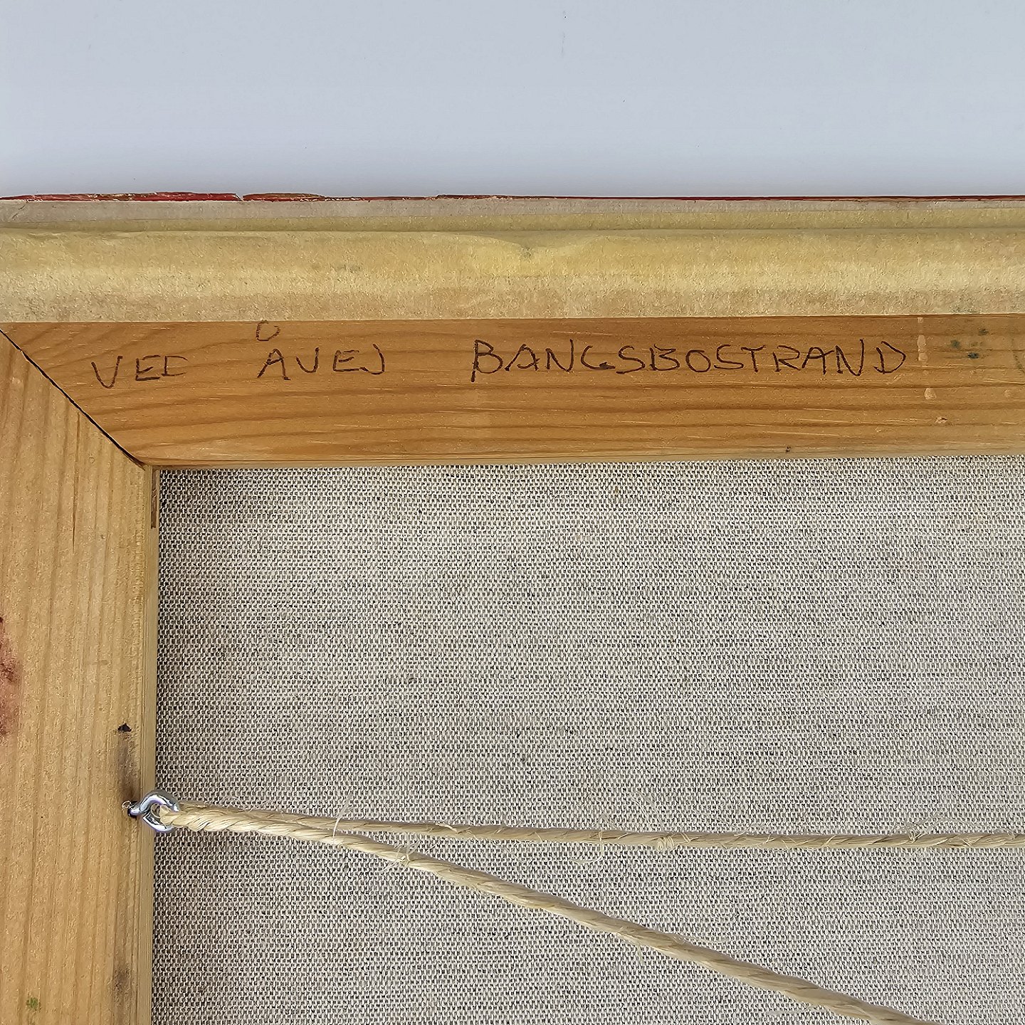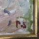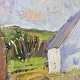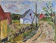 Oliemaleri på lærred. Landsbybillede med motiv af huse med titlen Ved Åvej Bangsbostrand