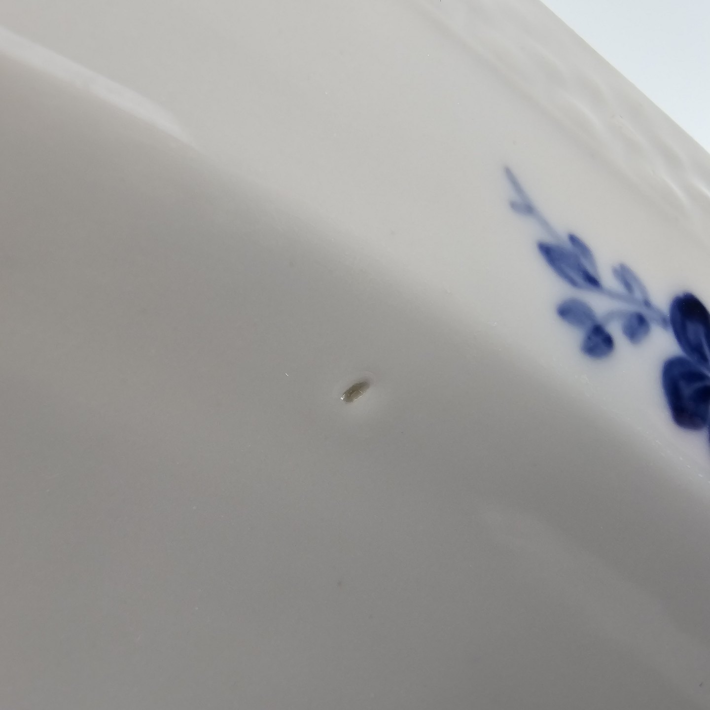 Blå blomst flettet er et hvidt stel med et flettet mønster i kanten og med motiver af blå blomster. Lettere brugsspor kan forekomme.