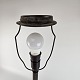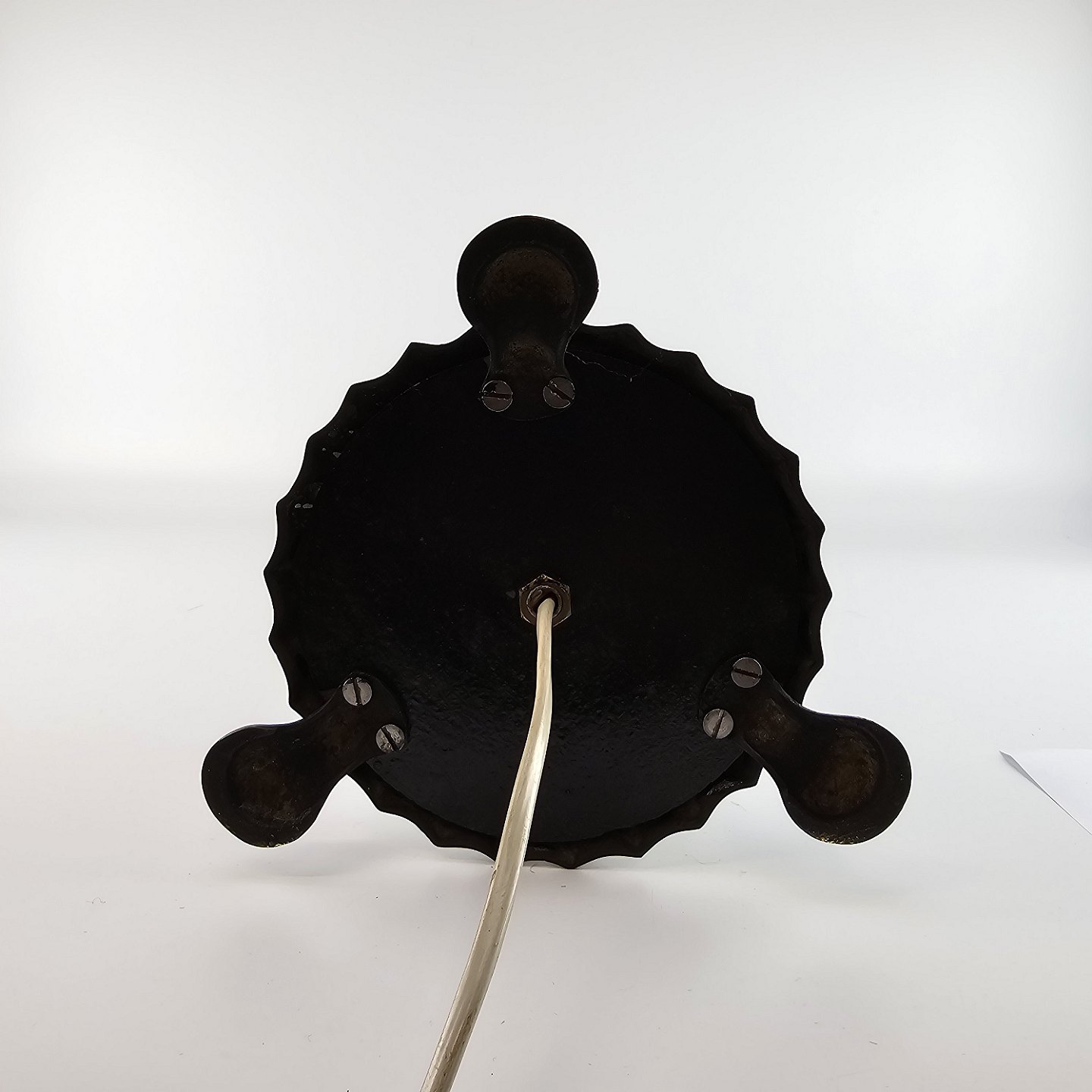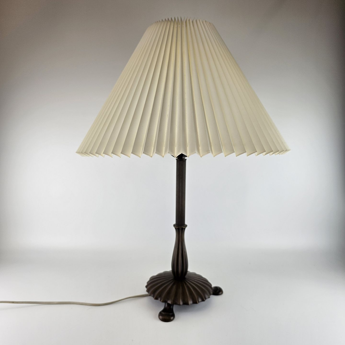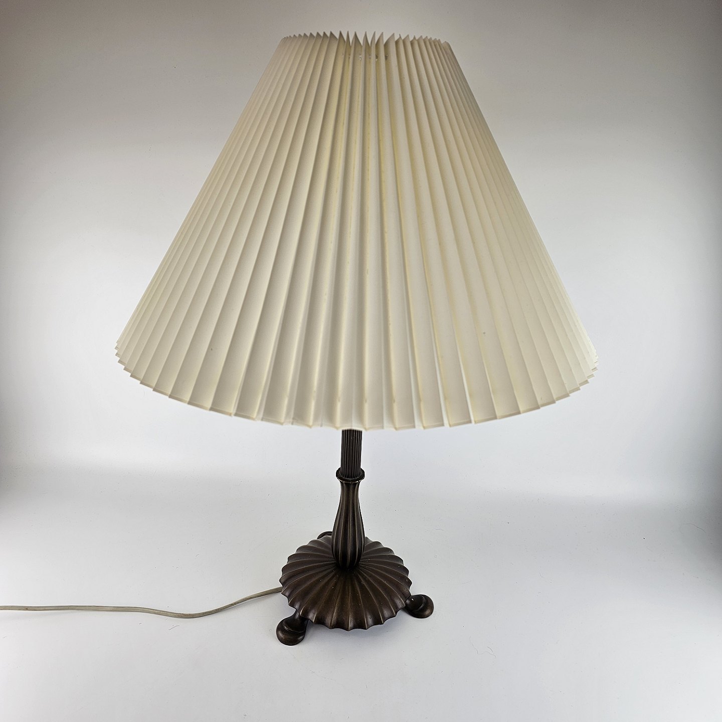 Bordlampe med plisseret hvid skærm. Lampen er af jern og står på tre fødder
