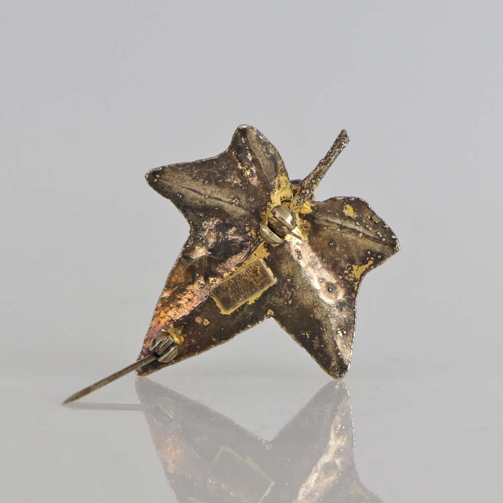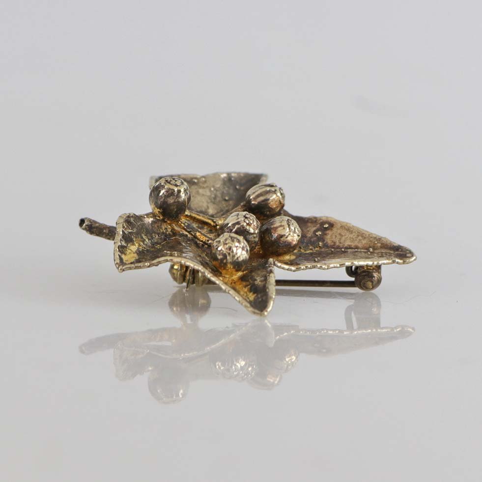 Broche i forgyldt sterling sølv formet som et trefingeret blad med fem bær