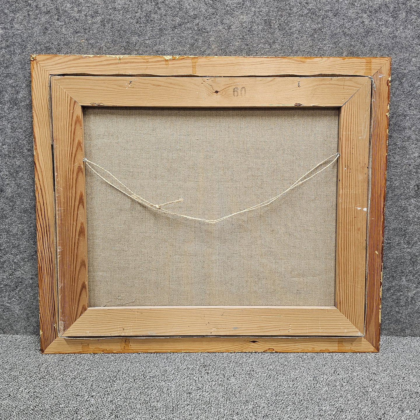 Maleri af olie på lærred. Motiv af hvide hus, gult hus og et rødt hegn