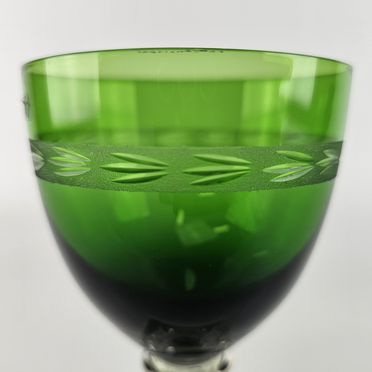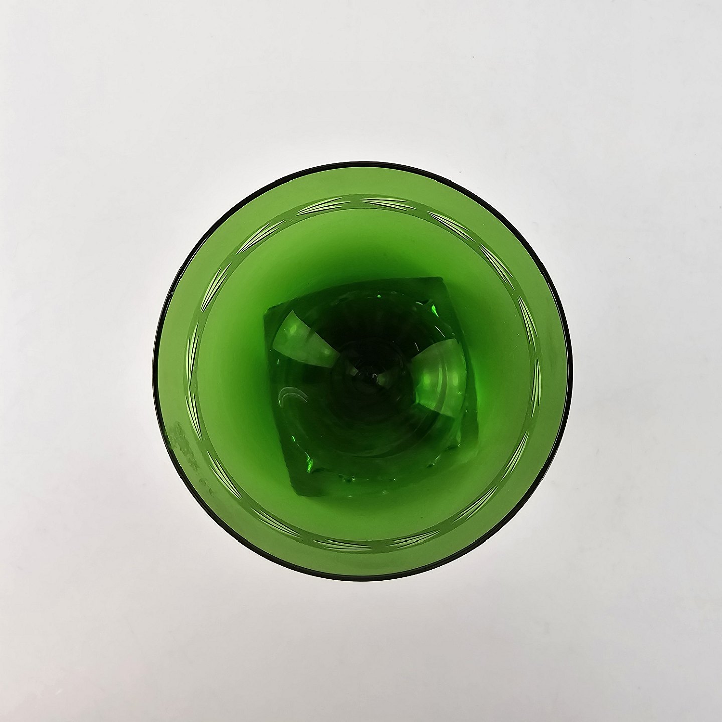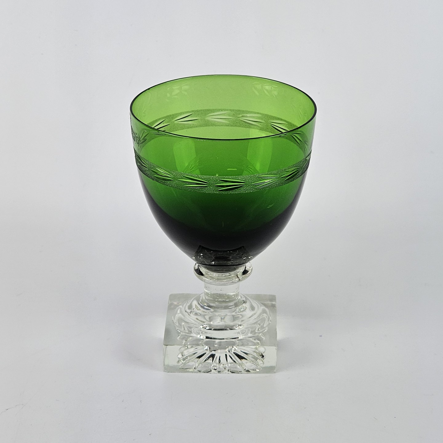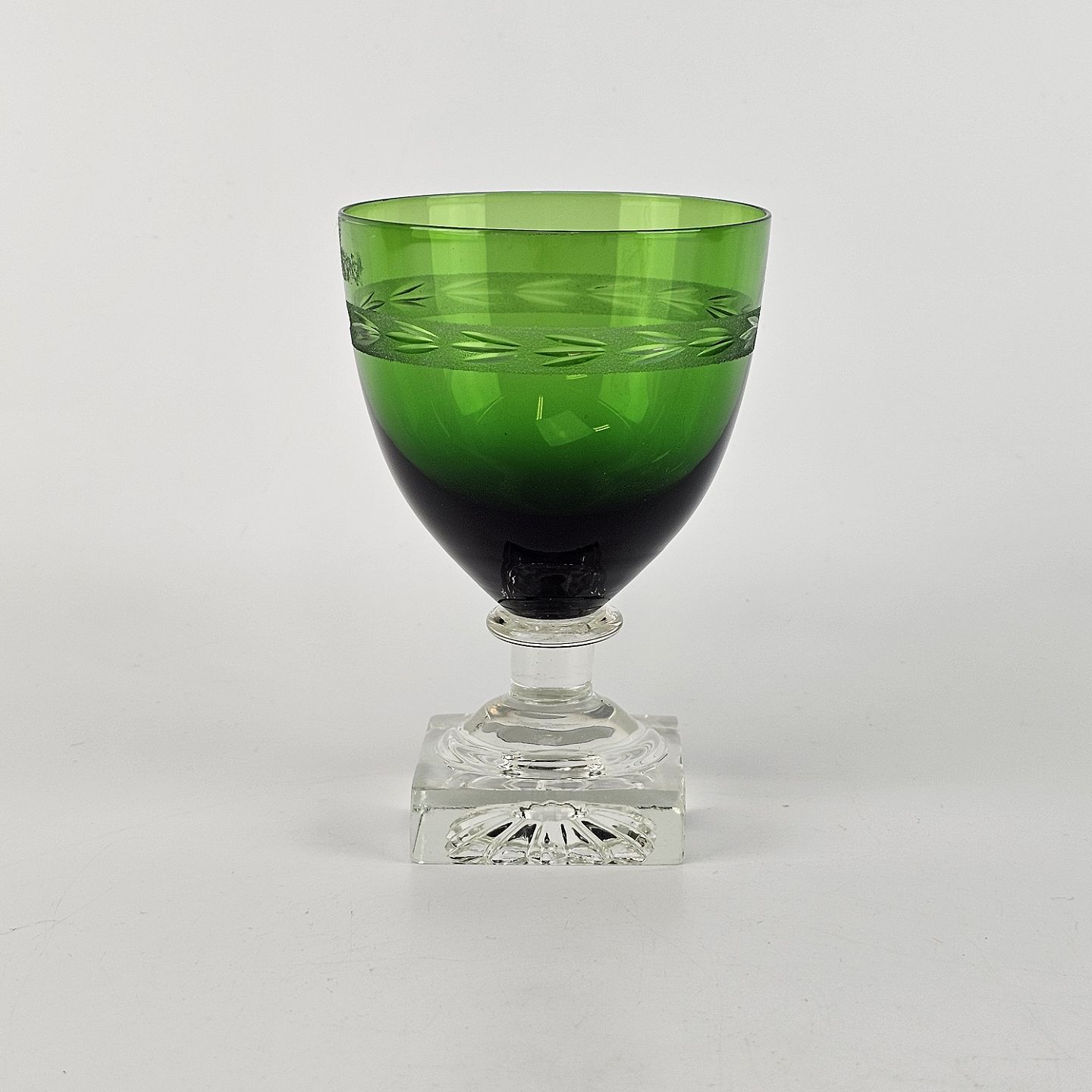 Grønt glas med firkantet fod i klar glas. Pyntet med slebet bånd af blade. Gorm den gamle glas grundform