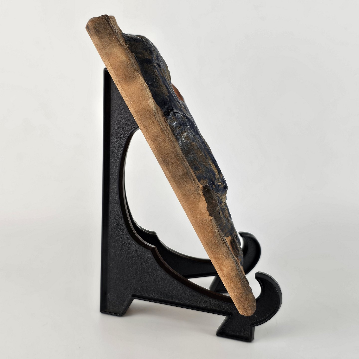 Relief med brun baggrund og to blå fugle, der kigger på hinanden