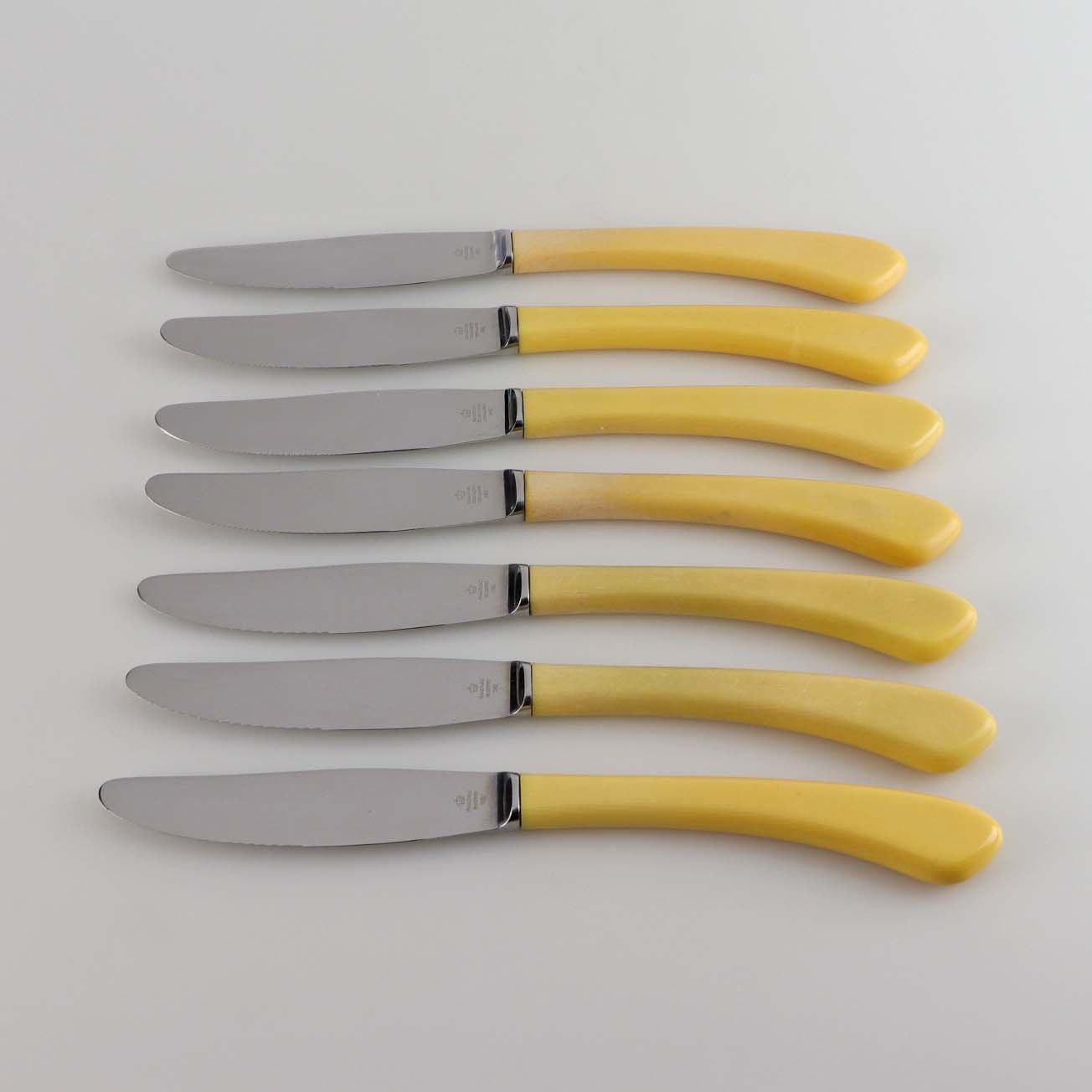 Syv knive med skæfte af kunststof med farven perlemor og knivsblad i rustfrit stål