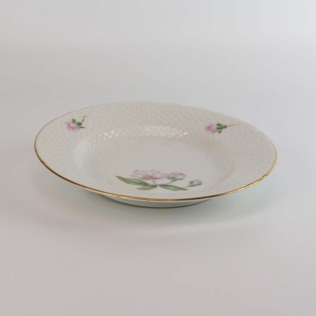 Anemone Macbeth er af hvidt glaseret porcelæn, dekoreret med håndmalede lyserøde anemoner og gylden kant
