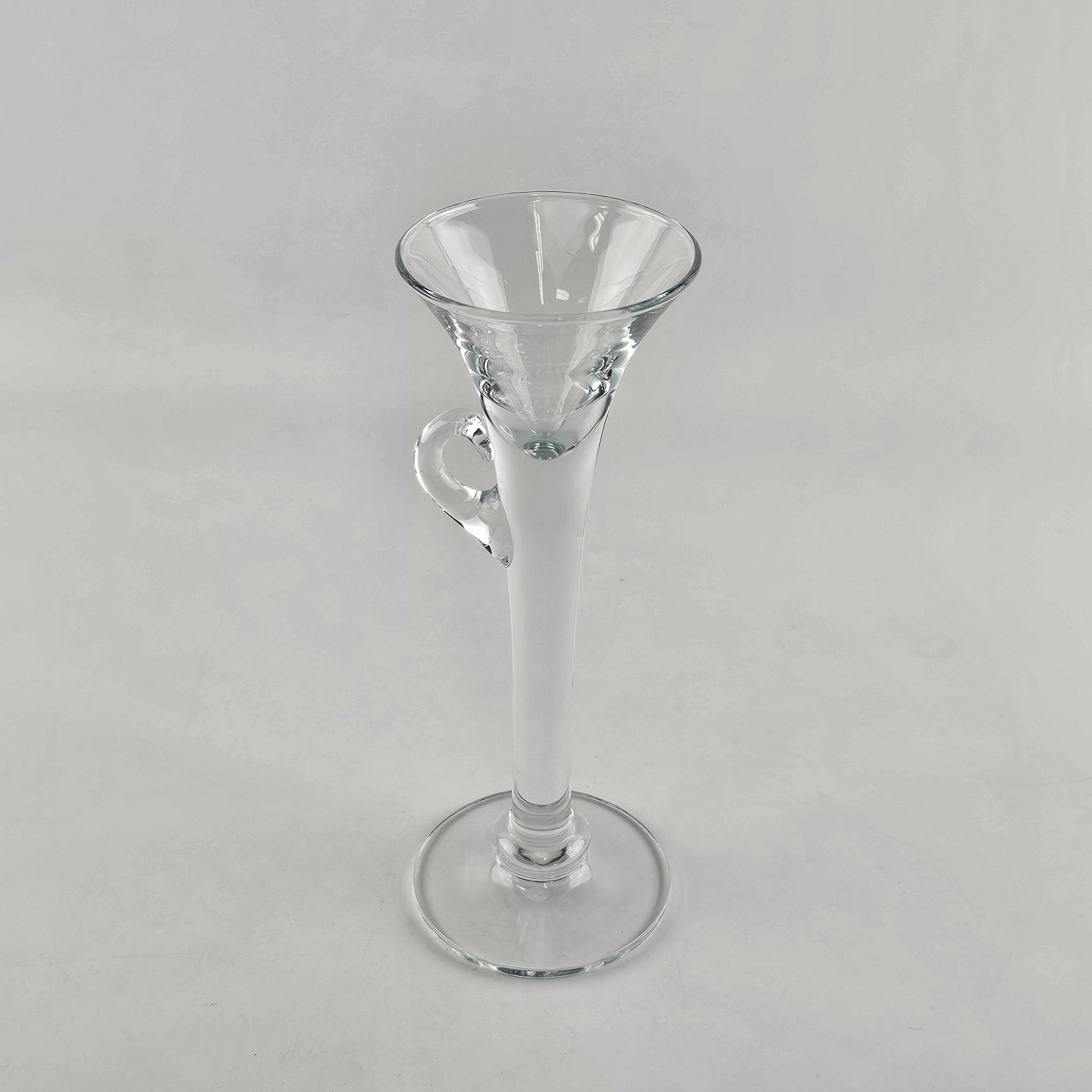 Højt snapseglas fra 1977 i klart glas fra serien Snapse doctor med titlen Hjertestyrkning.