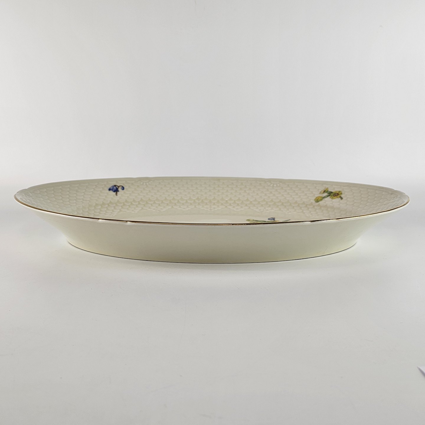 Njal er af creme farvet glaseret porcelæn, præget med skæl lignende mønster. Stellet er dekoreret med gul og blå blomster samt mønster af guld i kanten. Lettere brugsspor kan forekomme