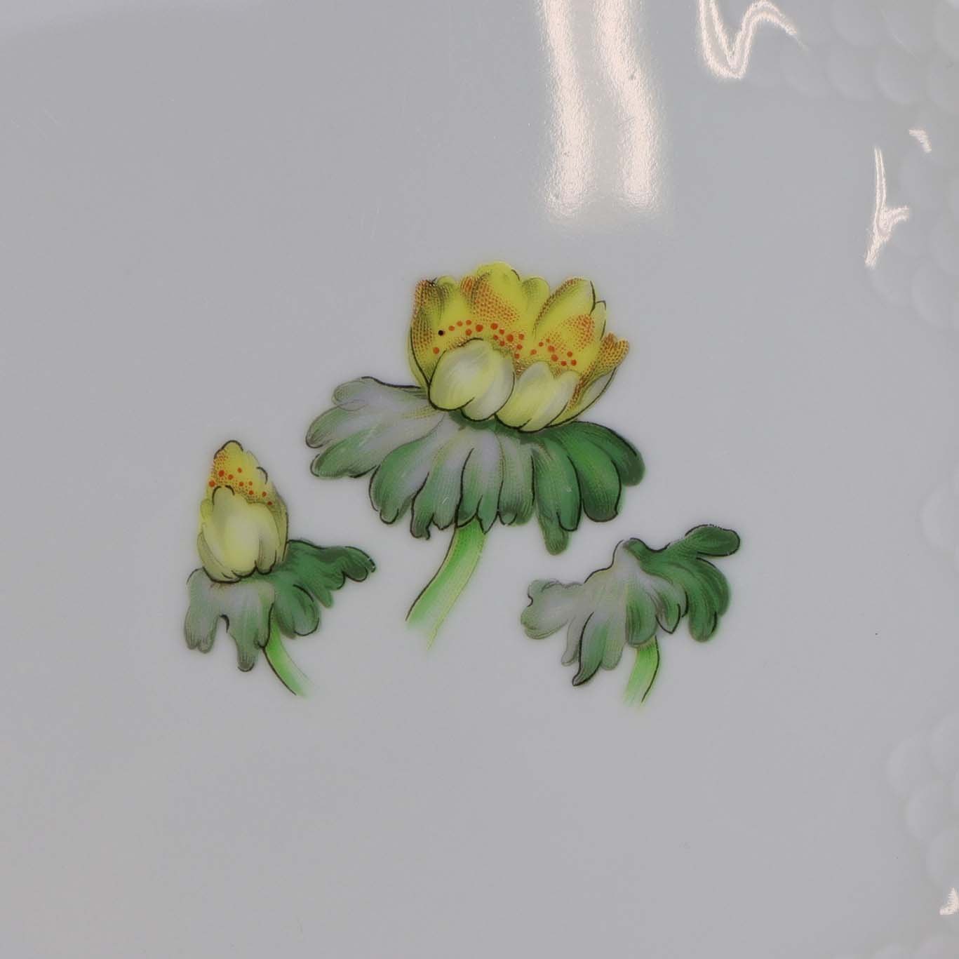 Hvidt porcelæn i skælform med dekoration af gule blomster og guldkant