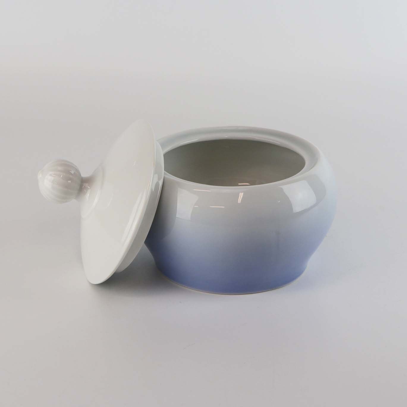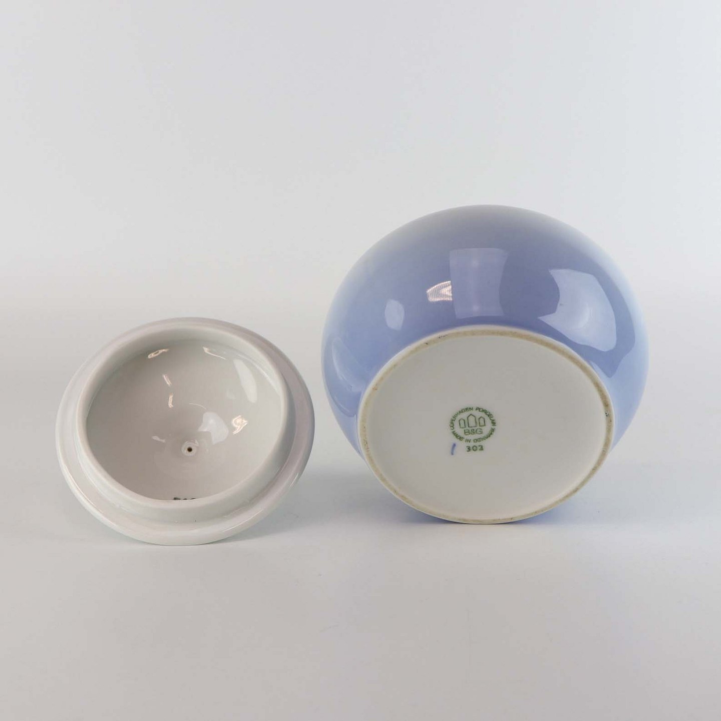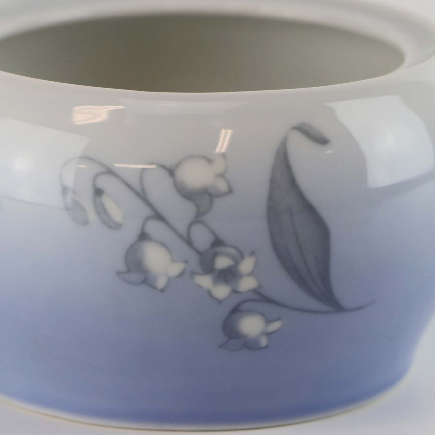 Stellet er fra 1970 og udformet i glat porcelæn med gradueret blålig tone samt motiv af en liljekonval.