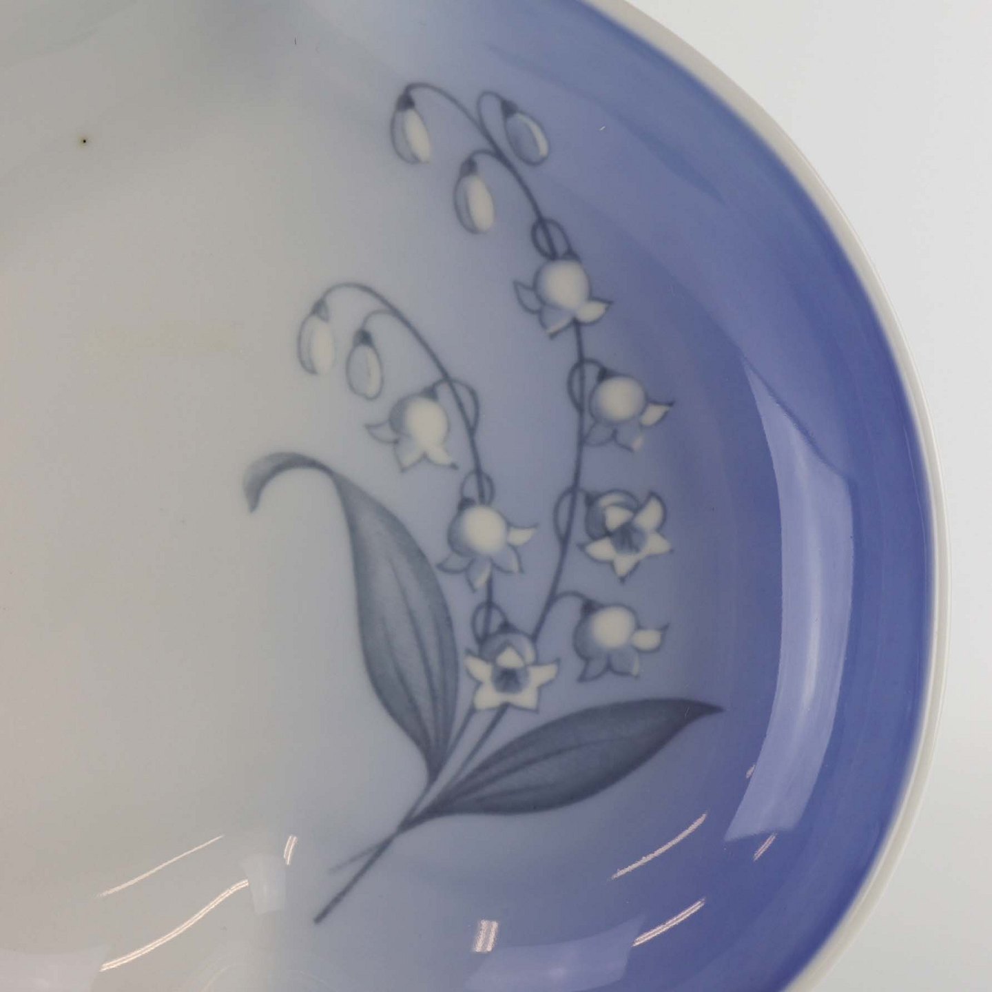 Stellet er fra 1970 og udformet i glat porcelæn med gradueret blålig tone samt motiv af en liljekonval.