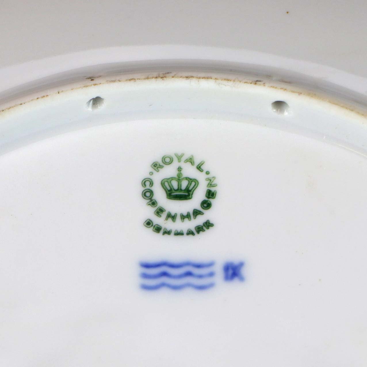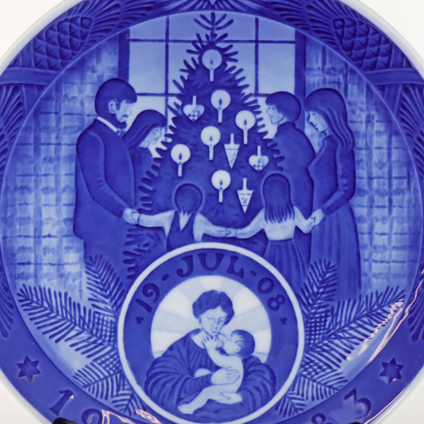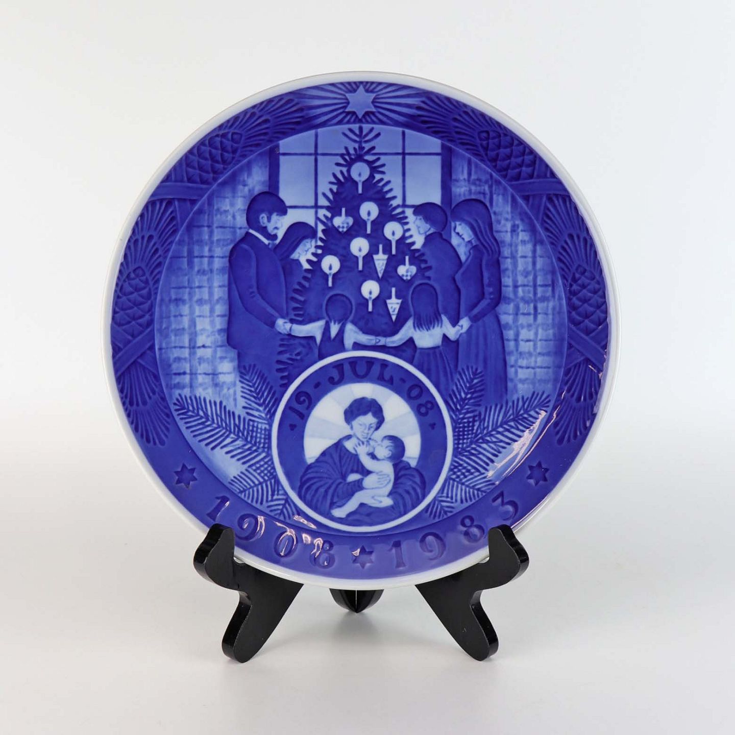 Kongelig platte i porcelæn med motiver af to juleplatter samlet i én. Juleplatte år 1908 med Jomfru Maria og barnet, samt julemotivet fra år 1983 glade jul