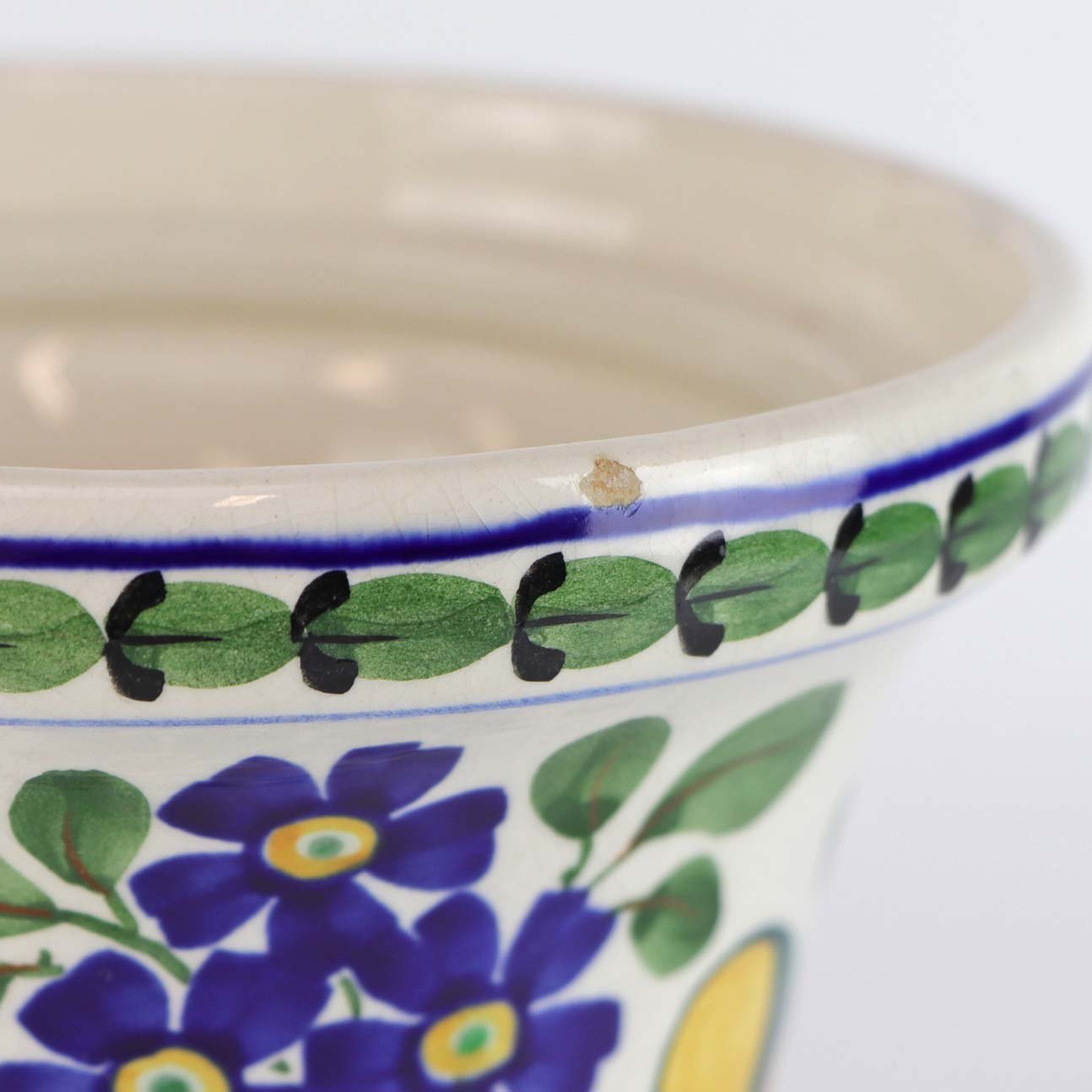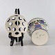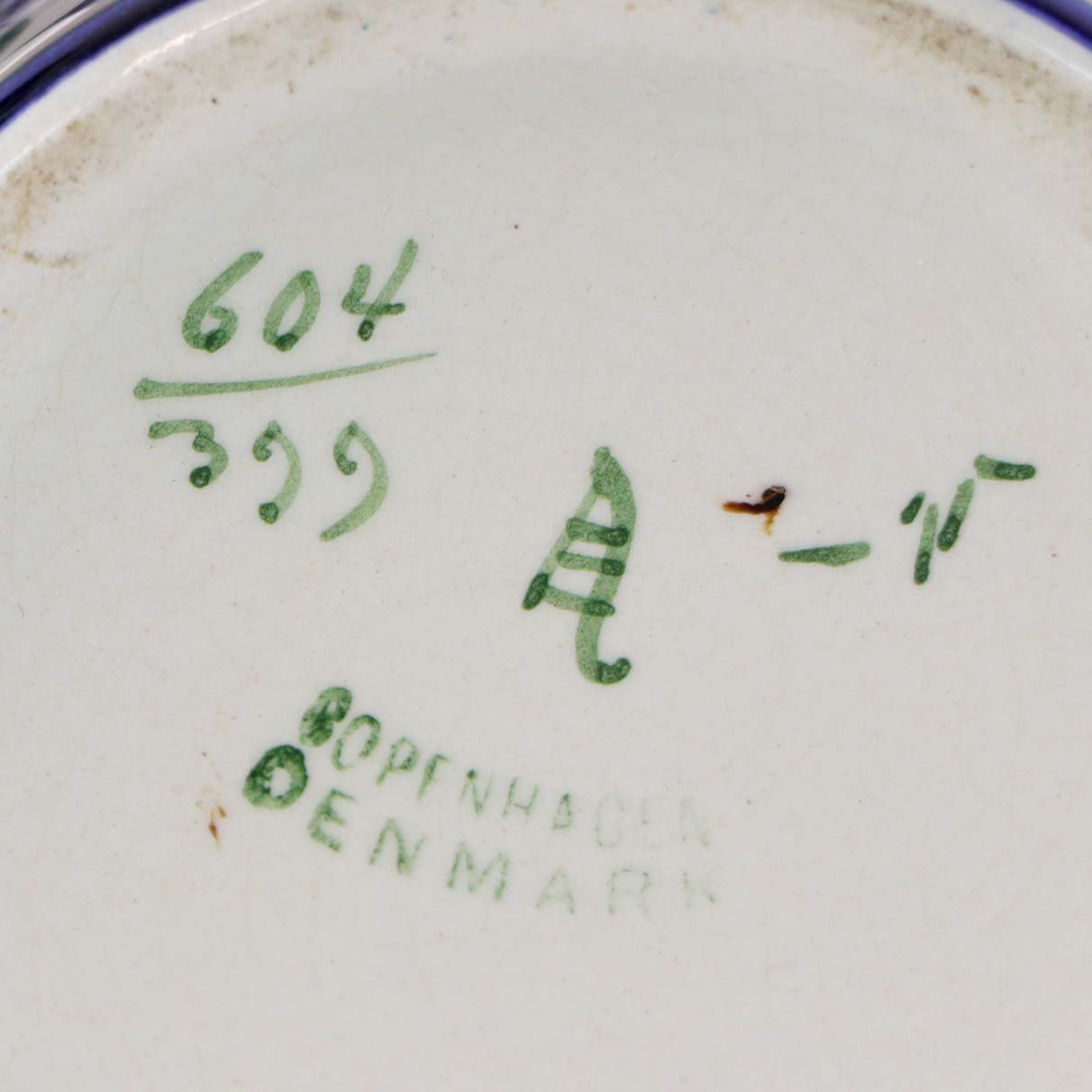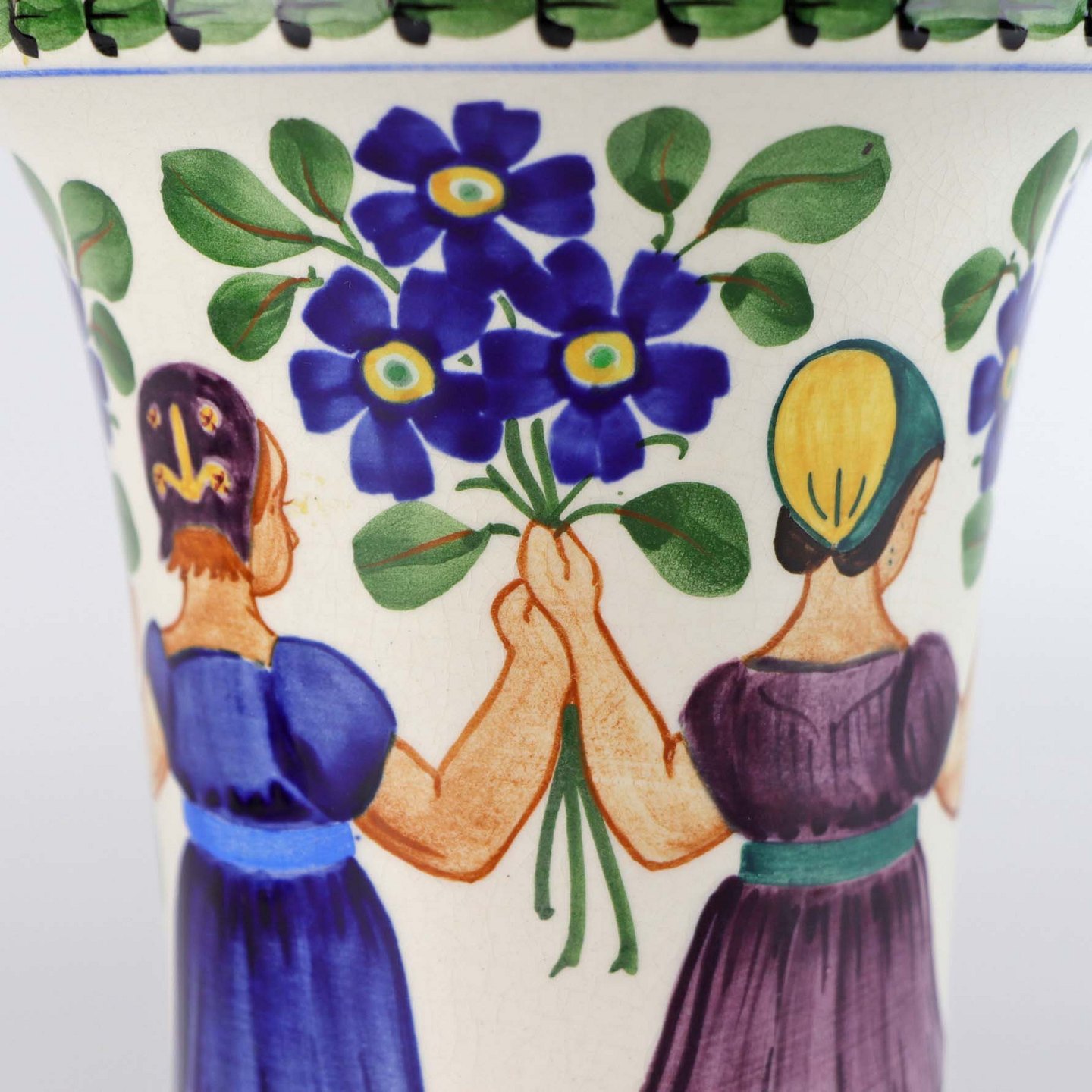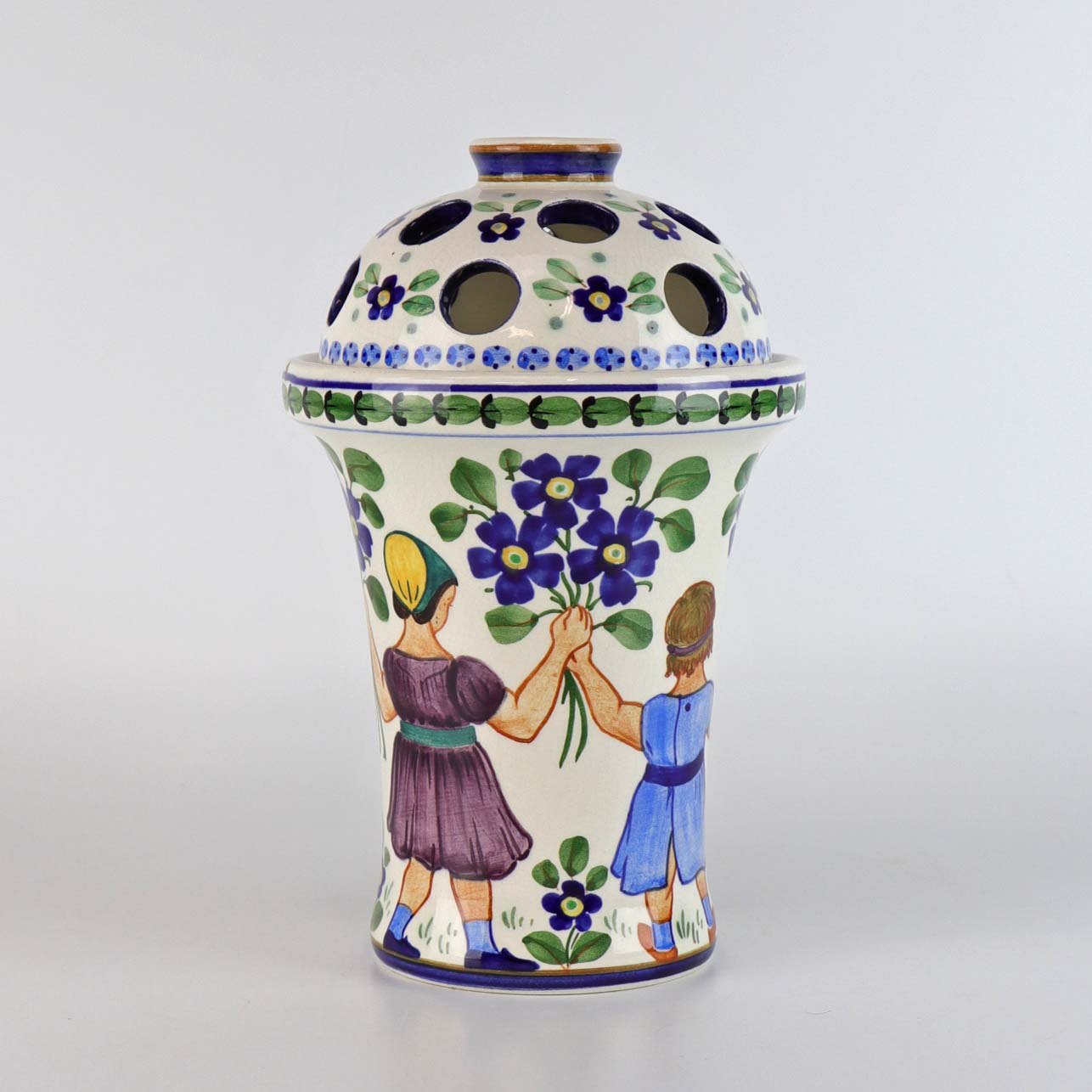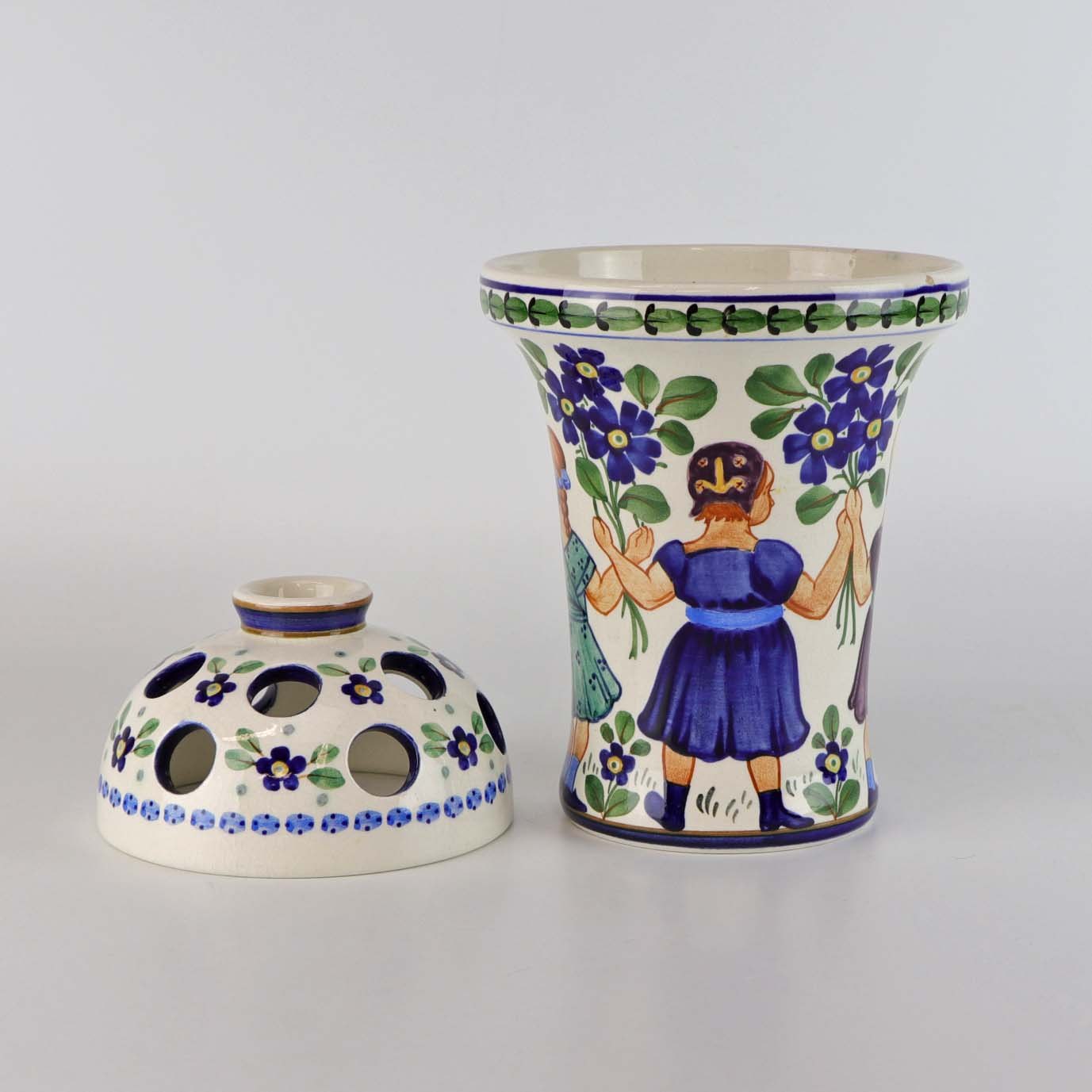 Vase med låg i fajance og motiv af dansende børn, som holder buketter af blå blomster i hænderne. Nr. 604/399