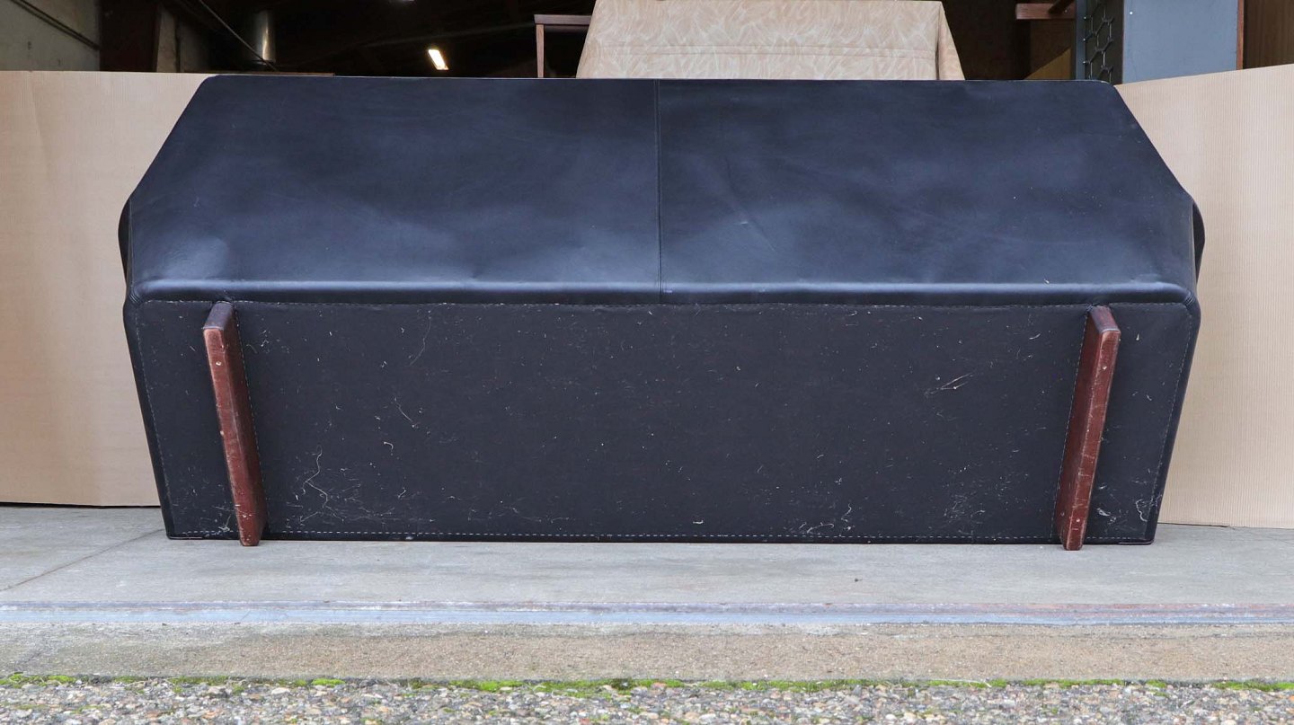 Fire personers sofa beklædt med sort læder monteret på ben af mørkt træ