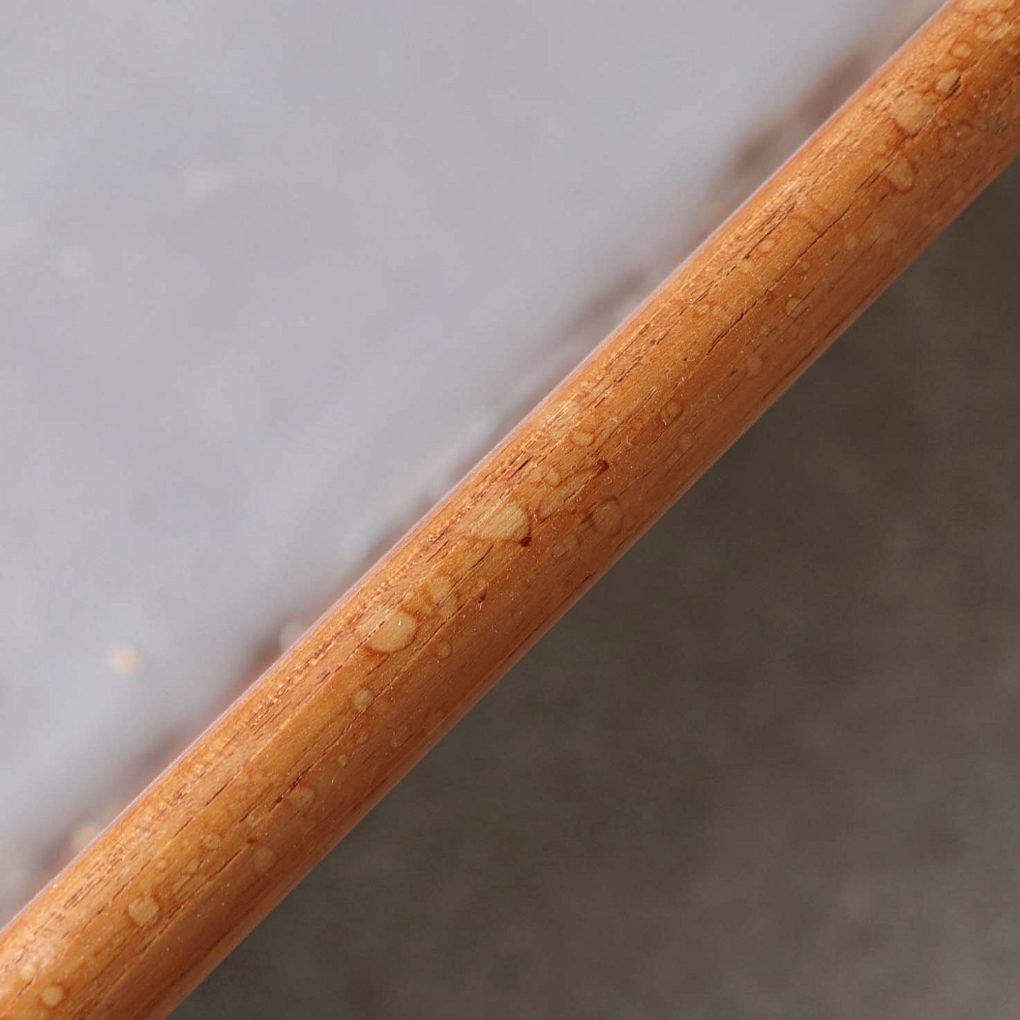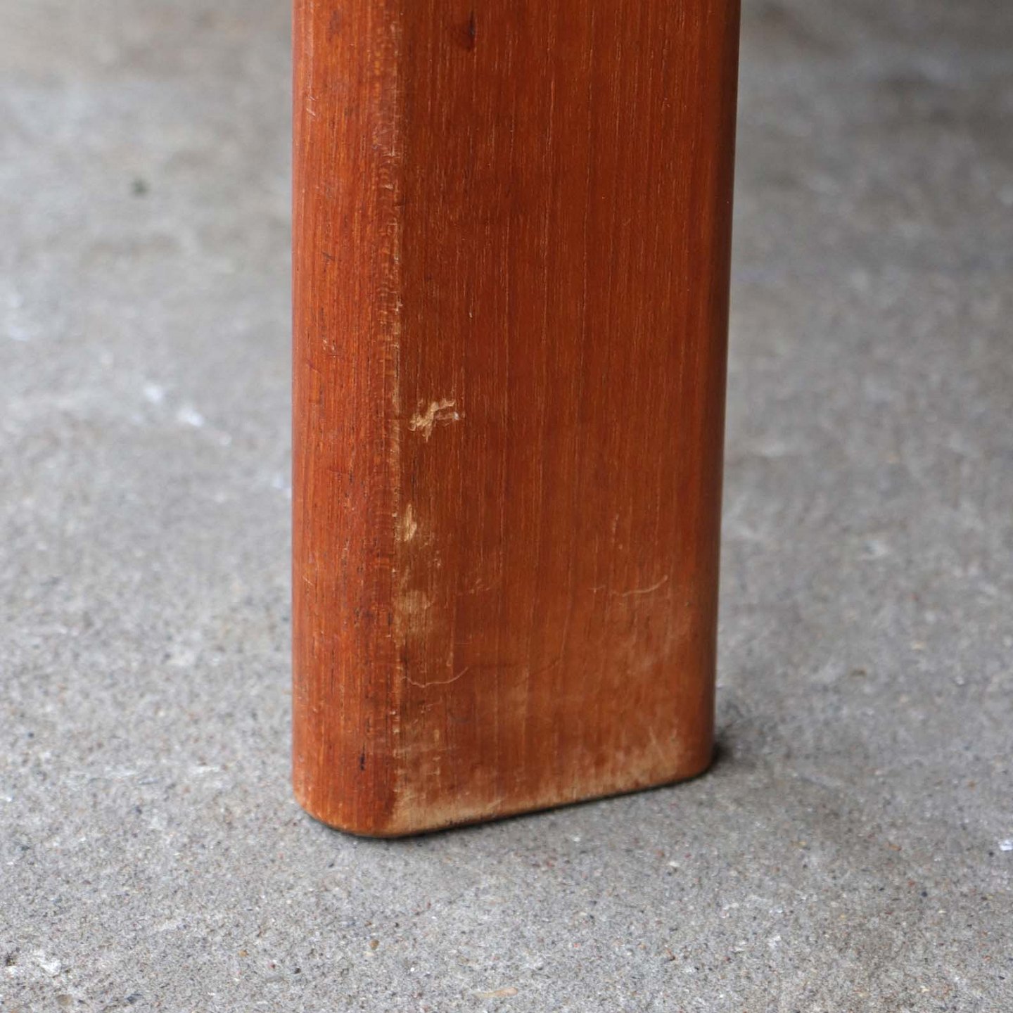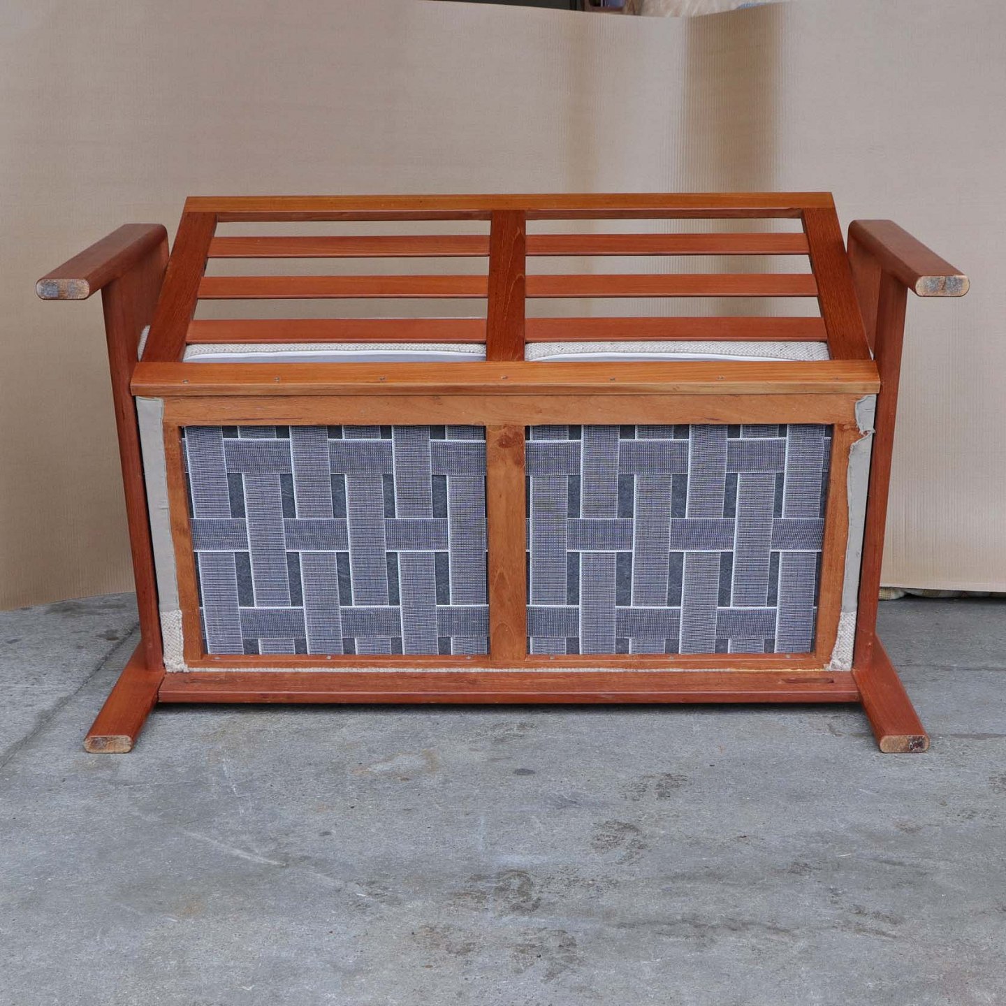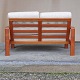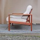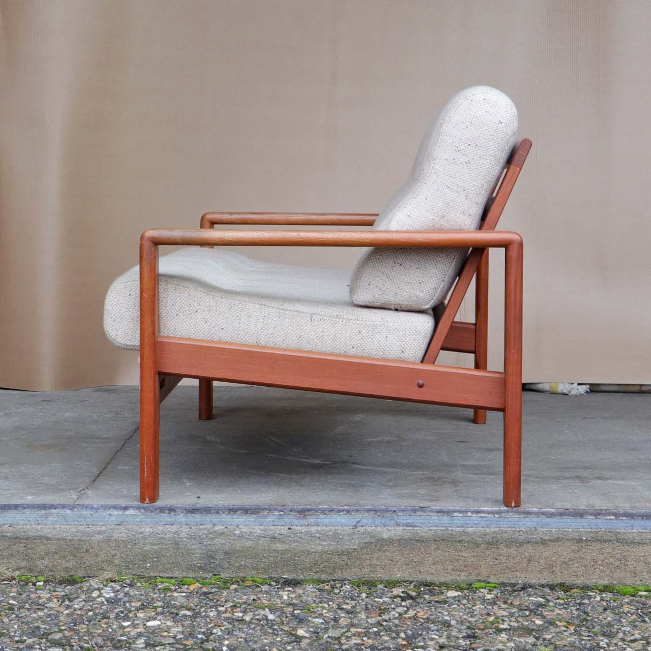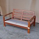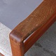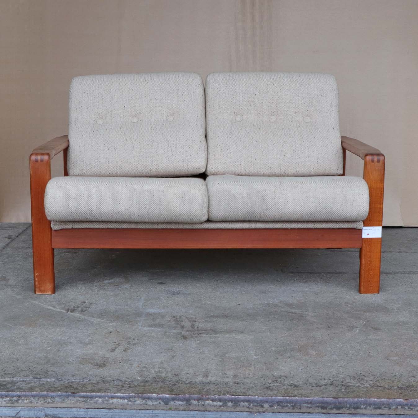 To personers sofa med stel i lakeret teaktræ og hynder betrukket med lyst uld stof.