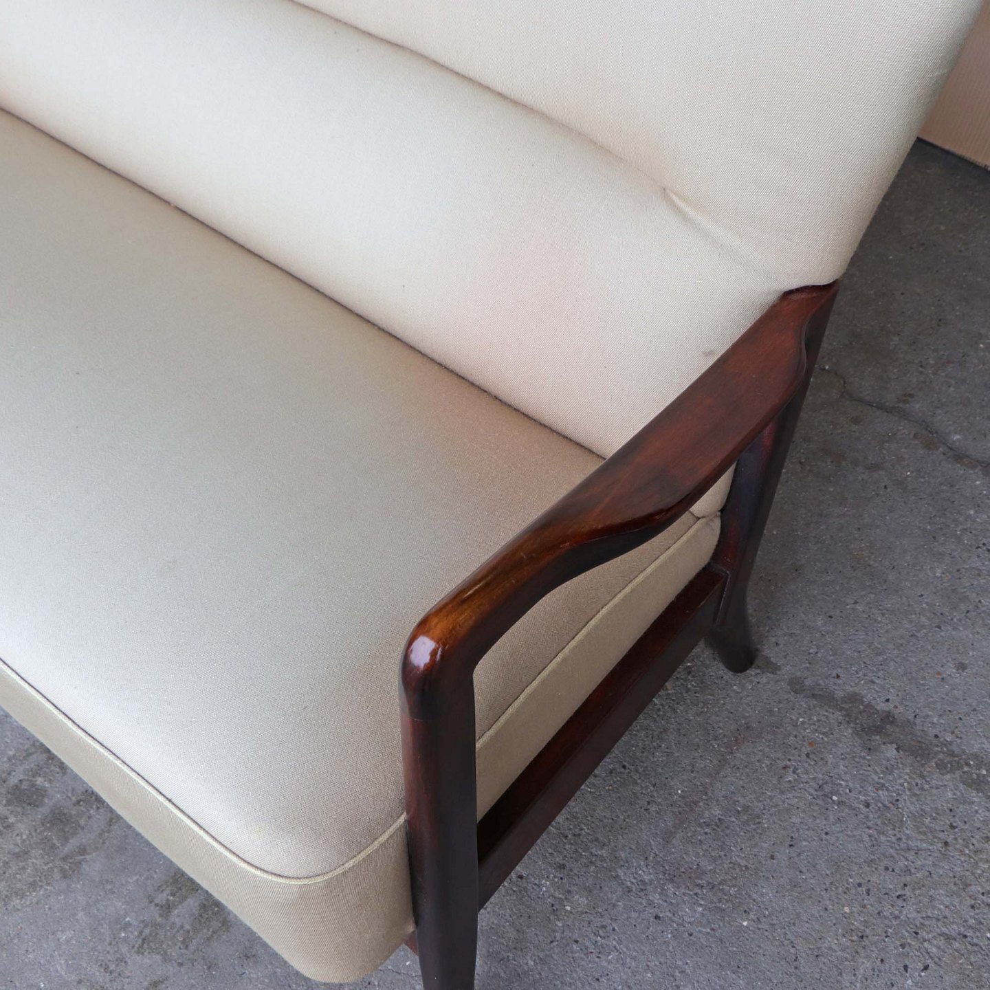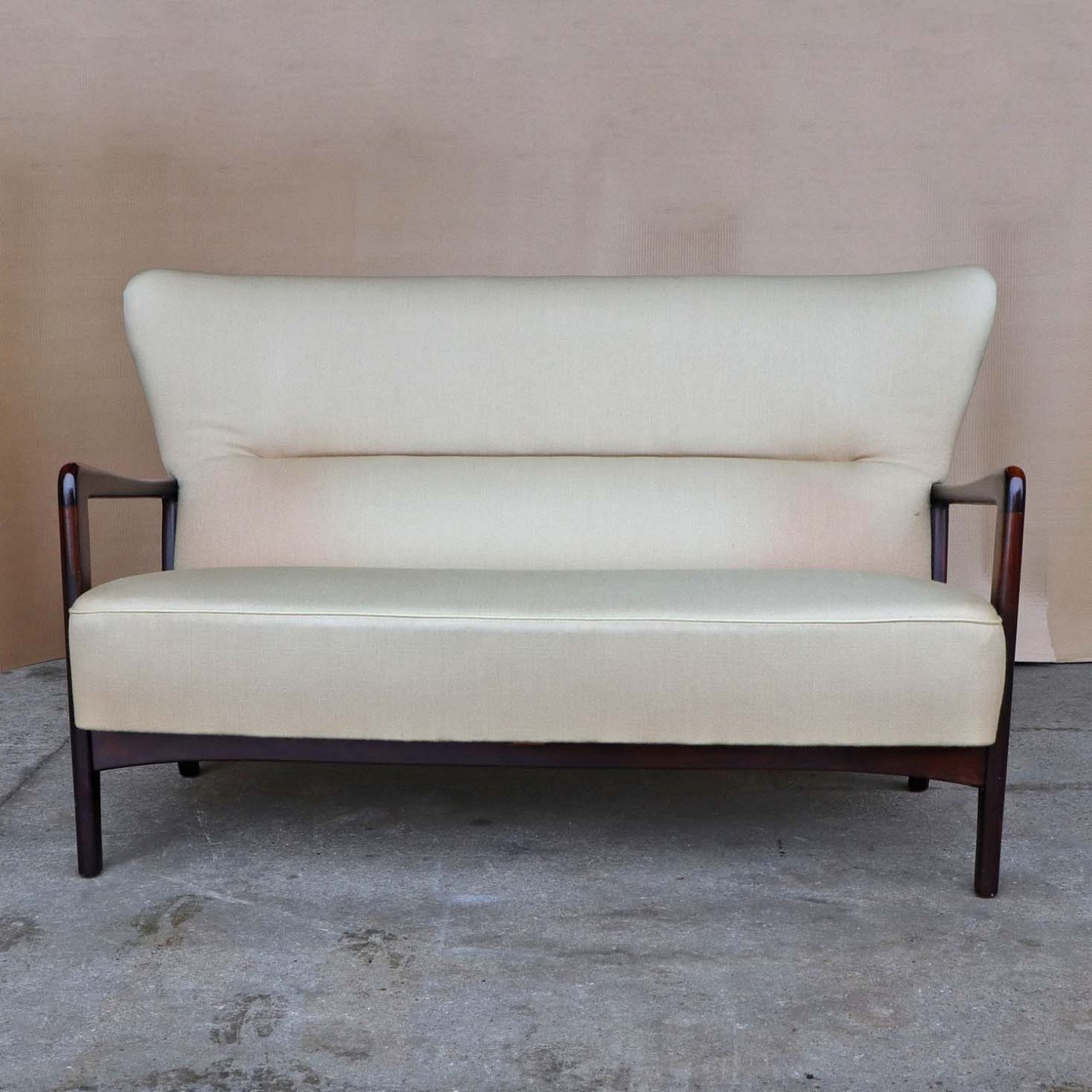 To personers sofa med høj ryg med stel i lakeret og bejset bøgetræ. Sofaen er betrukket med beige uldstof.