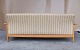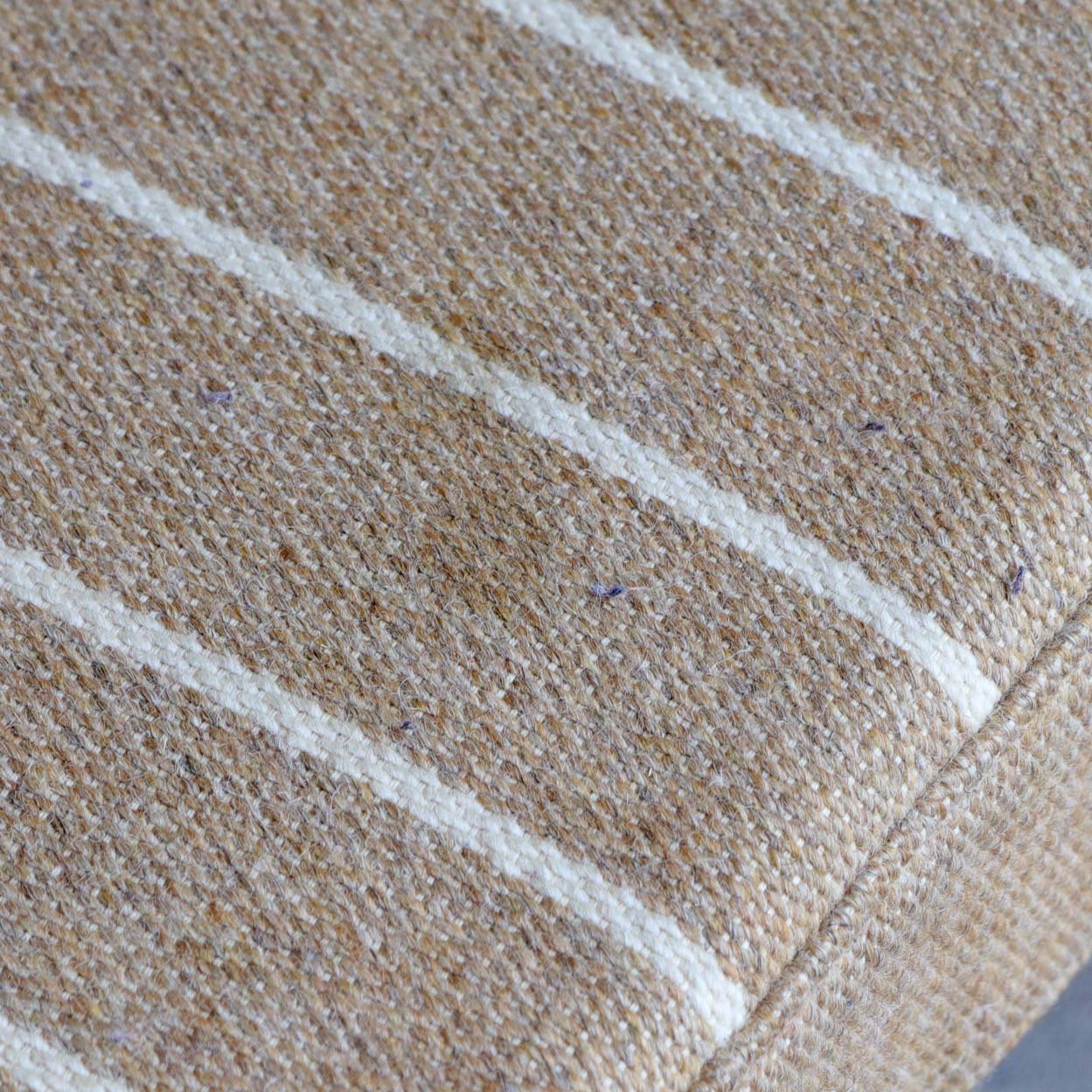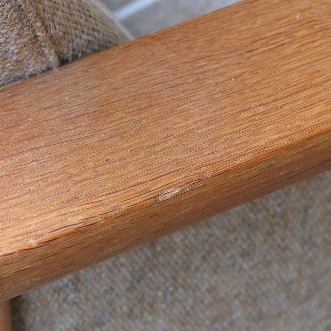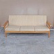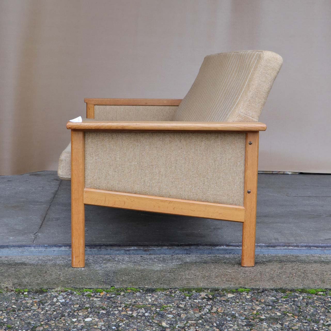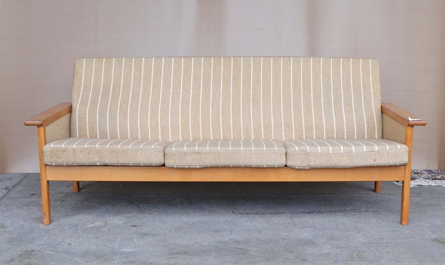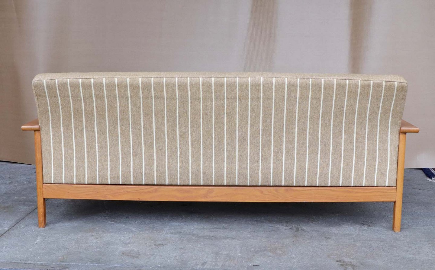 Tre personers sofa med stel i lakeret egetræ. Sofaen er betrykket med stribet meleret uldstof i farven mørk beige
