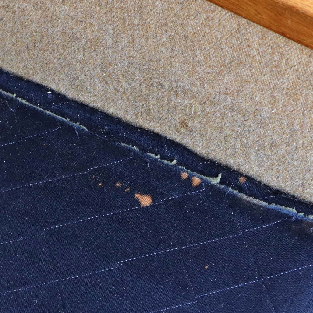 Fremstår med brugsspor på stel og stof. Trænger til ompolstring.
