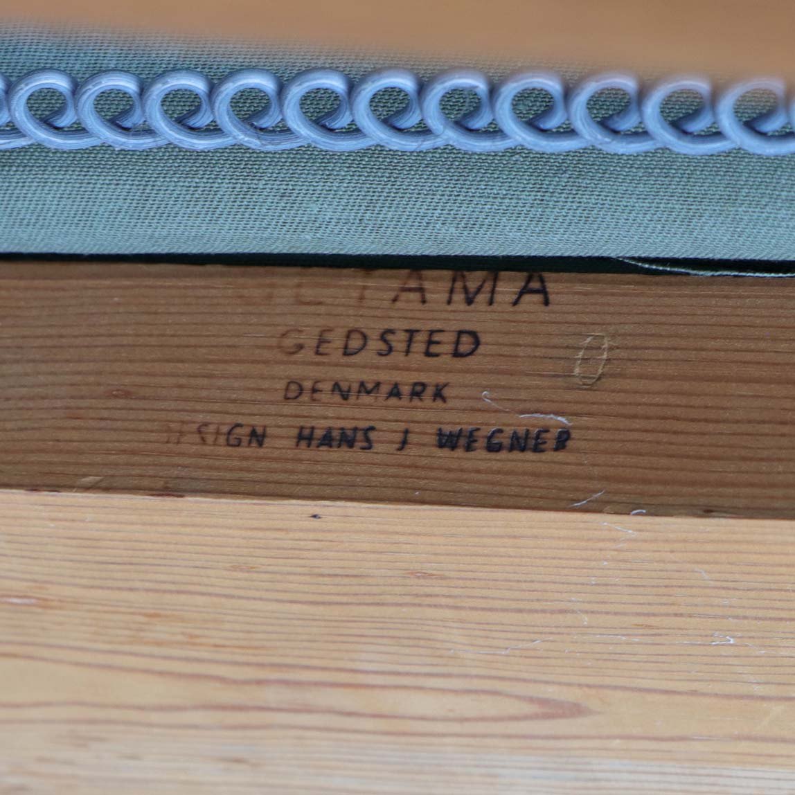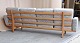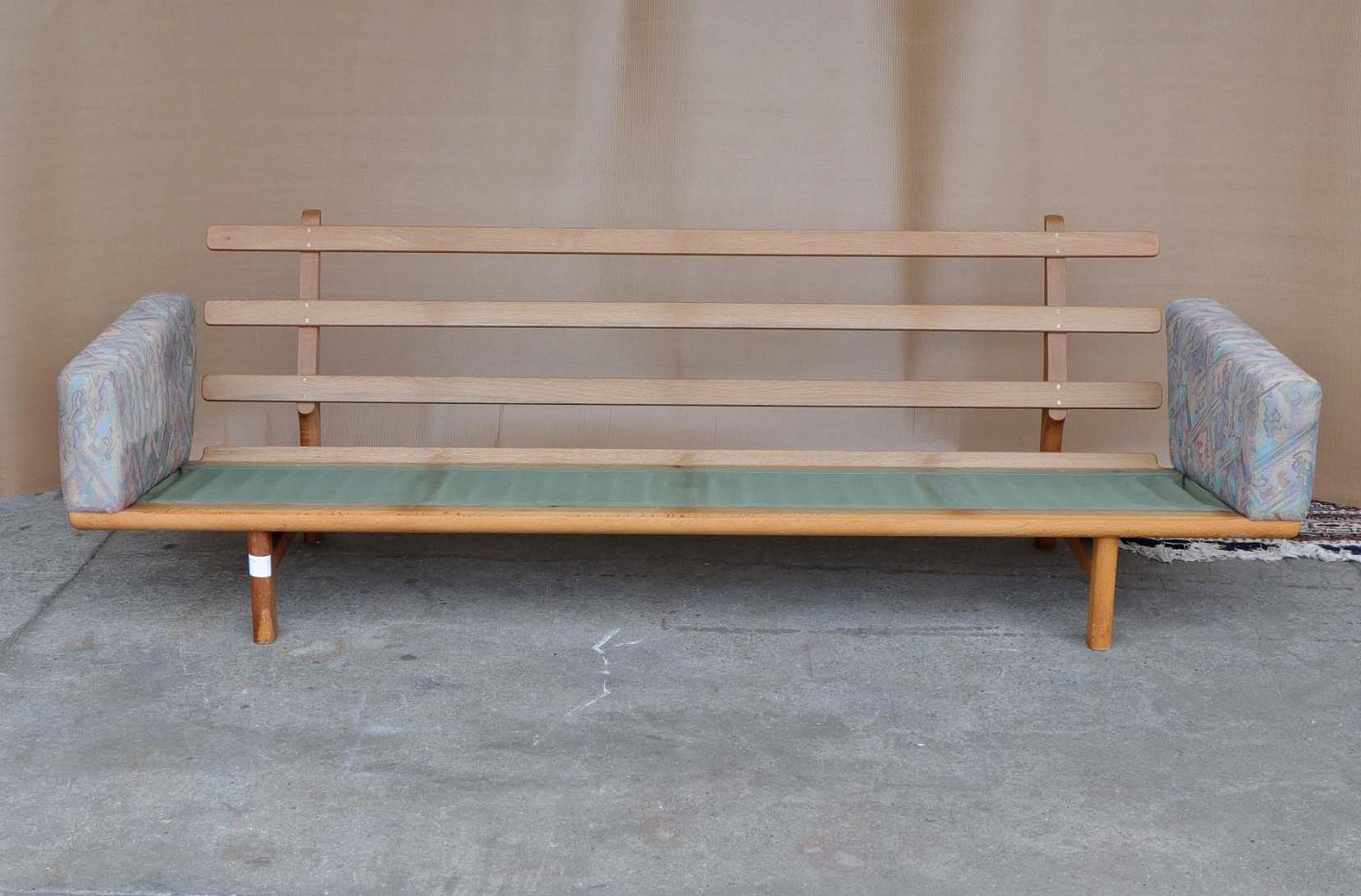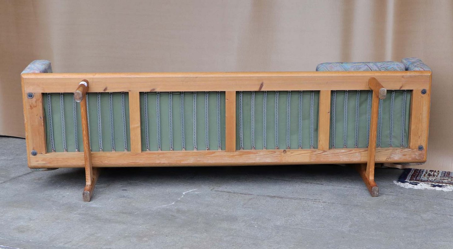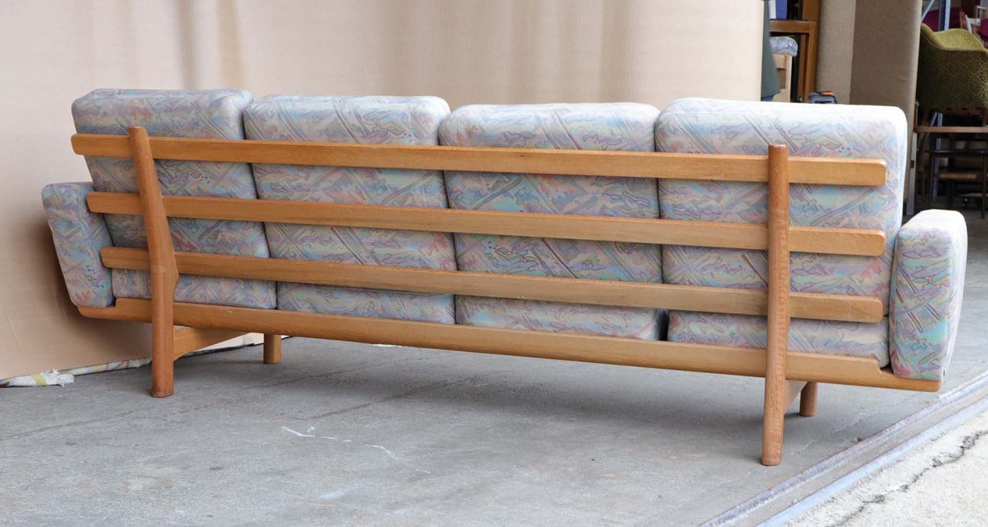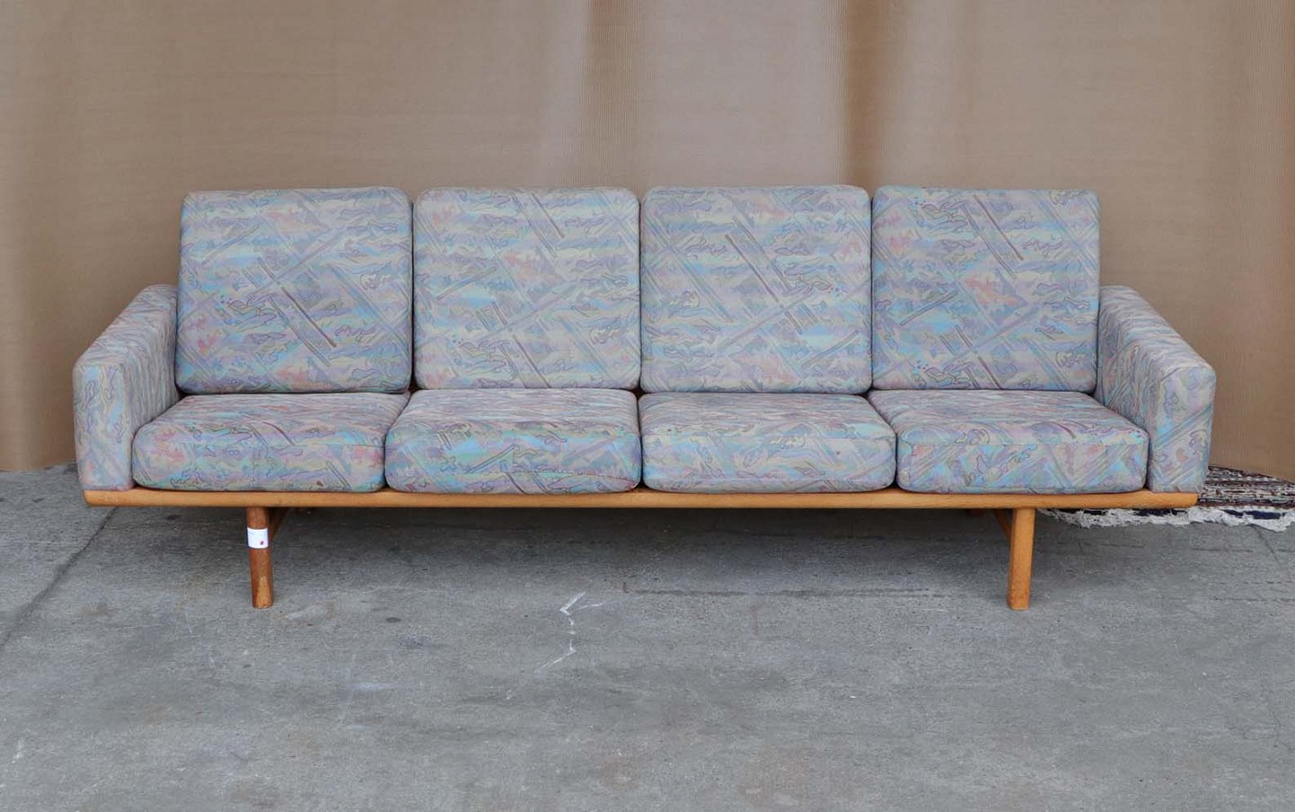 Fire personers sofa med stel i egetræ og hynder med springfjeder, som er betrukket med lyst uldstof. Model GE-236