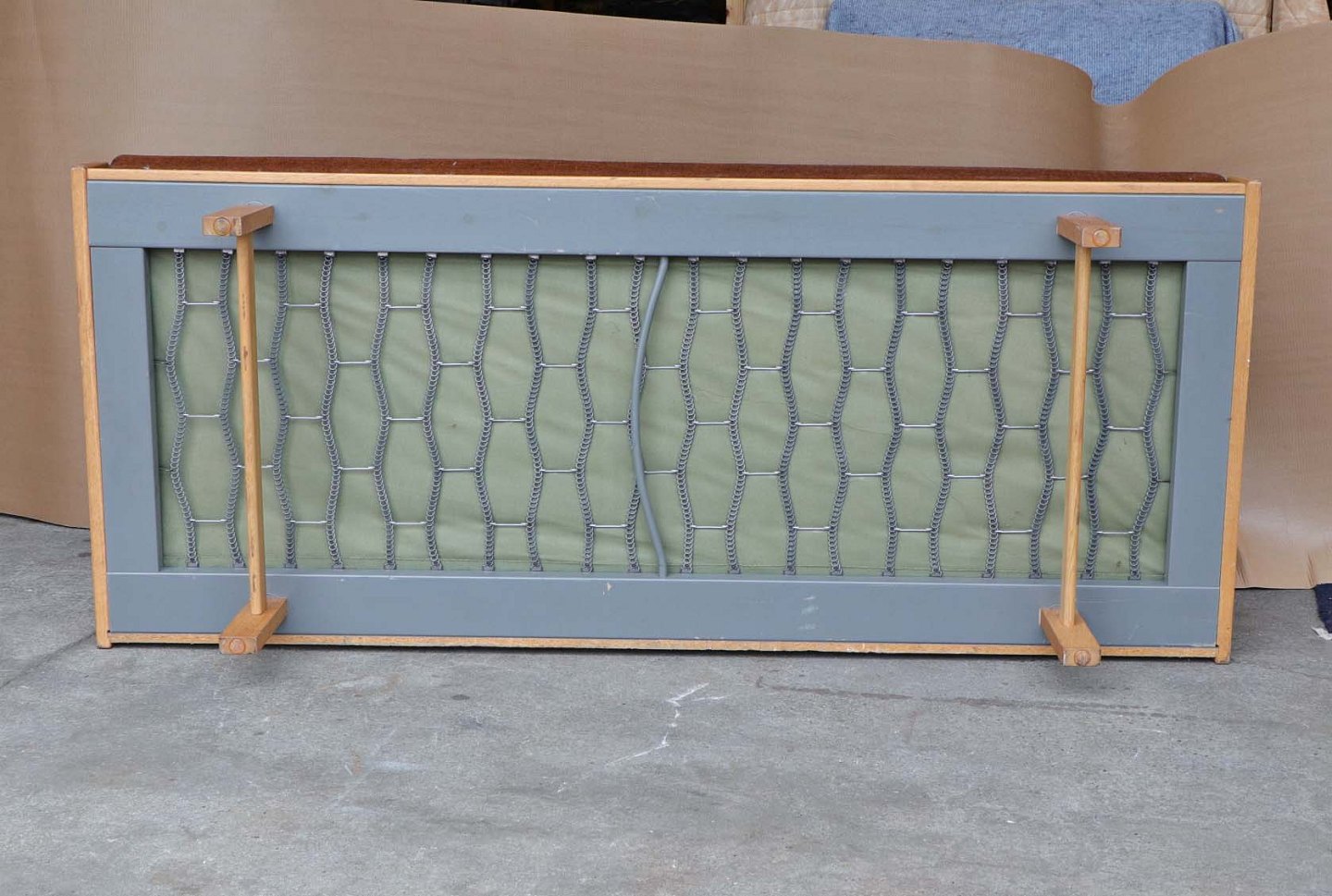 Tre personers sofa med stel i lakeret egetræ. Sæde og ryglæn er betrukket med meleret brunt uldstof. Model GE 258