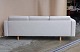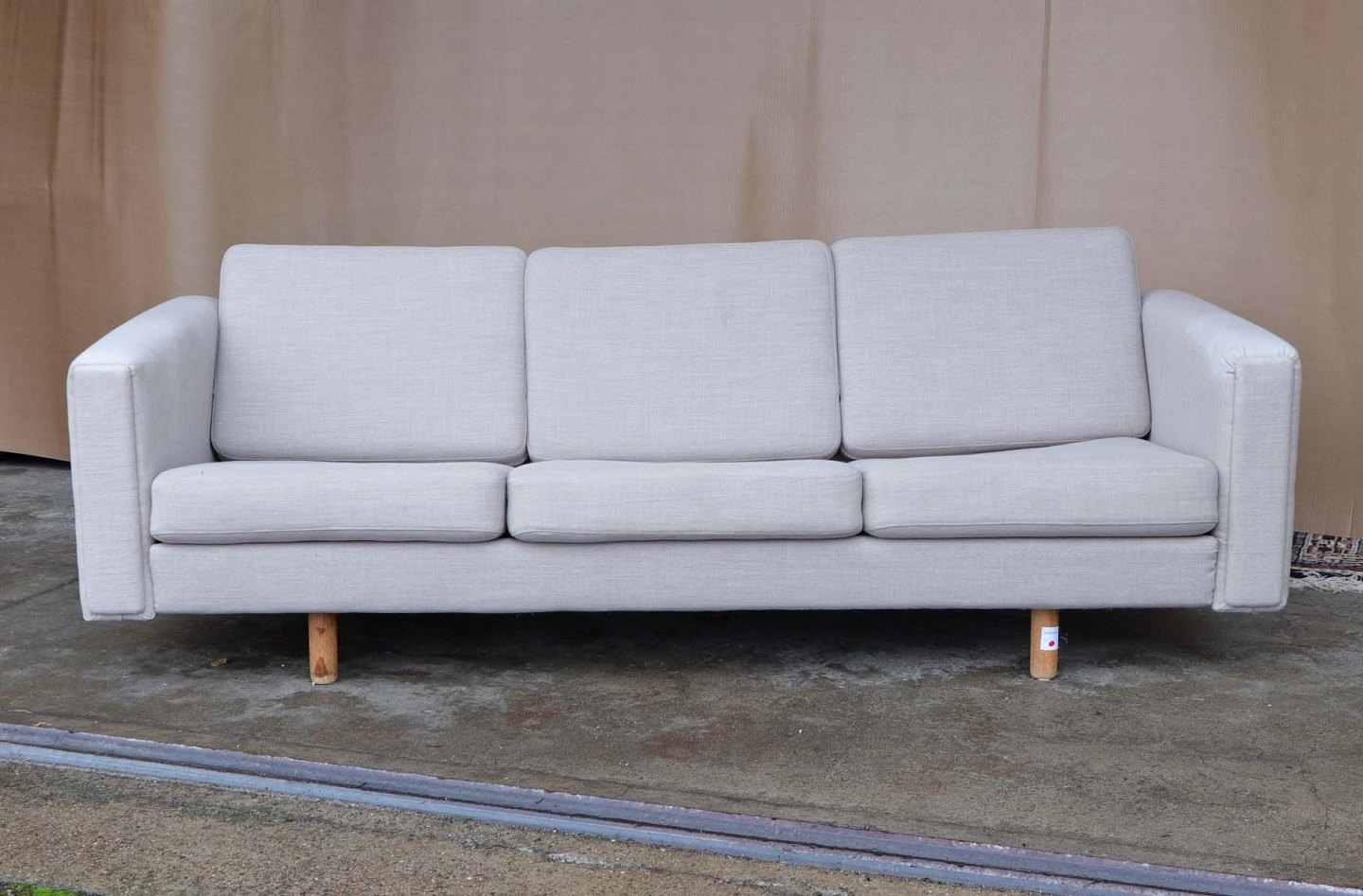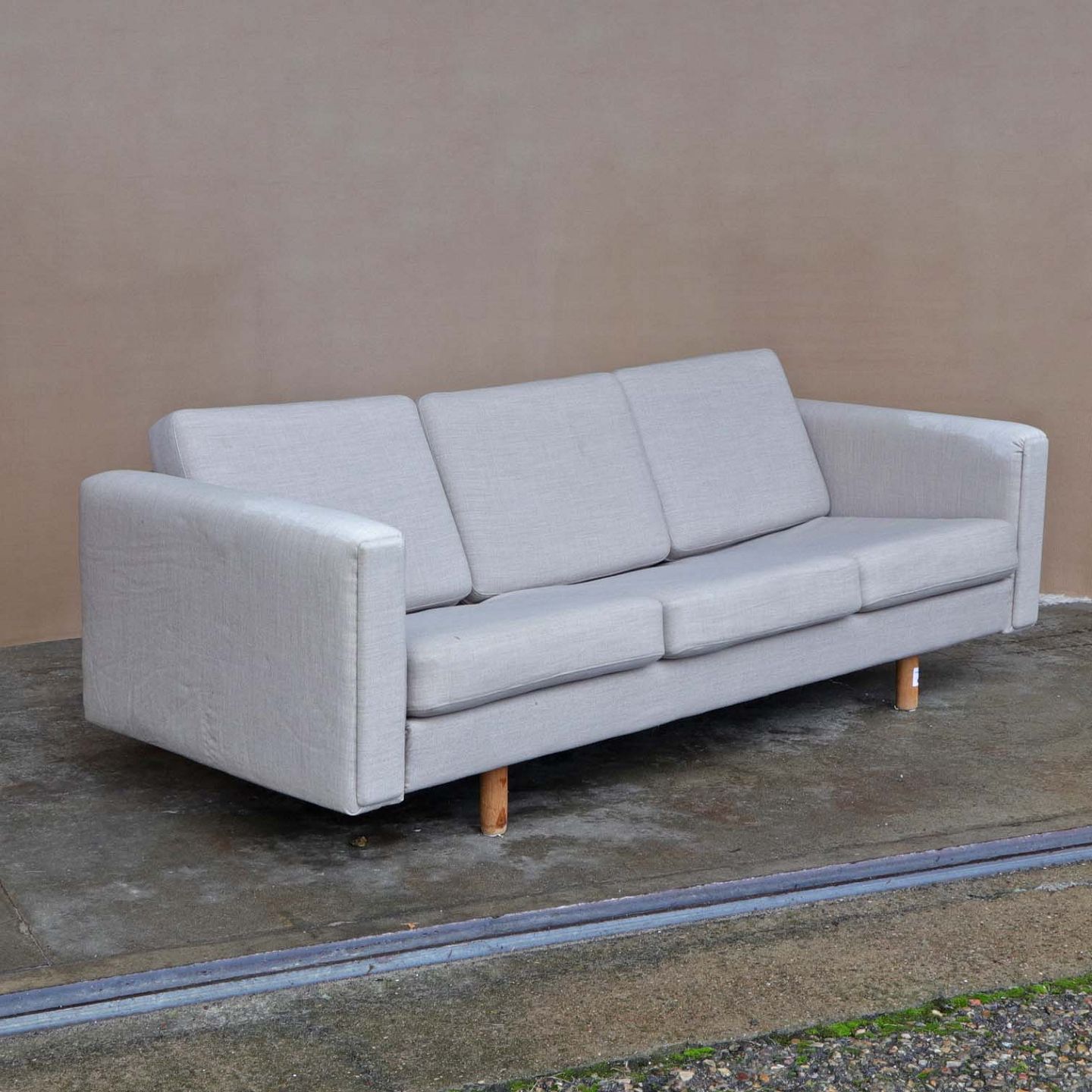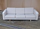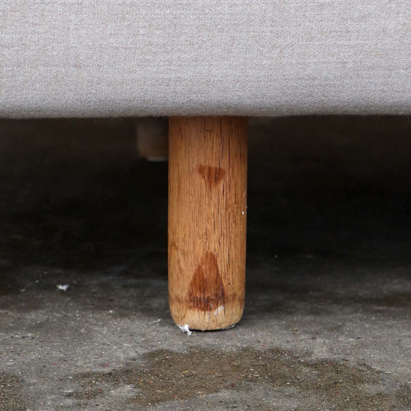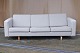 Tre personers sofa med ben i egetræ og hynder med springfjeder, som er betrukket med lyst uldstof. Model GE-300