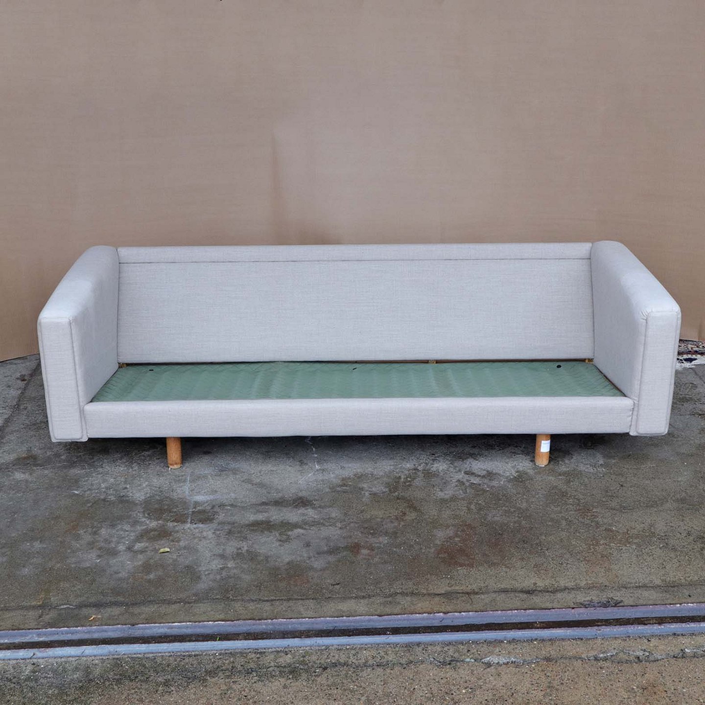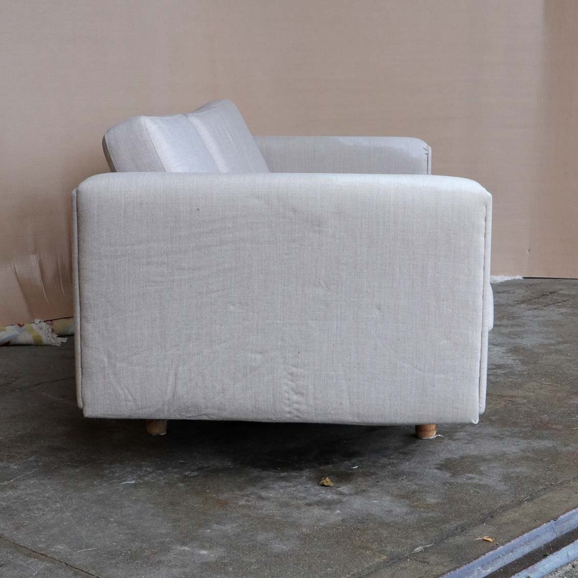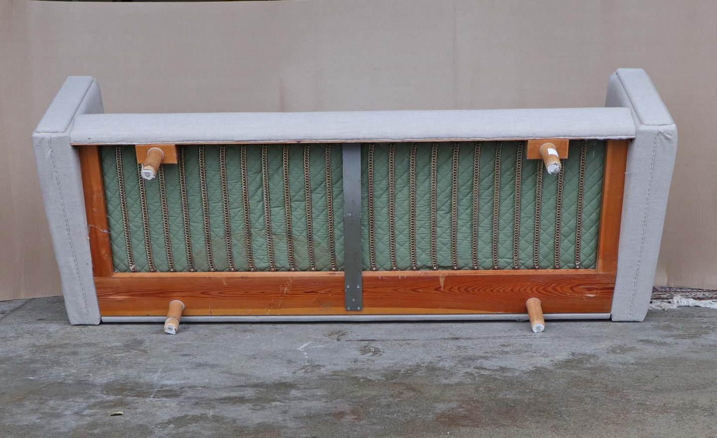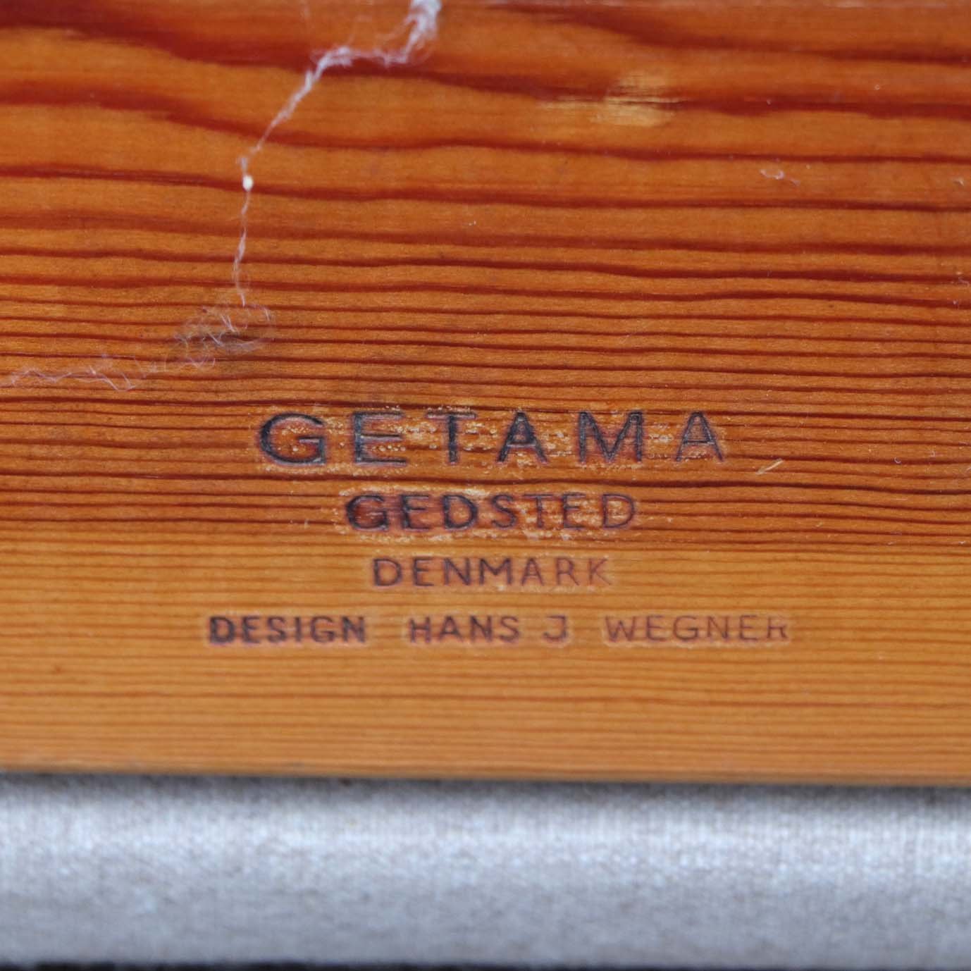 Tre personers sofa med ben i egetræ og hynder med springfjeder, som er betrukket med lyst uldstof. Model GE-300