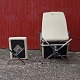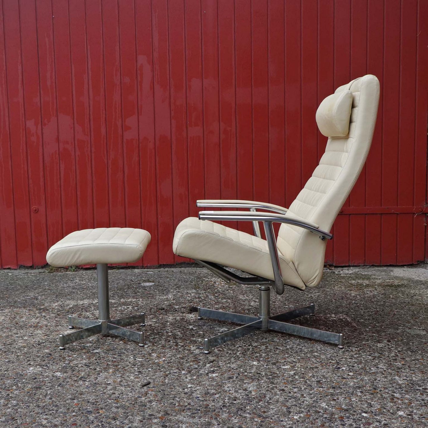 Lænestol med skammel og nakkepude samt stel i forkromet metal. Stol og skammel er betrukket med råhvid læder. Stolens ryg kan ligges ned.