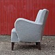 Lænestol med springfjeder sæde og ben i lakeret mørkt træ. Stolen er betrukket med lysegrå uldstof.